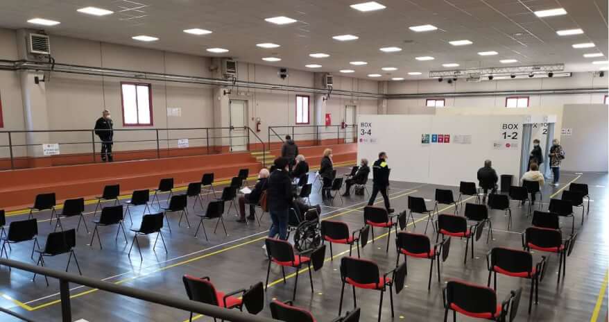 All’interno sono state ricavate un’area per il triage (misurazione temperatura e disinfezione delle mani) e per la consegna della modulistica, un’area per l’attesa, 4 box per la somministrazione del vaccino e la zona destinata alla sosta post somministrazione.
