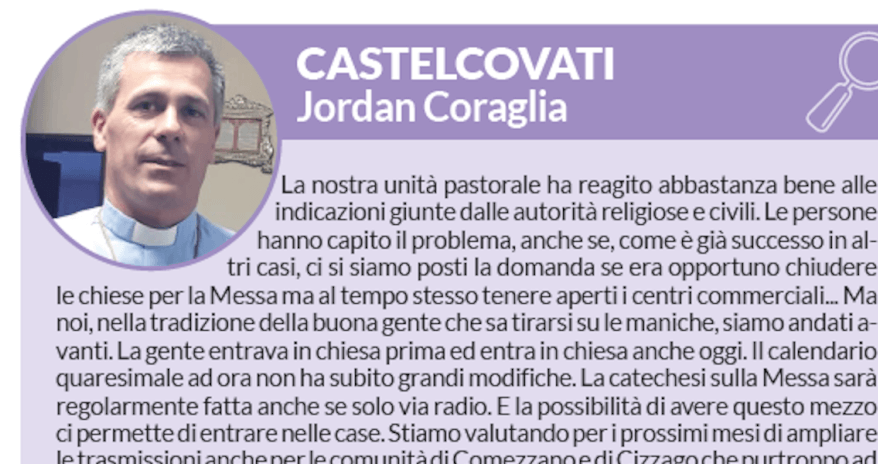Da una parte il senso di disorientamento, dall’altra la fiducia. Il racconto su Voce dei sacerdoti dell’insolito inizio di Quaresima. Il pensiero del parroco di Castelcovati, Comezzano e Cizzago