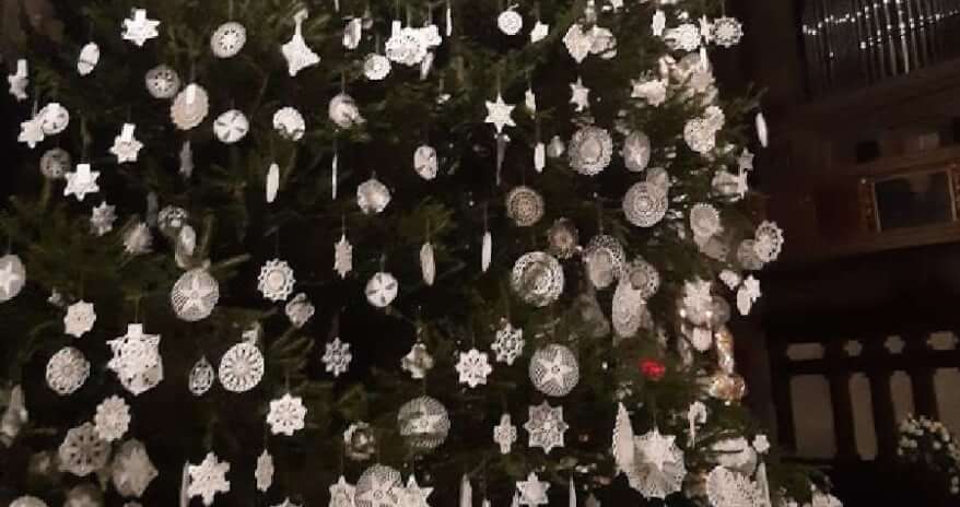 Più di 800 centrini sono stati realizzati per addobbare gli alberi presenti nella chiesa parrocchiale e ognuno di essi rappresenta un parrocchiano