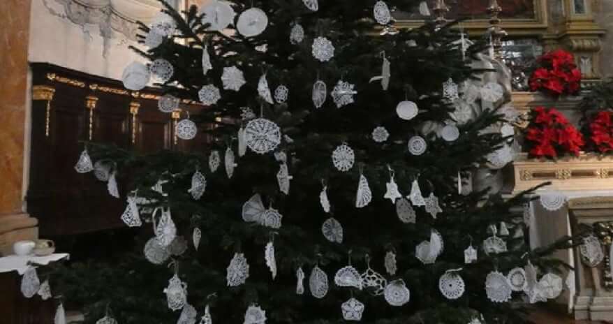 Centinaia di centrini addobbano gli alberi all'interno del Duomo di Montichiari, a realizzarli le mamme e le nonne del paese