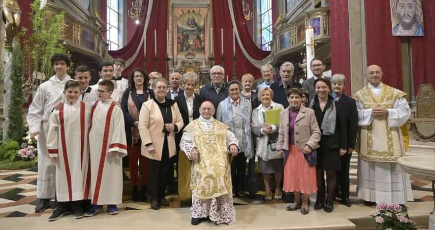 Pasqua con il vescovo emerito di Lodi mons. Giacomo Capuzzi, tornato a Manerbio, a 90 anni, per presiedere la Messa solenne (l’immagine è di Fotomonterenzi di Manerbio) concelebrata con il parroco, don Alessandro Tuccinardi, e condecorata dai canti della “Schola cantorum”.