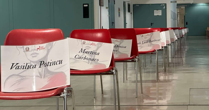 Le 44 sedie rappresentano le donne uccise in Italia da gennaio a oggi.