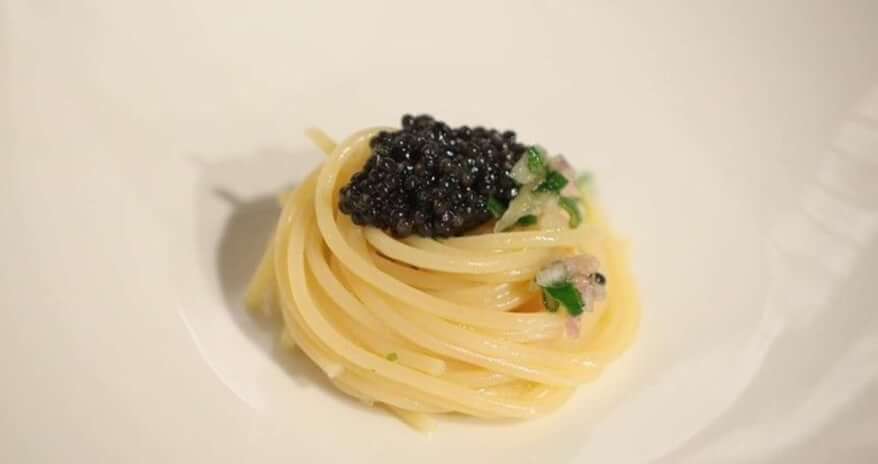 Il Gelso Nero, chef Faruk Neziri - Spaghetto freddo, olio gran cuvée Ugo Caldera, scalogno ed erba cipollina con Caviale Calvisius Siberian Royal.