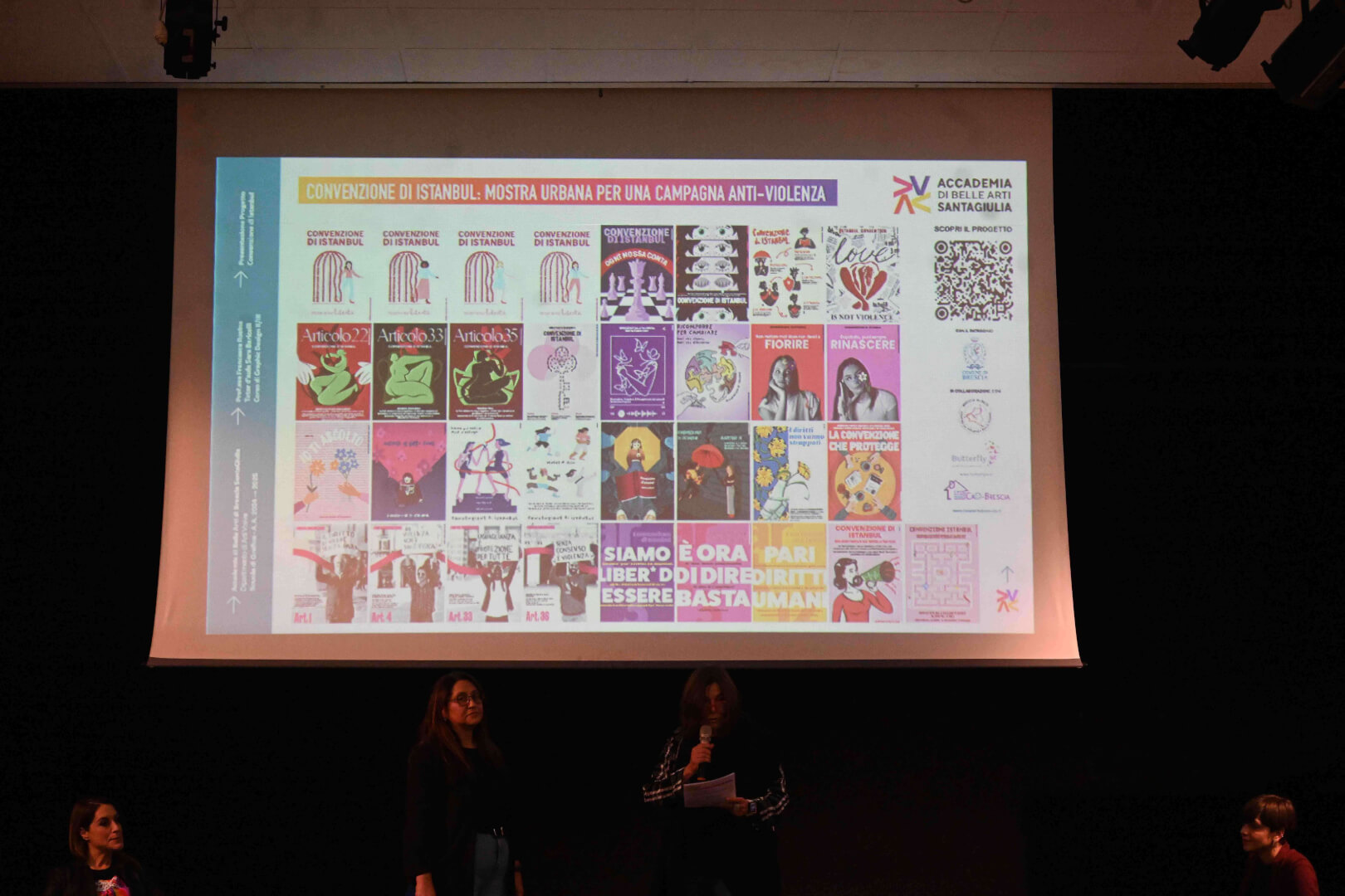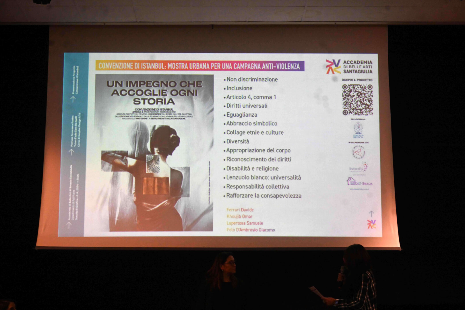Il secondo progetto proposto dall’Accademia di Belle Arti SantaGiulia evidenzia invece l’importanza della comunicazione visiva nella promozione della cultura del rispetto, essenziale per una società moderna. Le studentesse e gli studenti del secondo e terzo anno della Scuola di Grafica hanno creato una campagna visiva di sensibilizzazione contro la violenza sulle donne, ispirata alla “Convenzione di Istanbul”. A partire dal 25 novembre, 33 lavori selezionati sono stati esposti in una mostra urbana allestita in vari punti della città, grazie alla collaborazione con i Consigli di Quartiere. Le affissioni e installazioni visive hanno trasformato gli spazi pubblici in luoghi di riflessione, coinvolgendo attivamente i cittadini e invitandoli a partecipare a un dialogo fondamentale per il cambiamento sociale.