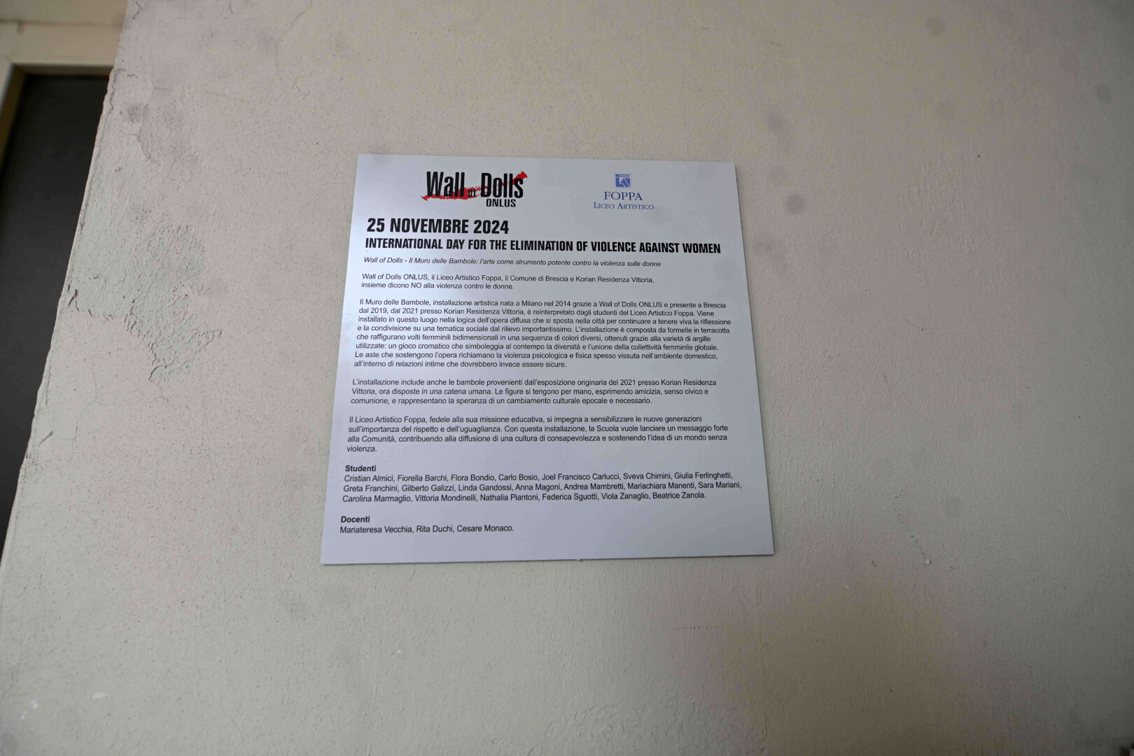 Il primo progetto è stata la presentazione della nota installazione Muro delle Bambole, ideata dall’Associazione Wall of Dolls Onlus nel 2014, portata a Brescia nel 2019 in via Gambara (tra il Giornale di Brescia e il Tribunale) e nel 2021 presso la sede di Korian Residenza Vittoria (via Calatafimi, 1). Grazie al contributo degli studenti del Liceo Artistico Foppa, guidati dai loro docenti, l’opera ha trovato nuova vita: è stata spostata nella sede del Gruppo Foppa (via Cremona, 99) e reinterpretata con una visione contemporanea, permettendo alle giovani generazioni di esprimere il loro punto di vista.