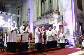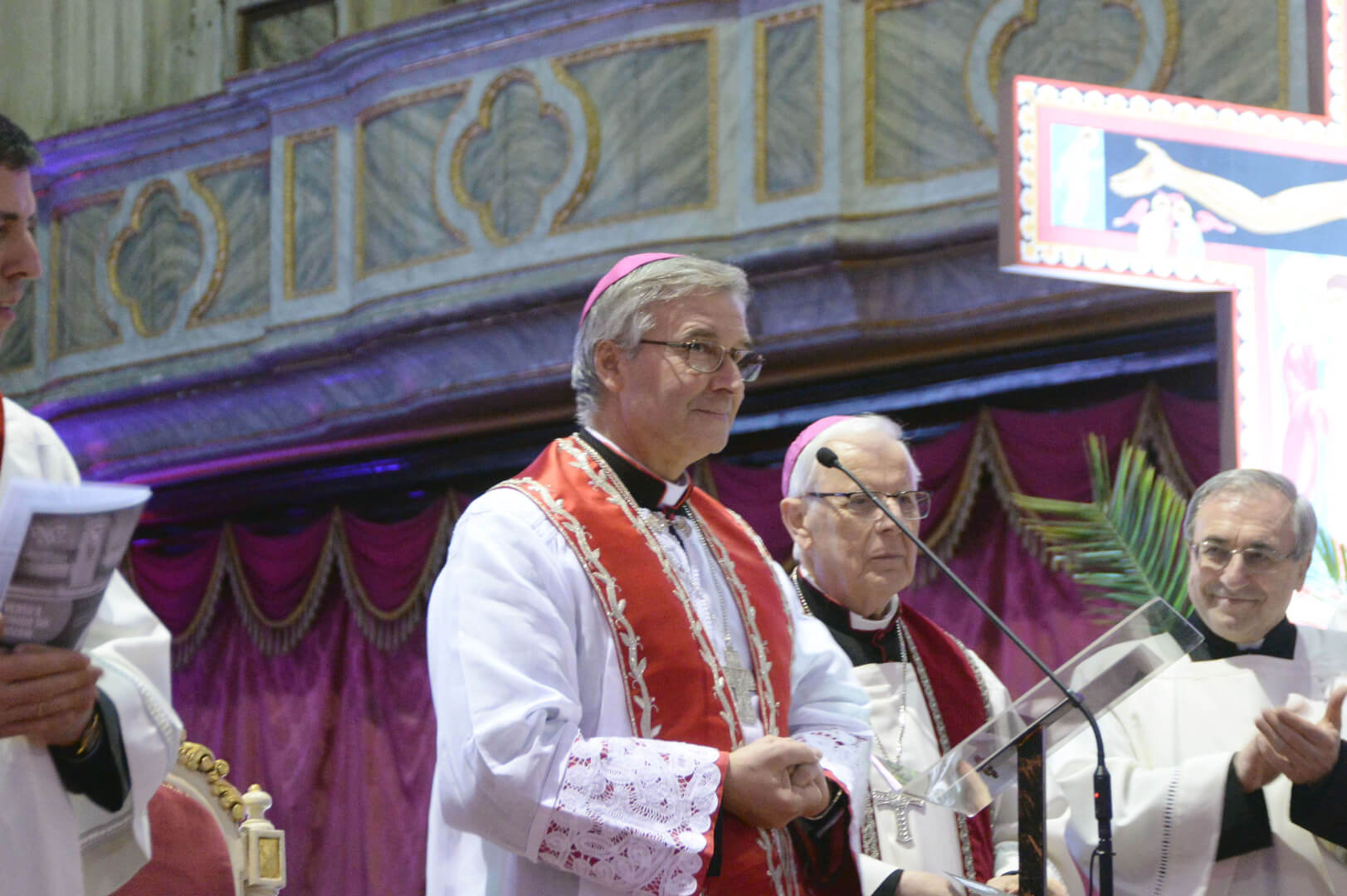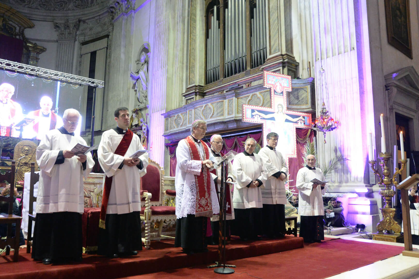 Concludo volgendo con voi lo sguardo al volto del Cristo crocifisso. Entriamo con questa celebrazione nella settimana santa. Il nostro amato Signore si avvia verso il Calvario e si prepara a compiere l’offerta della sua per amore nostro. Ai piedi di quella croce c’è anche la Madre, colei che lo ha accolto la Parola e lo ha donato al mondo. Insieme a lei volgiamo il nostro sguardo a colui che è stato trafitto per le nostre colpe. Il suo volto è mite. Davvero amabile. Alle ingiustizie e crudeltà patite egli ha risposto con una bontà inimmaginabile, quella che solo il Figlio amato di Dio tra noi poteva avere. Su questa bontà poggia ora la storia del mondo e questa bontà rappresenta il centro e la sorgente della nostra fede.