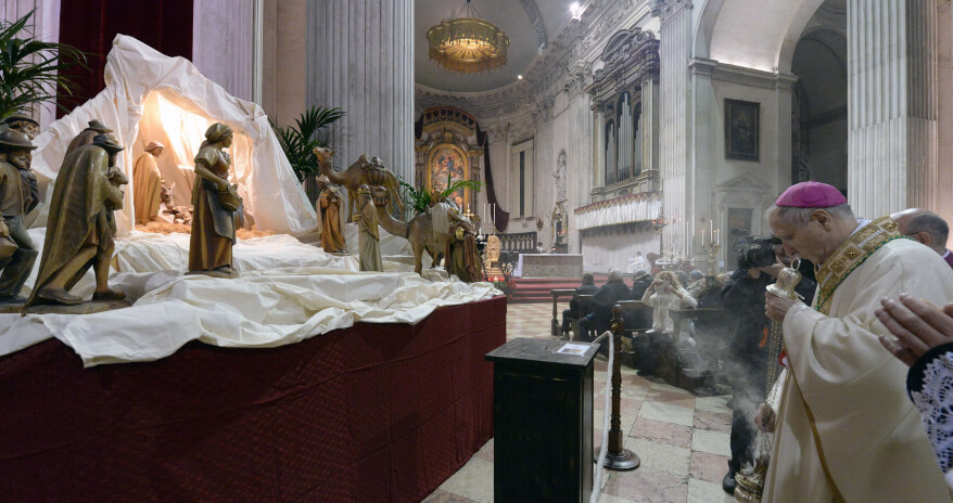 La celebrazione del Natale può essere un antidoto. Abbiamo ascoltato il profeta Isaia: “Il popolo che camminava nelle tenebre ha visto una grande luce; su coloro che abitavano in terra tenebrosa una luce rifulse. Hai moltiplicato la gioia, hai aumentato l’esultanza.” Anche solo ascoltare parole come queste ci fa bene; in mezzo al velo del timore si apre qualche squarcio di consolazione, di speranza “perché un bambino è nato per noi, ci è stato dato un figlio… la pace non avrà fine nel suo regno che egli viene a consolidare e rafforzare con il diritto e la giustizia, ora e sempre. Questo farà il Signore degli eserciti.” La gioia è contagiosa, così come la tristezza. Per questo un elementare atto di amore è custodire la gioia in modo da suscitarla negli altri. Non la gioia pacchiana che ha bisogno di stimoli sempre nuovi per conservarsi, ma la gioia riconciliata, quella che proviene dalla vita stessa nel suo mistero e nella sua fecondità; la gioia che si nutre di un angolo di cielo azzurro, di un sorriso amico, di un momento sereno… che si nutre cioè di quelle piccole cose che Dio continua a seminare nel mondo come sorgenti di sicurezza e di fiducia.