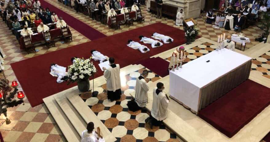 Eccoci al giorno sempre molto atteso delle Ordinazioni Presbiterali. La Chiesa diocesana, ma anche la Congregazione religiosa dei Carmelitani scalzi, si stringe intorno a voi, cari Michele, Luca, Denny, Matteo, Michele, Francesco; guarda a voi come a un dono prezioso e come a un segno della provvidenza divina a favore del suo popolo. Siete giunti a questo momento dopo un cammino di discernimento e di formazione, che – ne sono certo – vi ha arricchito e vi ha fatto crescere. Siete stati accompagnati dalle vostre famiglie, dagli educatori del seminario e dalle vostre comunità, ma anche dalle tante persone che avete incontrato lungo la strada della vostra vita e a cui ora siete uniti dai dolci legami dell’affetto e della riconoscenza. Ogni vocazione che giunge al suo compimento porta infatti il sigillo della carità, di un amore condiviso, della comunione tra fratelli e sorelle nella fede.