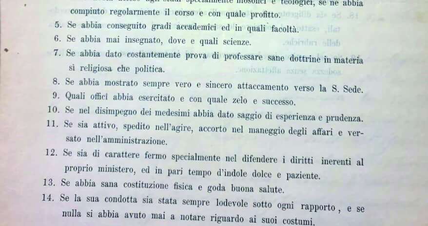 Scorriamo con curiosità l’elenco delle caratteristiche che, nella prima metà del Novecento, erano ritenute necessarie per un buon vescovo: ‘Quesiti intorno alle qualità dei soggetti da promuoversi all’episcopato in Italia’. Innanzitutto si vuole sapere come sia collocata la famiglia, sia dal punto di vista religioso che politico, se abbia studiato e/o insegnato, se abbia dimostrato ‘attaccamento verso la S.Sede’ e abbia dato prova di ‘professare sane dottrine’ sia in ambito religioso che politico, se sia moralmente ineccepibile e dotato di ‘indole dolce e paziente’, se sia ‘attivo e spedito nell’agire, accorto nel maneggio degli affari e versato nell’amministrazione’, se abbia dimostrato doti di prudenza, diligenza, generosità verso i poveri, pietà nel ministero e ben disposto alla predicazione, se nel ‘vestire, incedere, conversare mostri gravità e sodezza senza affettazione’. Non sarebbe male se i candidati a ricoprire ruoli pubblici nel parlamento della Repubblica, fossero passati al vaglio di una buona parte di queste virtù.