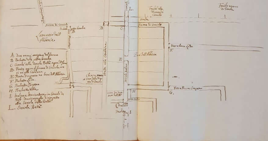 Si noti come lo schizzo mette in evidenza soprattutto il reticolo delle acque di quel territorio: il fiume, i vasi, le bocche, le seriole e il mulino che delle acque faceva uso per la macinazione del grano. È annotata anche la presenza della chiesa di S. Maria dello Spasimo di Pompiano.
