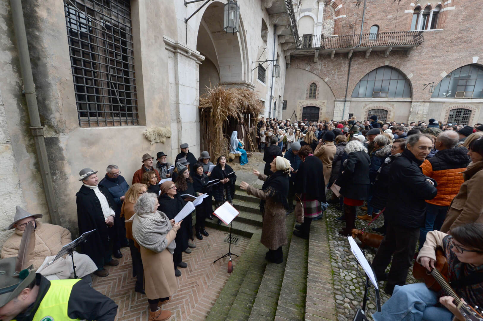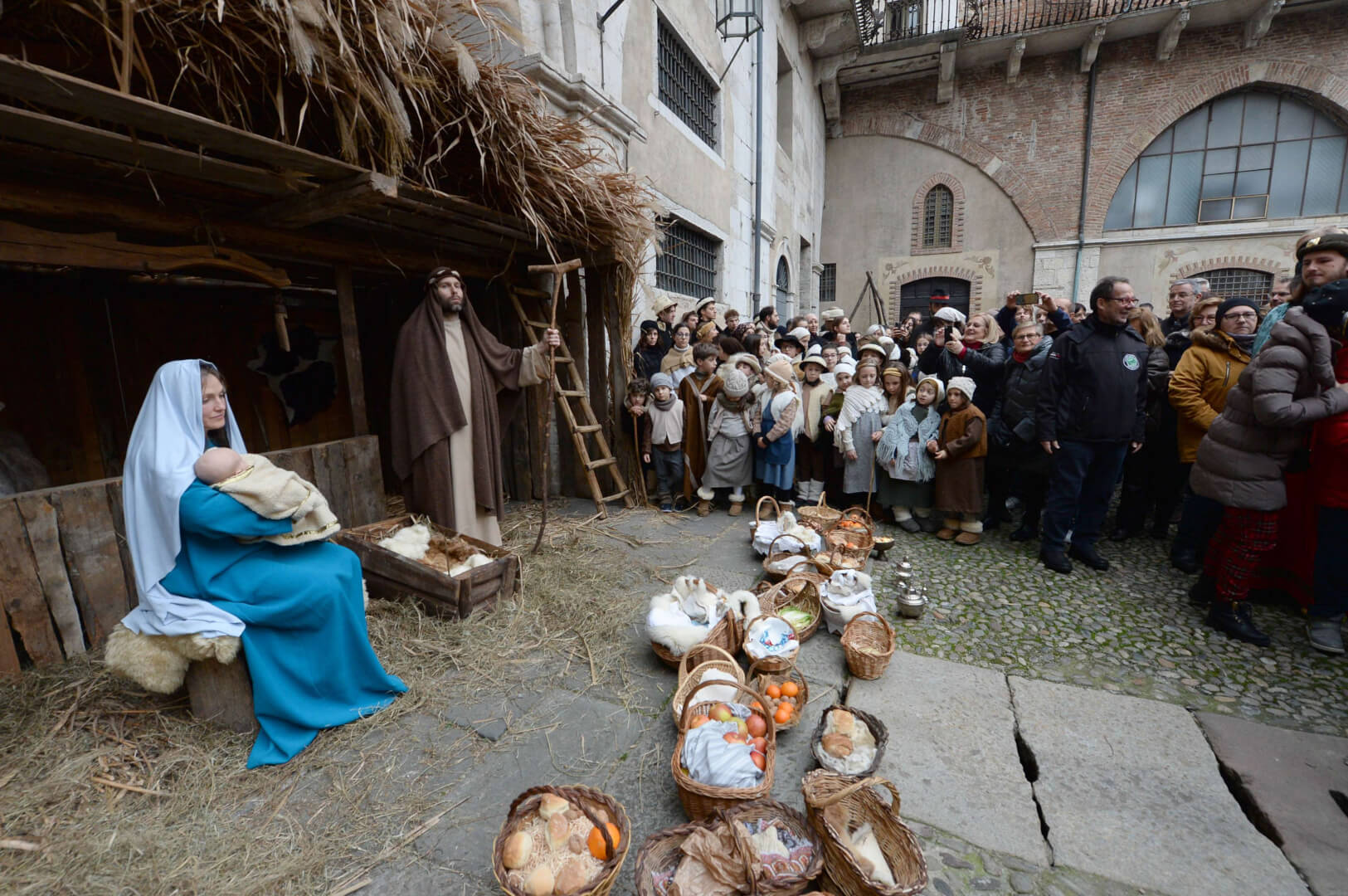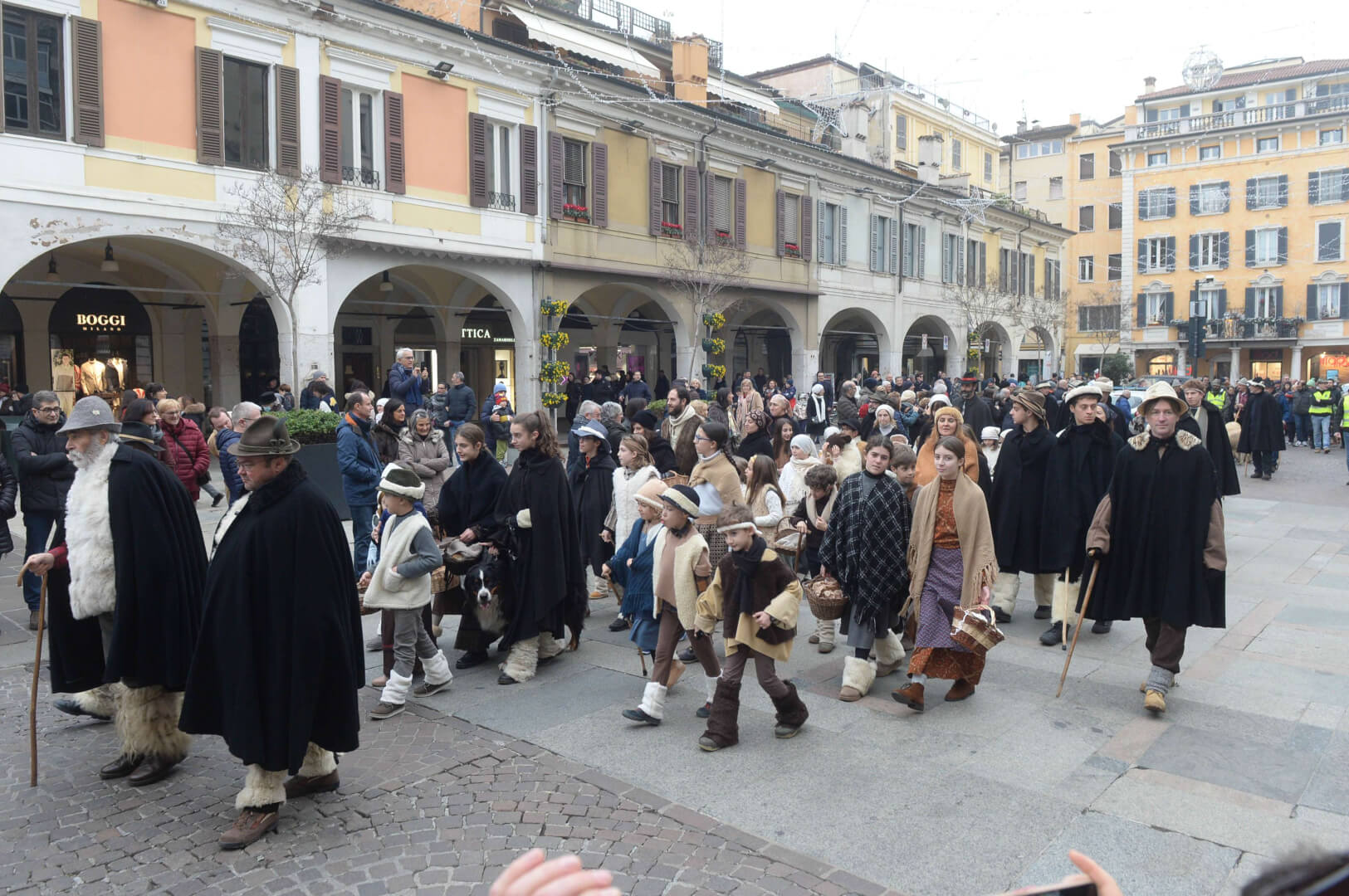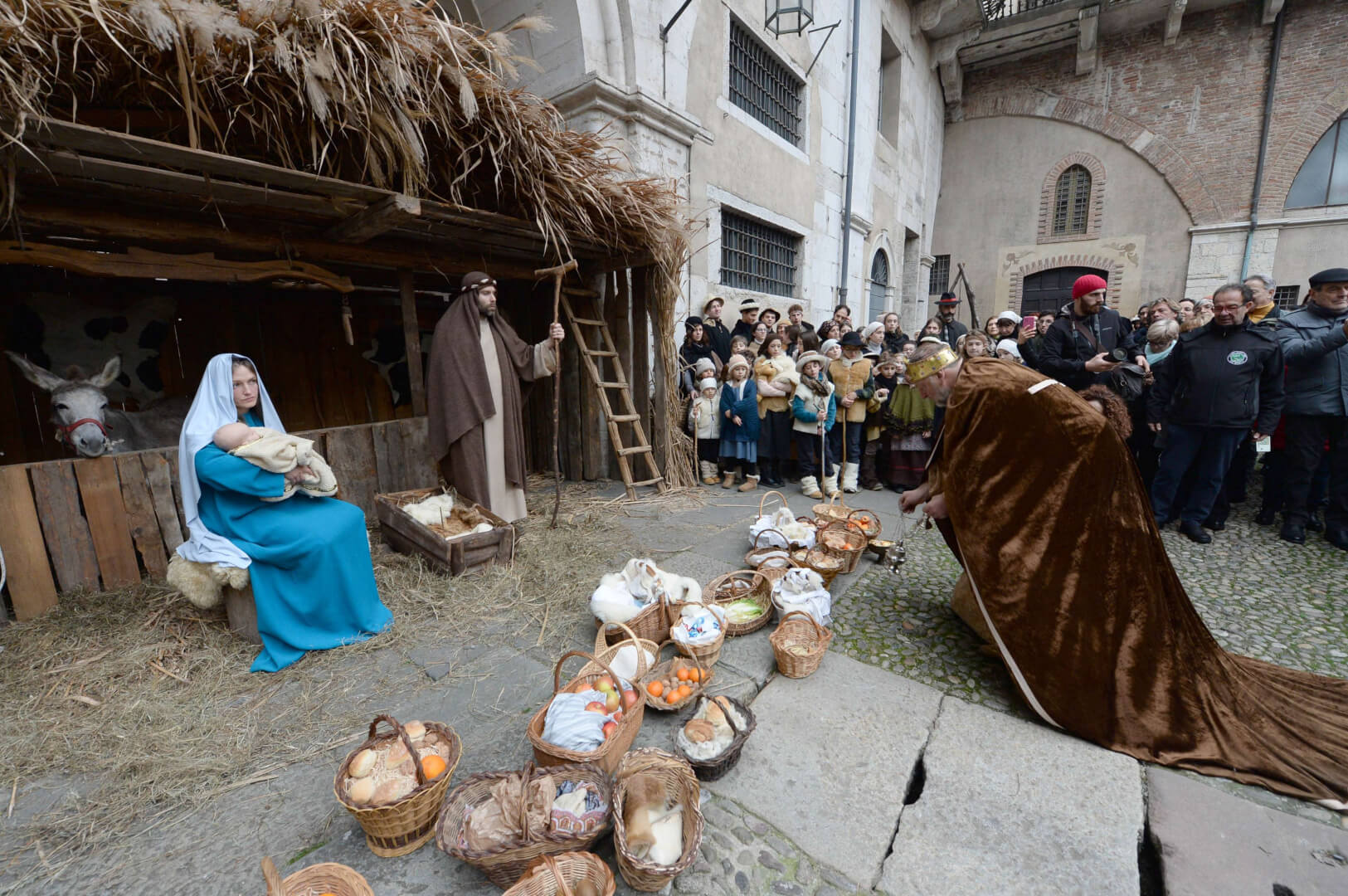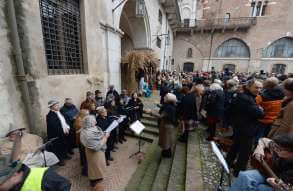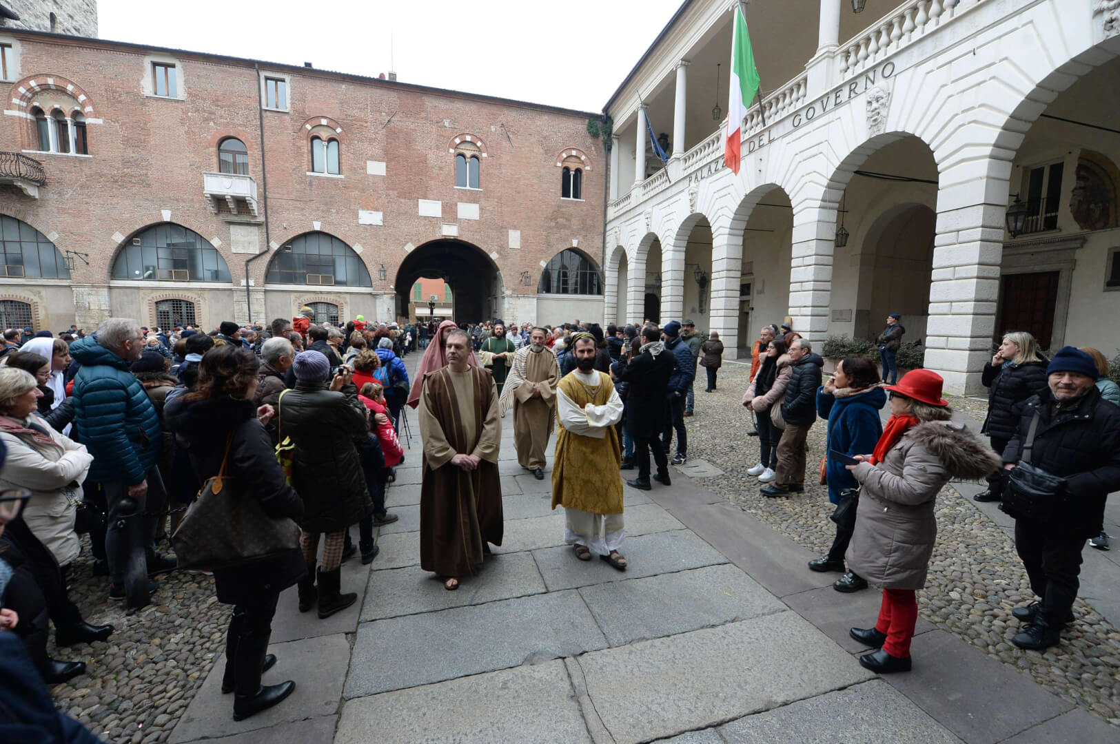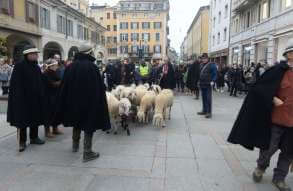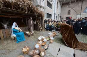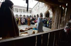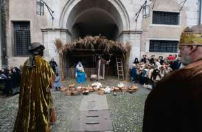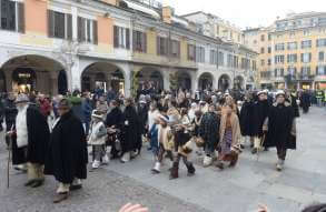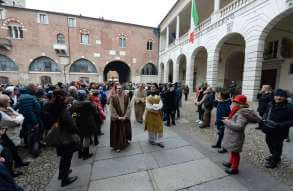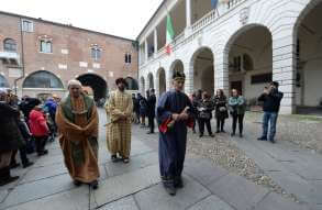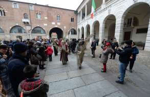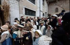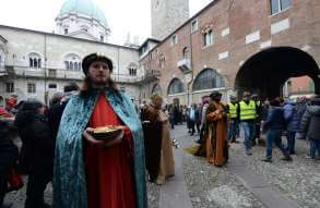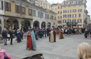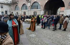 I più di 100 figuranti del presepe vivente di Ome hanno animato la città di Brescia e il cortile di Palazzo Broletto. Il prossimo appuntamento con il presepe allestito dagli Alpini, questa volta nella sede tradizionale di Ome, è per il 6 gennaio alle 14.30