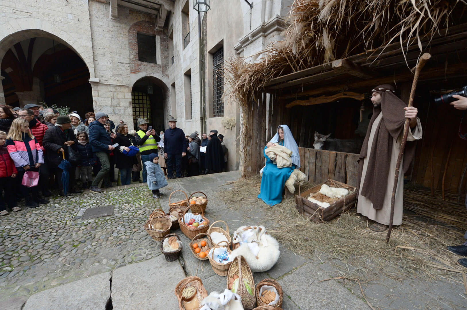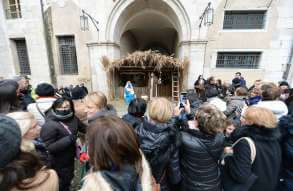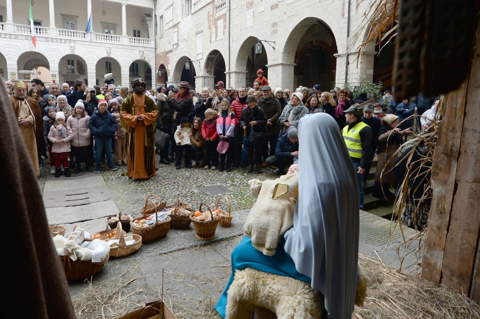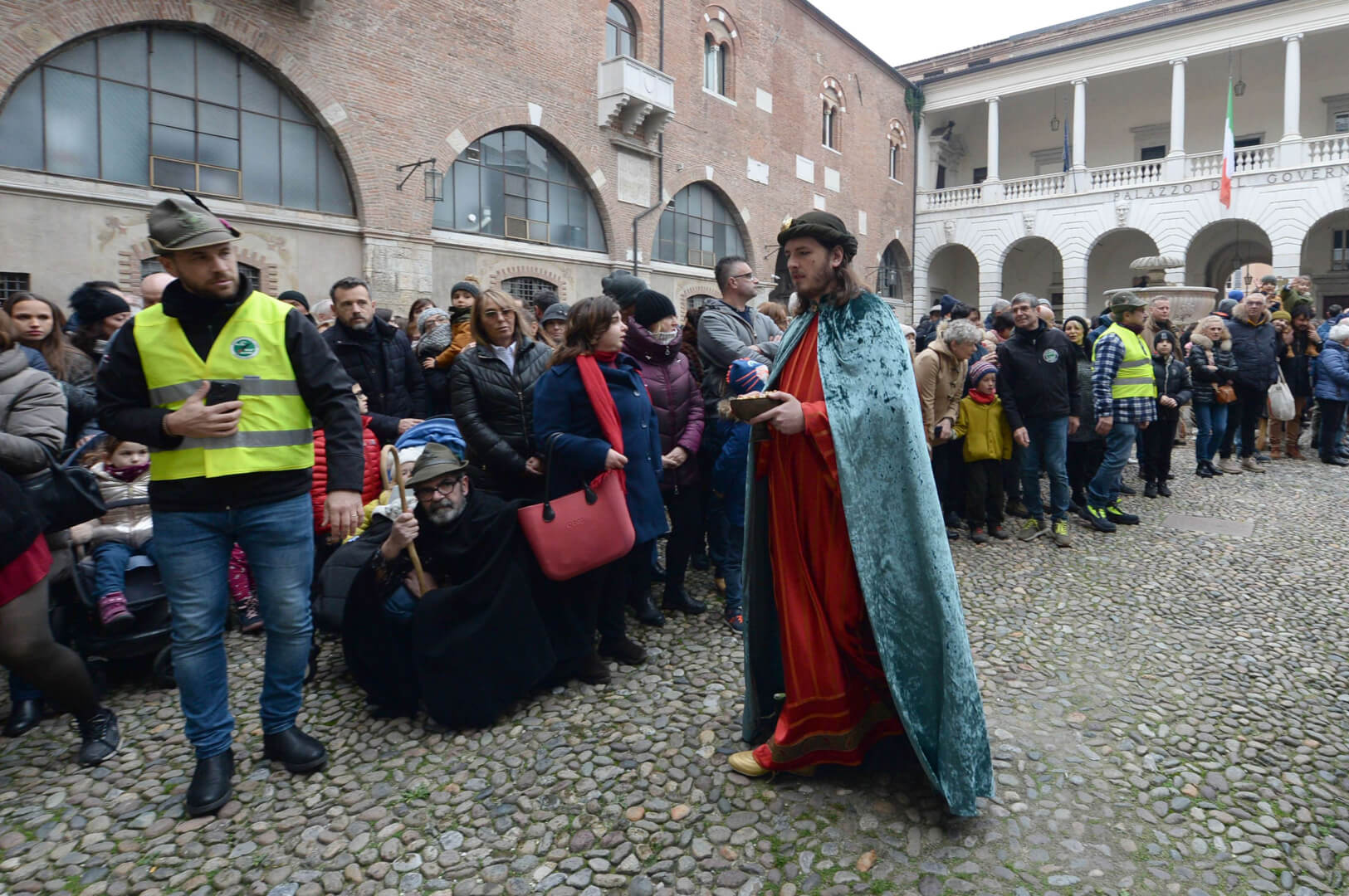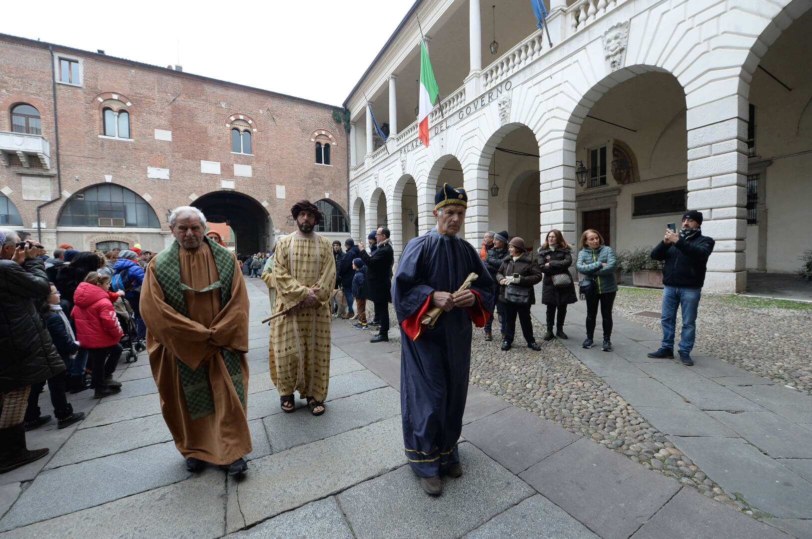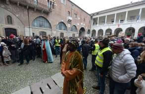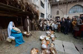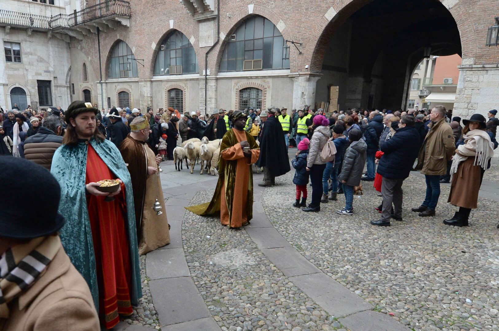 I più di 100 figuranti del presepe vivente di Ome hanno animato la città di Brescia e il cortile di Palazzo Broletto. Il prossimo appuntamento con il presepe allestito dagli Alpini, questa volta nella sede tradizionale di Ome, è per il 6 gennaio alle 14.30