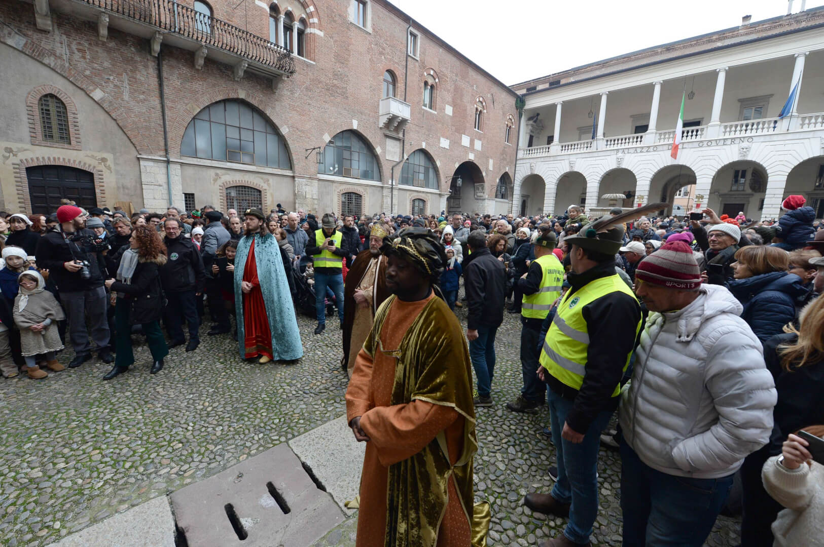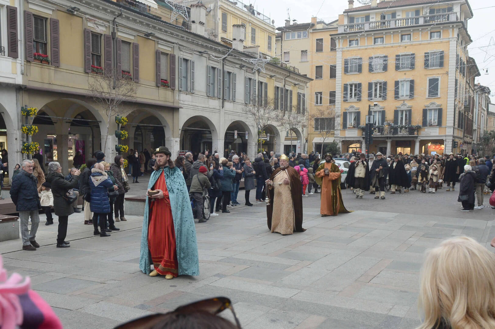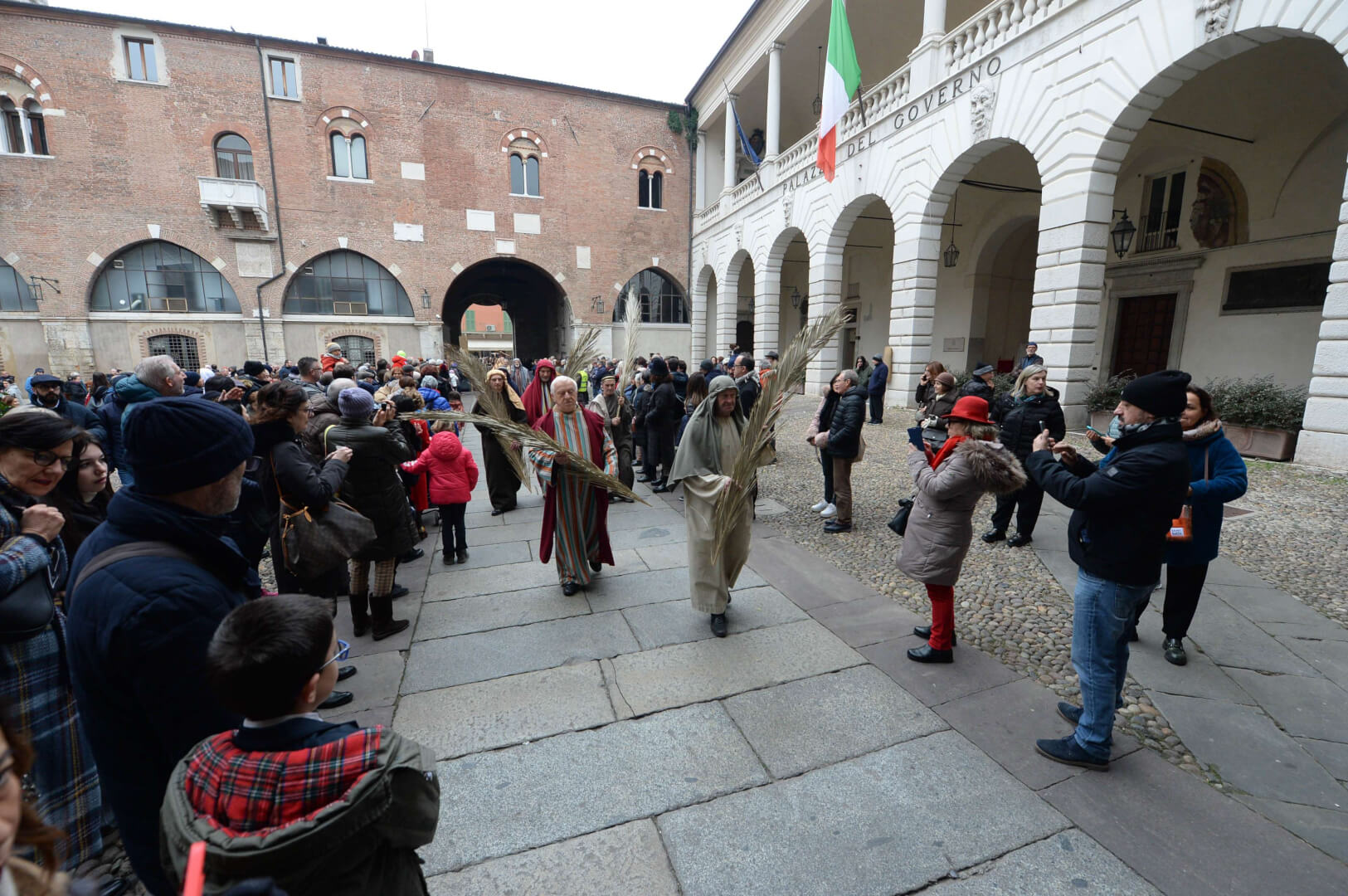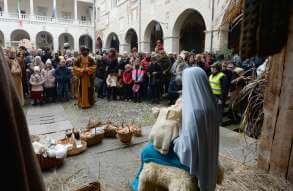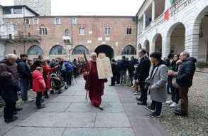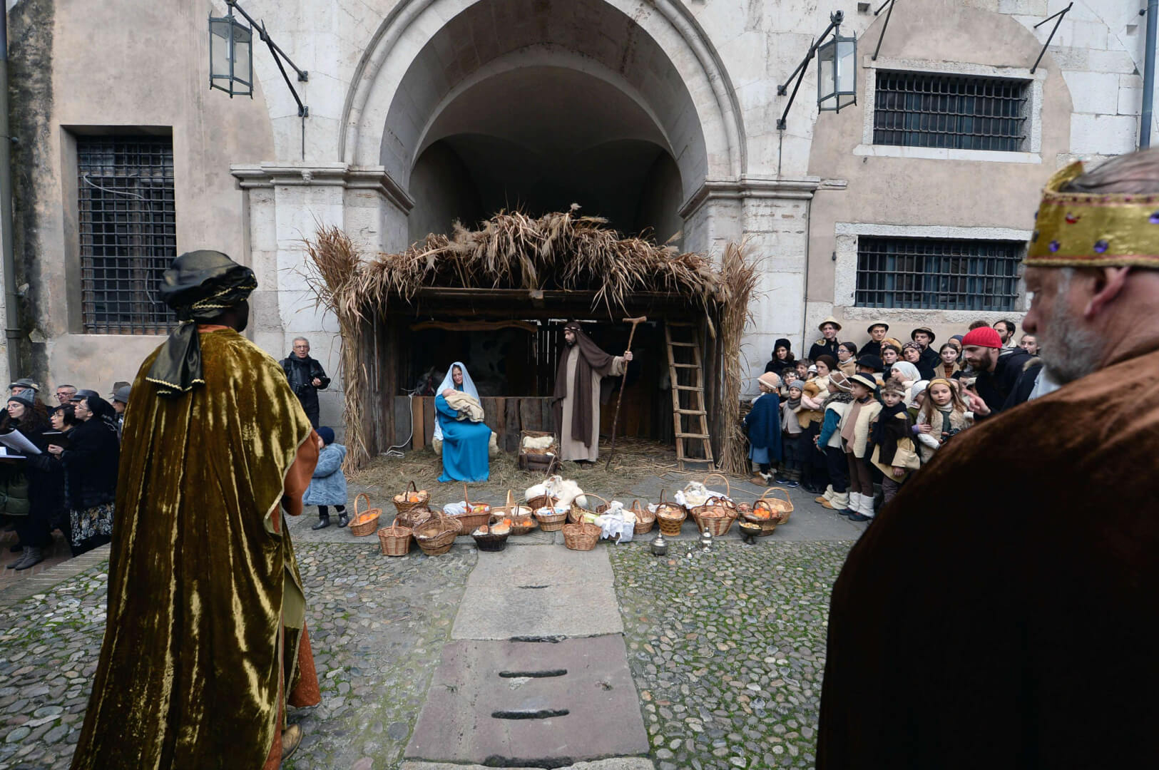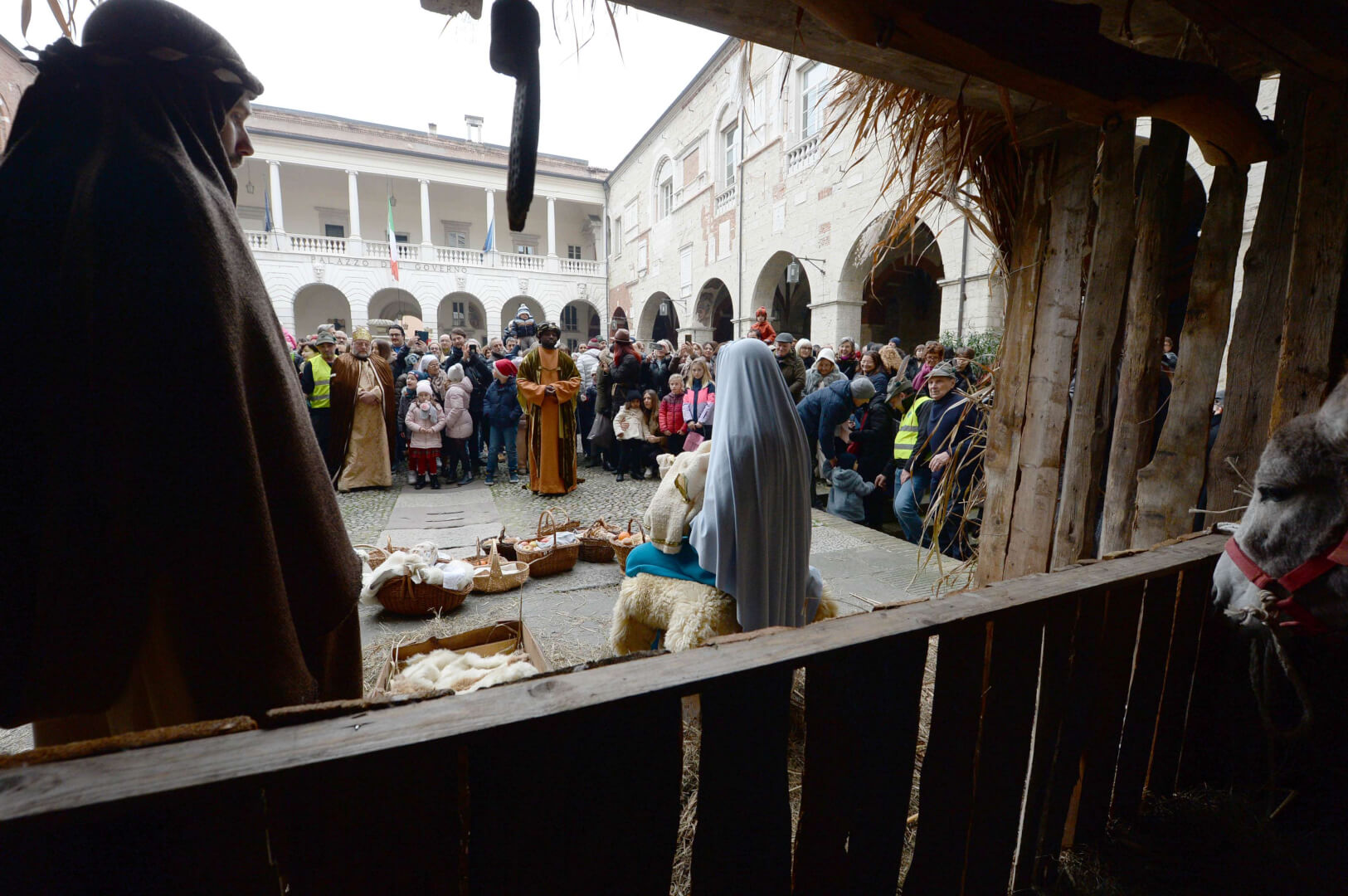 I più di 100 figuranti del presepe vivente di Ome hanno animato la città di Brescia e il cortile di Palazzo Broletto. Il prossimo appuntamento con il presepe allestito dagli Alpini, questa volta nella sede tradizionale di Ome, è per il 6 gennaio alle 14.30
