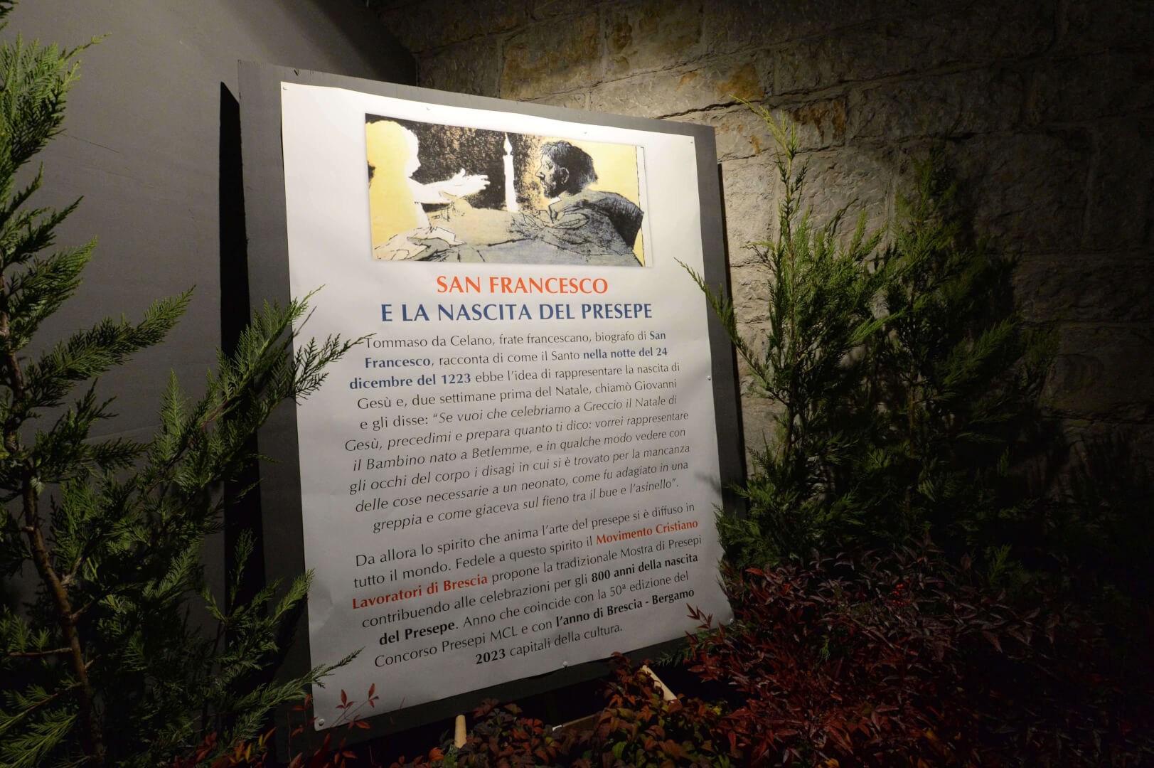 In Duomo Vecchio, fino al 7 gennaio, si può ammirare la mostra presepi promossa da Mcl: oltre 100 presepi artistici provenienti da tutto il mondo. Inoltre, nella cripta ci sono la Mostra Collezione Gilberti con i dipinti di Natale e la Mostra Collezione Antonioli con le immaginette della Natività da tutto il mondo. Gli orari sono i seguenti: dal lunedì al sabato (9.30-11.45 / 14.30- 17.45); domenica e festivi (9.30-10.30 / 14.30-17.45). Ricordando gli 800 anni dal primo presepio a Greccio, è stato allestito anche un percorso francescano nei chiostri della chiesa di San Francesco, della chiesa di San Giuseppe edel Museo Diocesano di Brescia