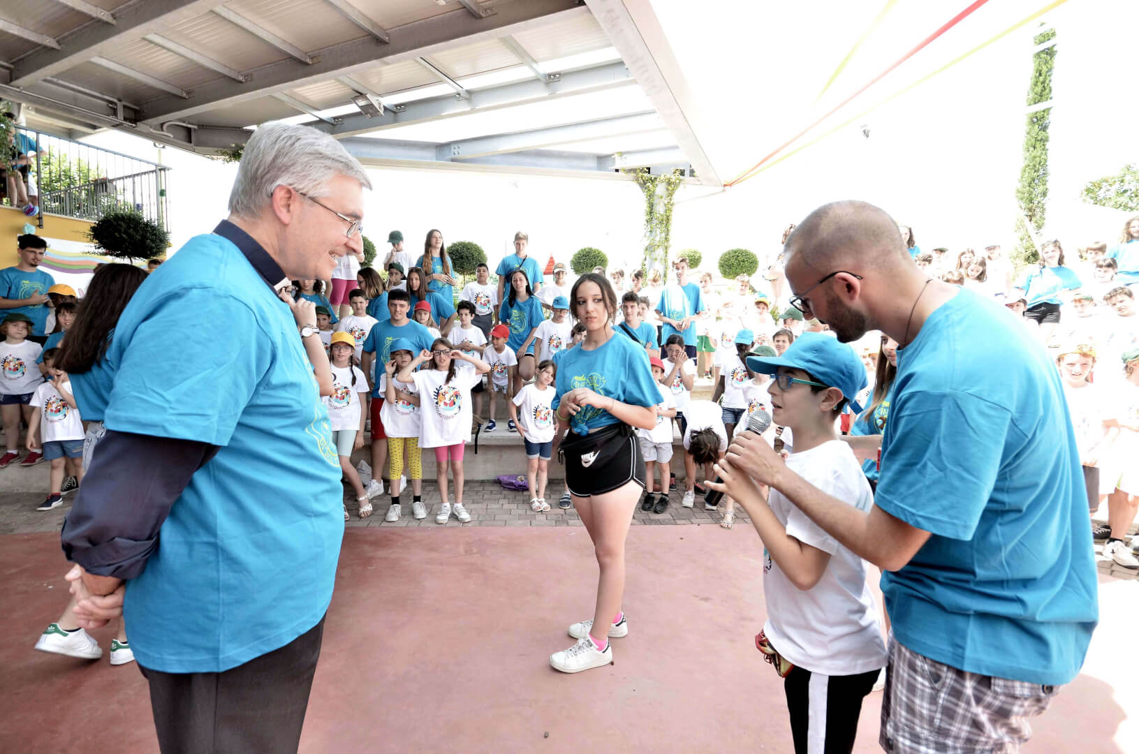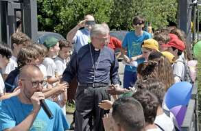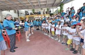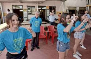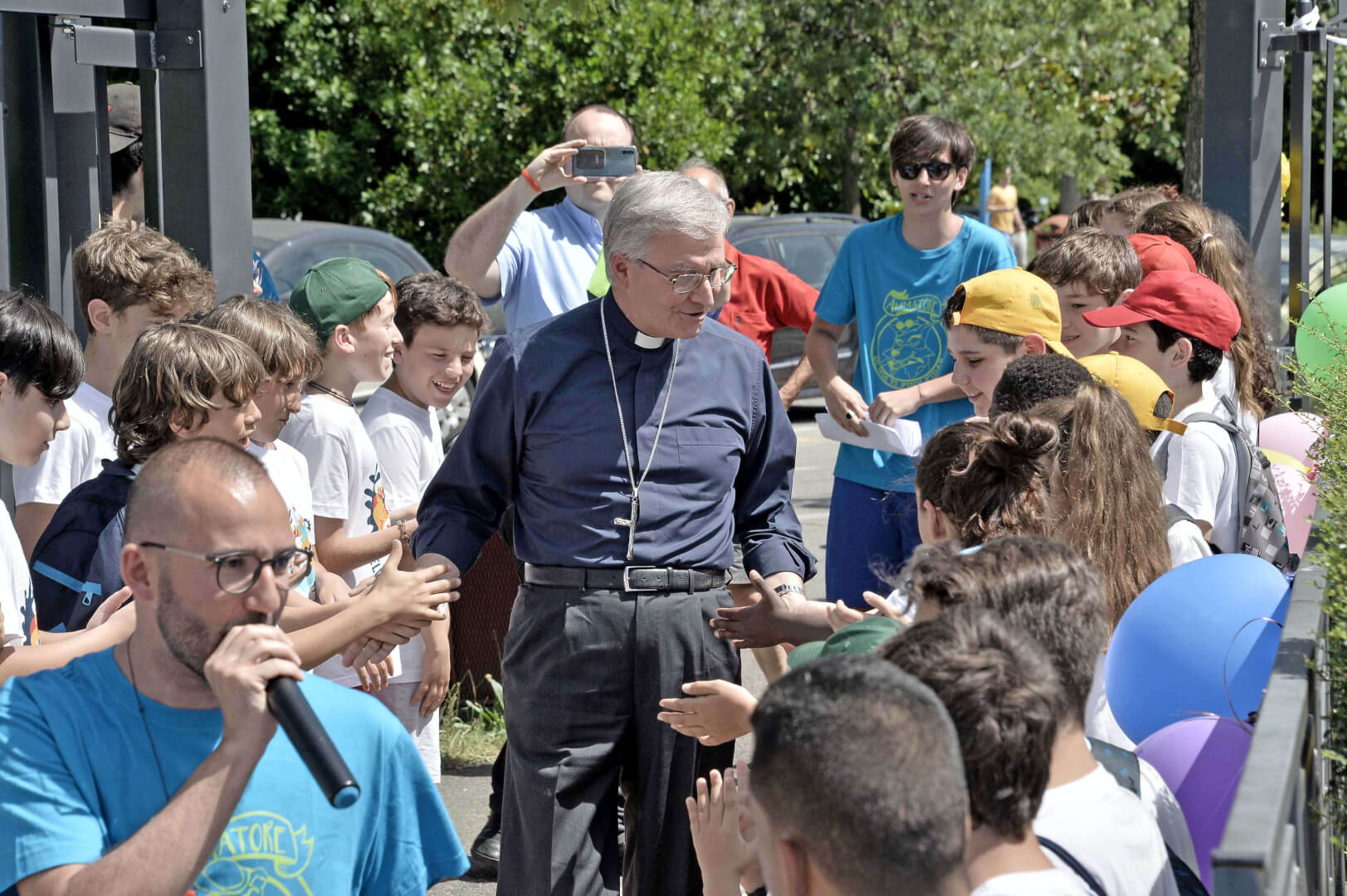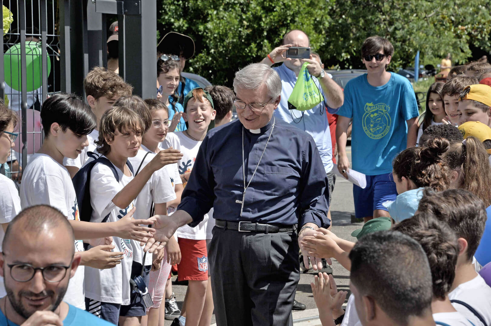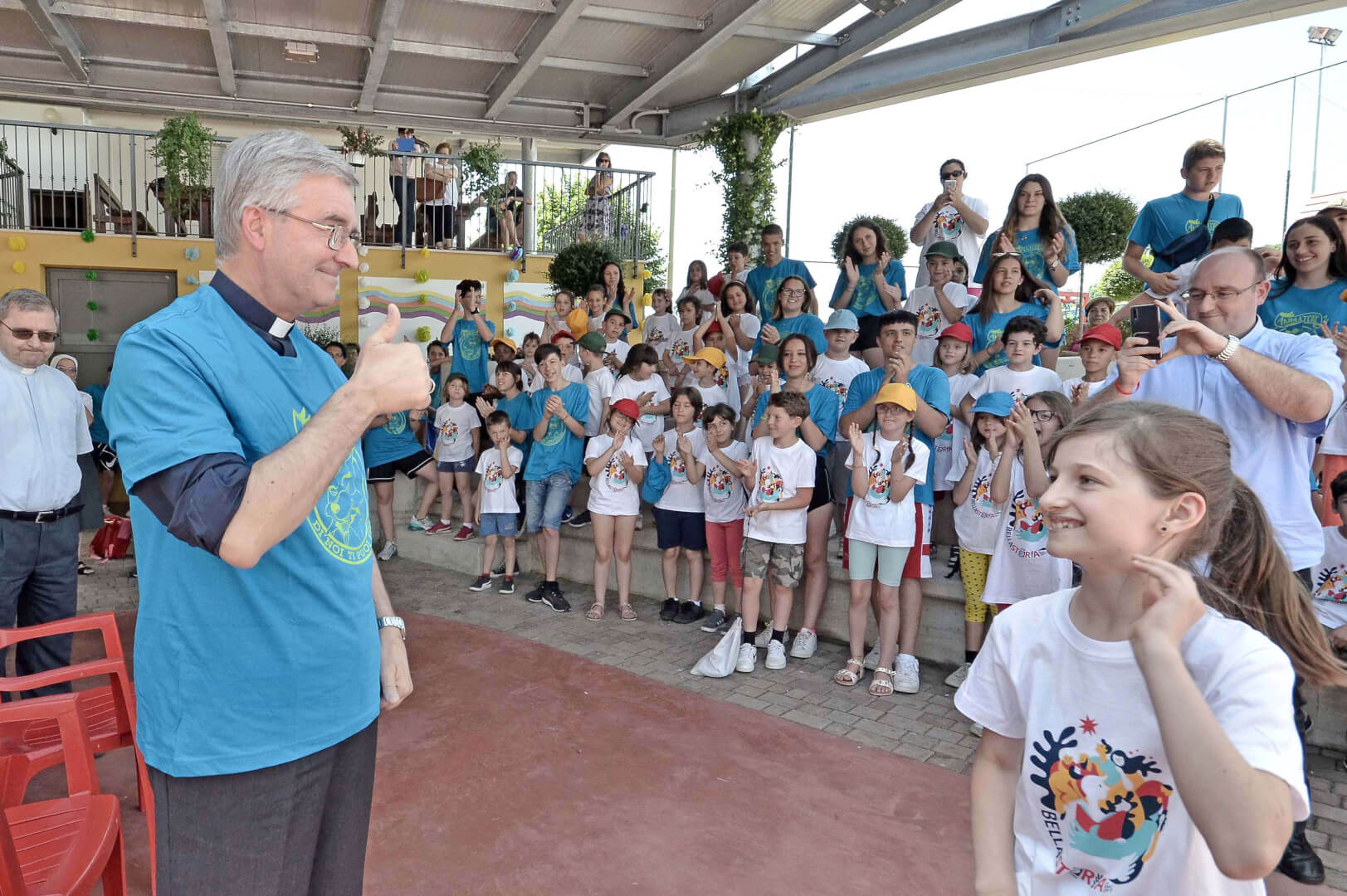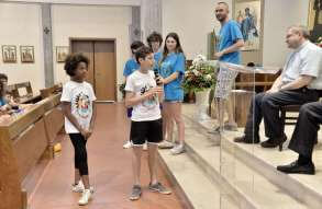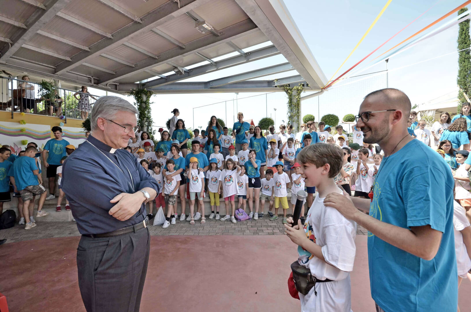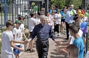 Tutta la grinta dei giovani dell'oratorio de "Le due Sante" per la visita del vescovo Pierantonio in occasione del grest