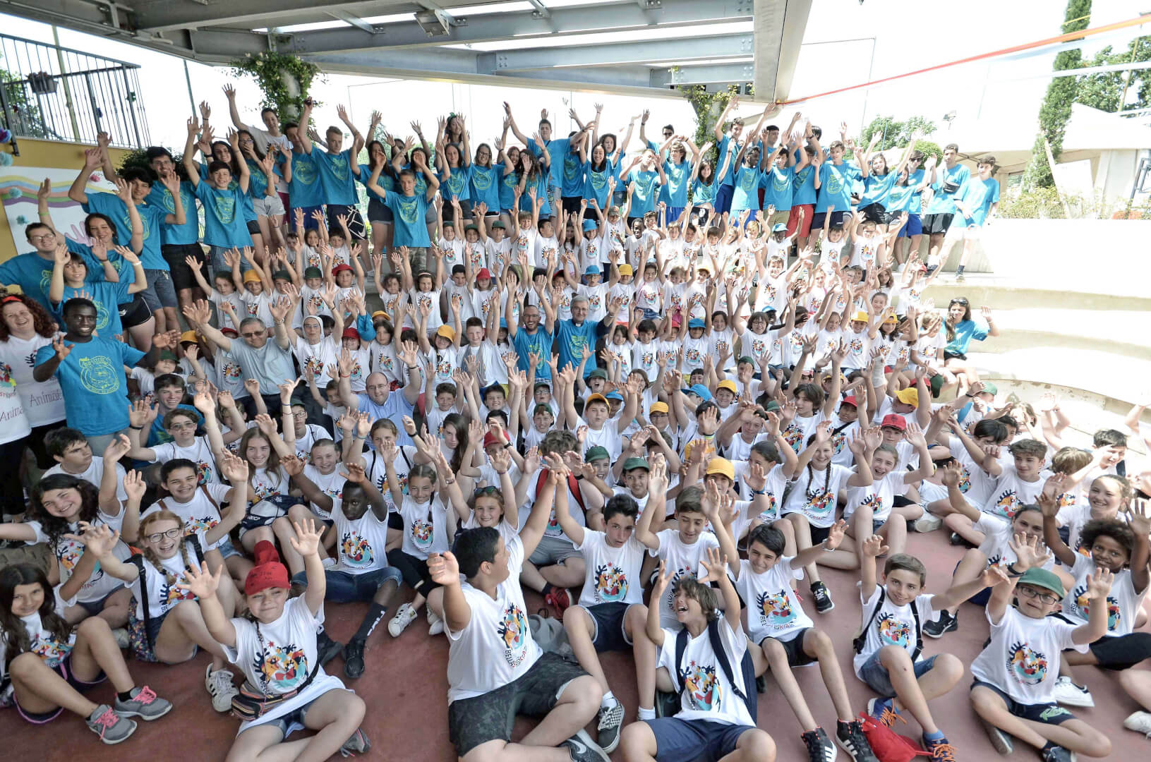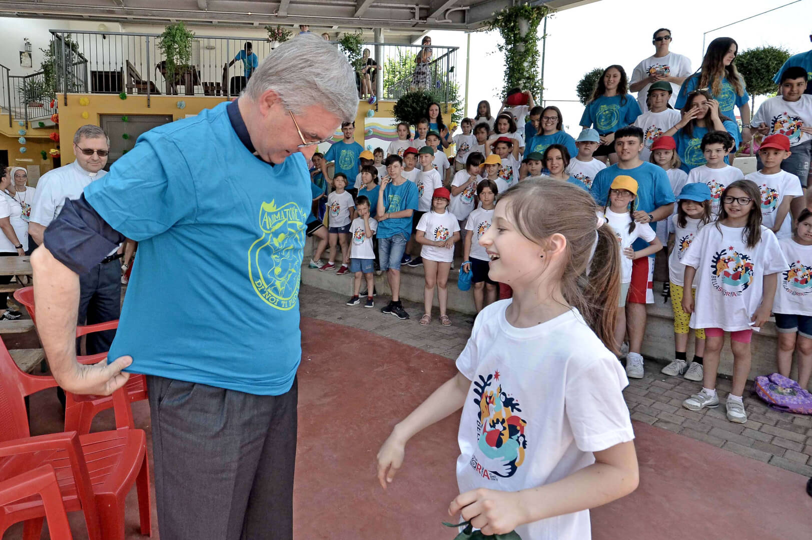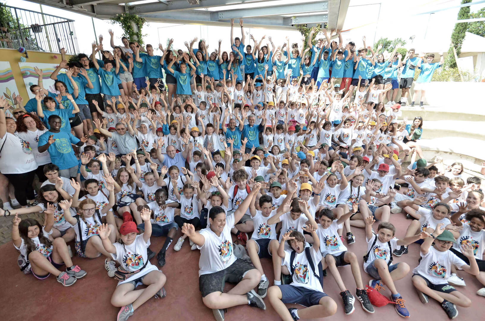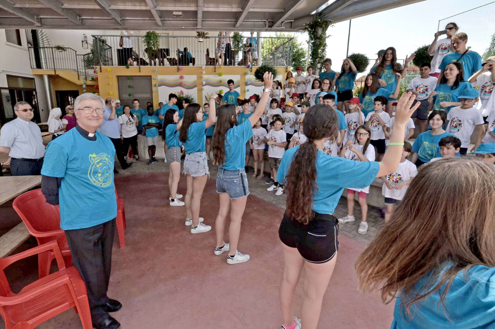 Tutta la grinta dei giovani dell'oratorio de "Le due Sante" per la visita del vescovo Pierantonio in occasione del grest