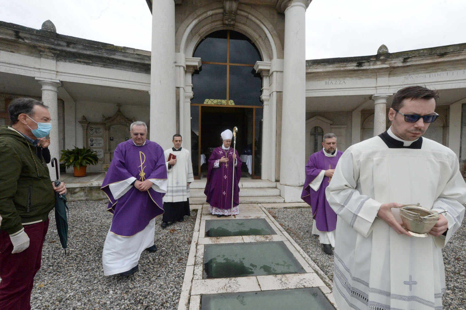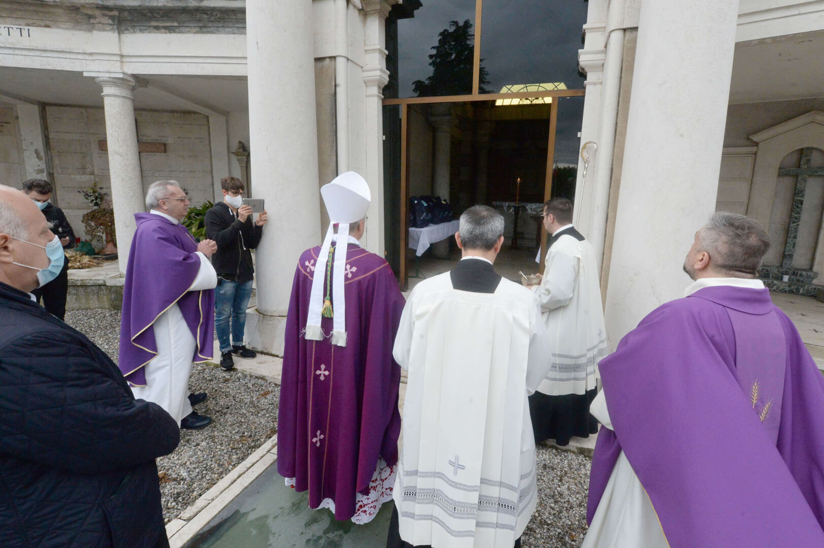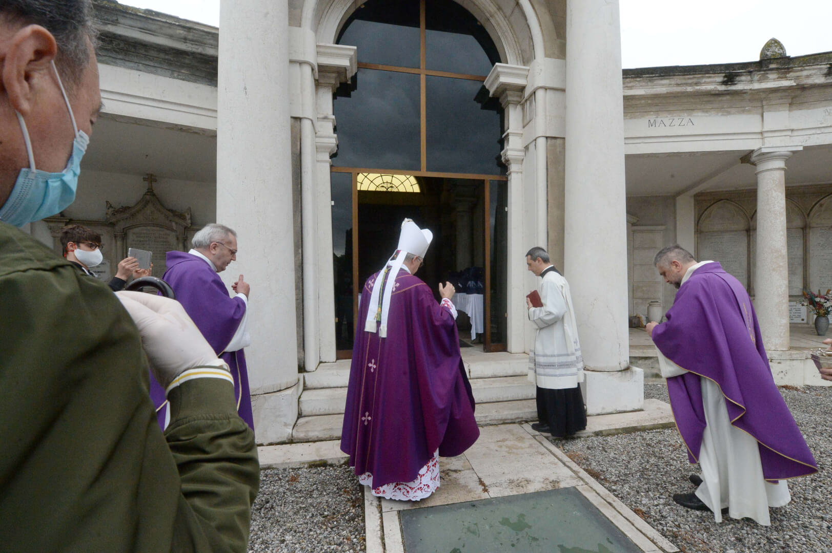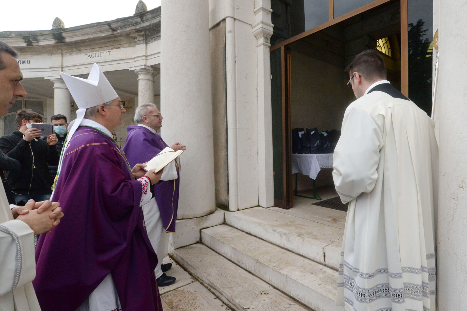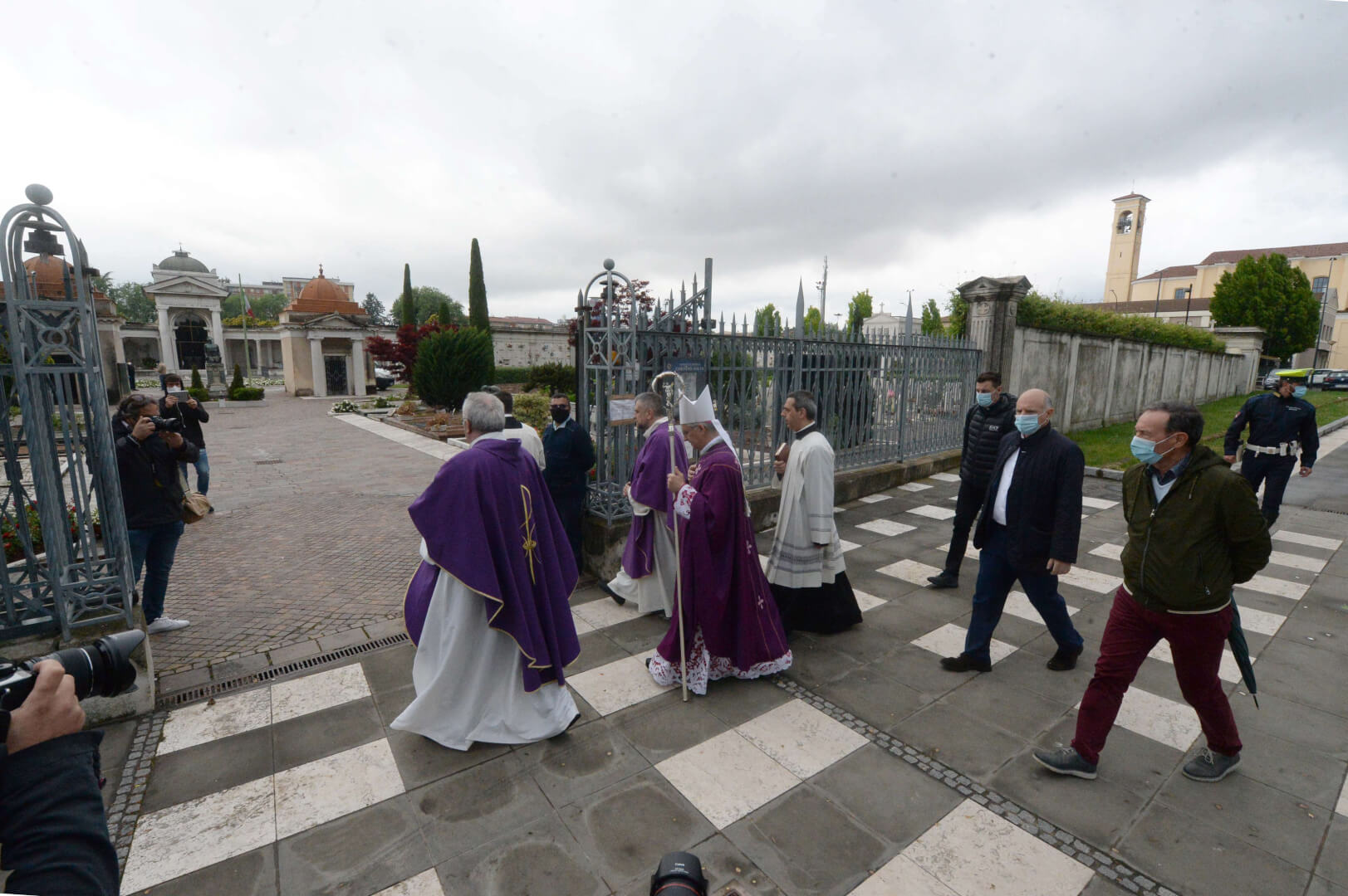 Il vescovo Pierantonio Tremolada questa mattina, lunedì 11 maggio, al cimitero della Volta per la Messa esequiale delle urne cinerarie che qui verranno tumulate