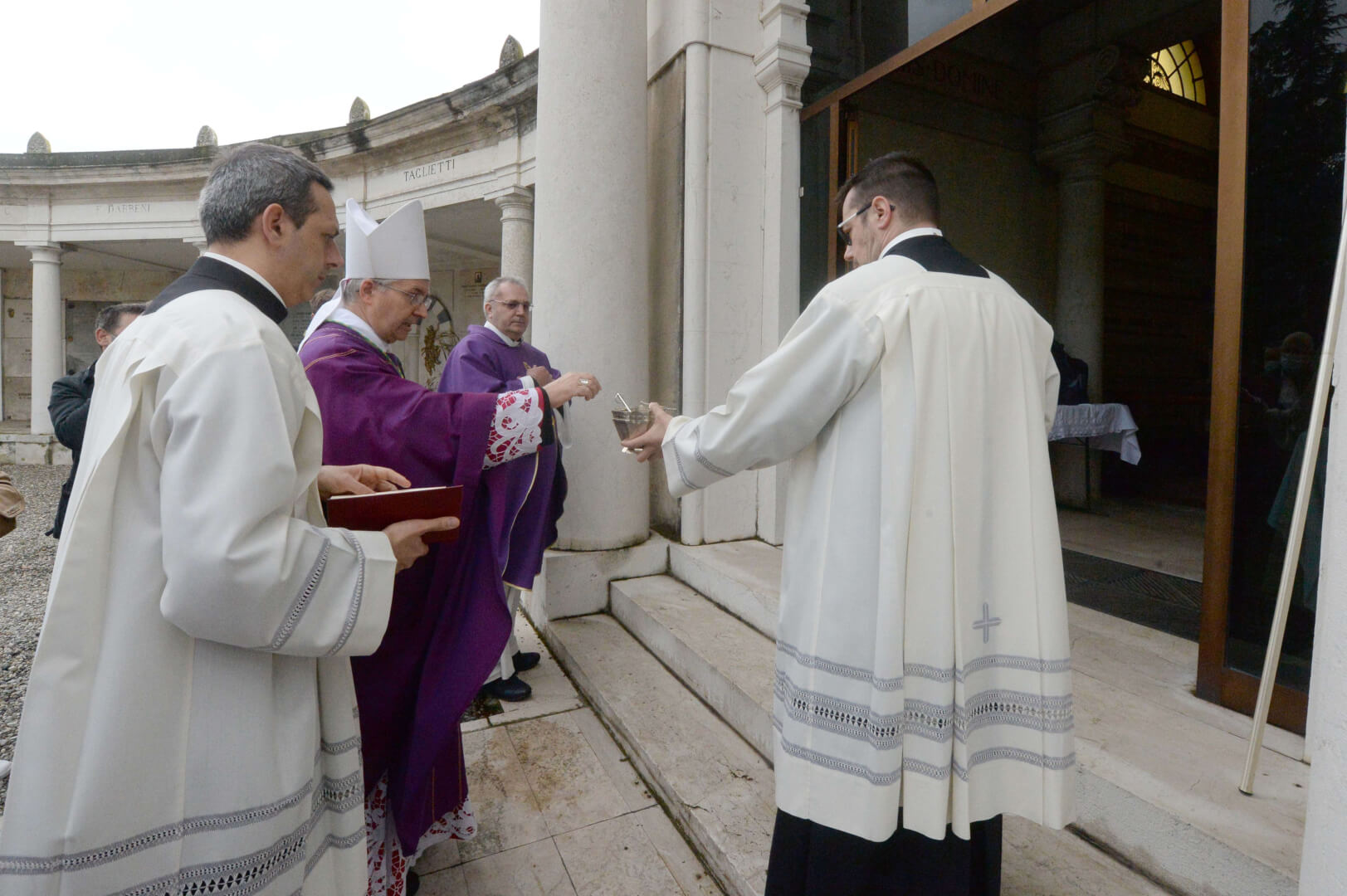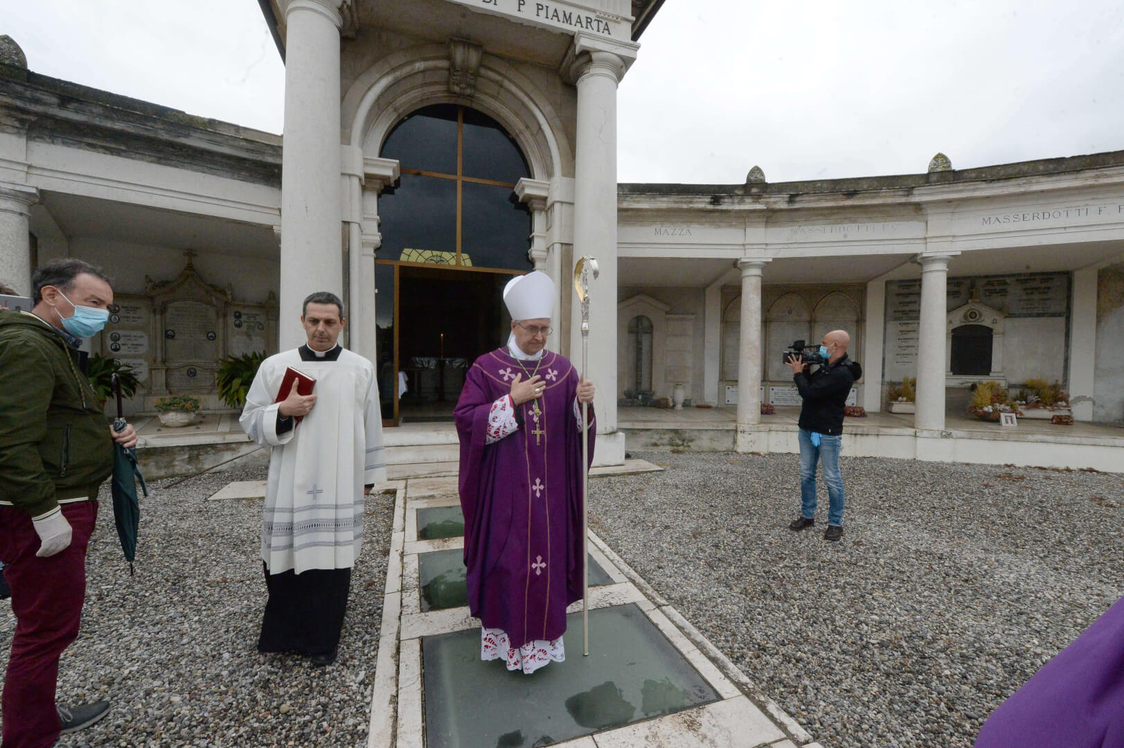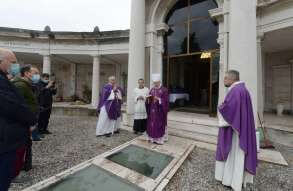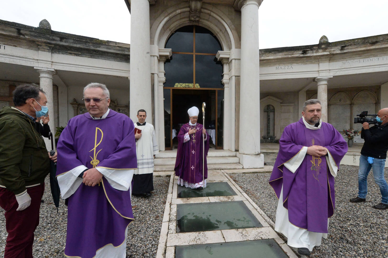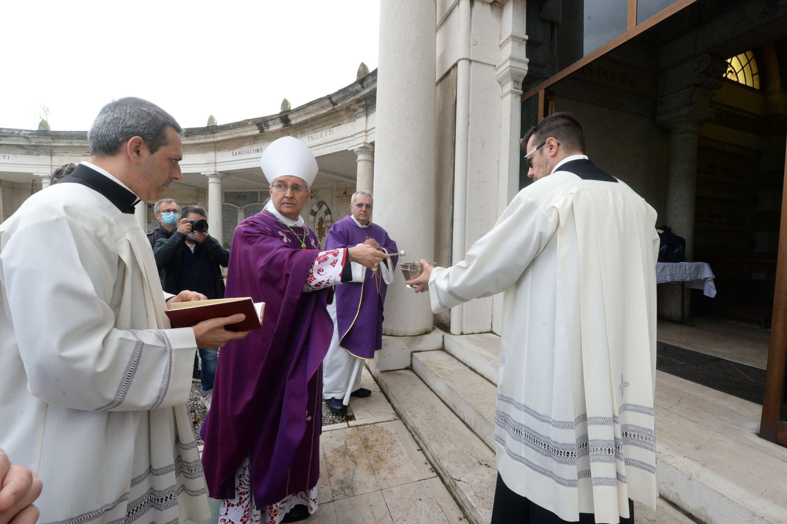 Il vescovo Pierantonio Tremolada questa mattina, lunedì 11 maggio, al cimitero della Volta per la Messa esequiale delle urne cinerarie che qui verranno tumulate