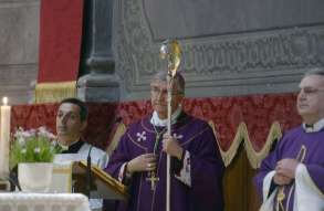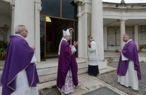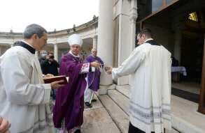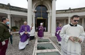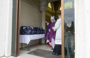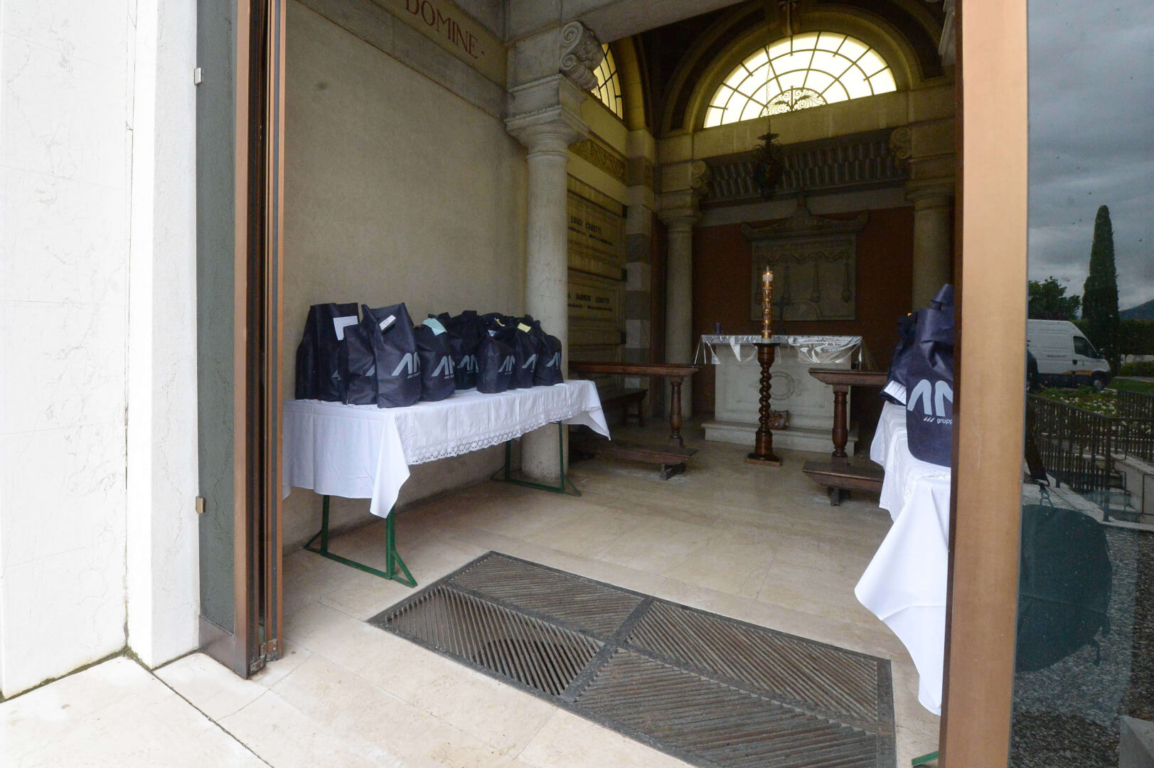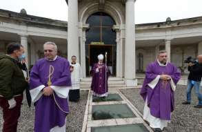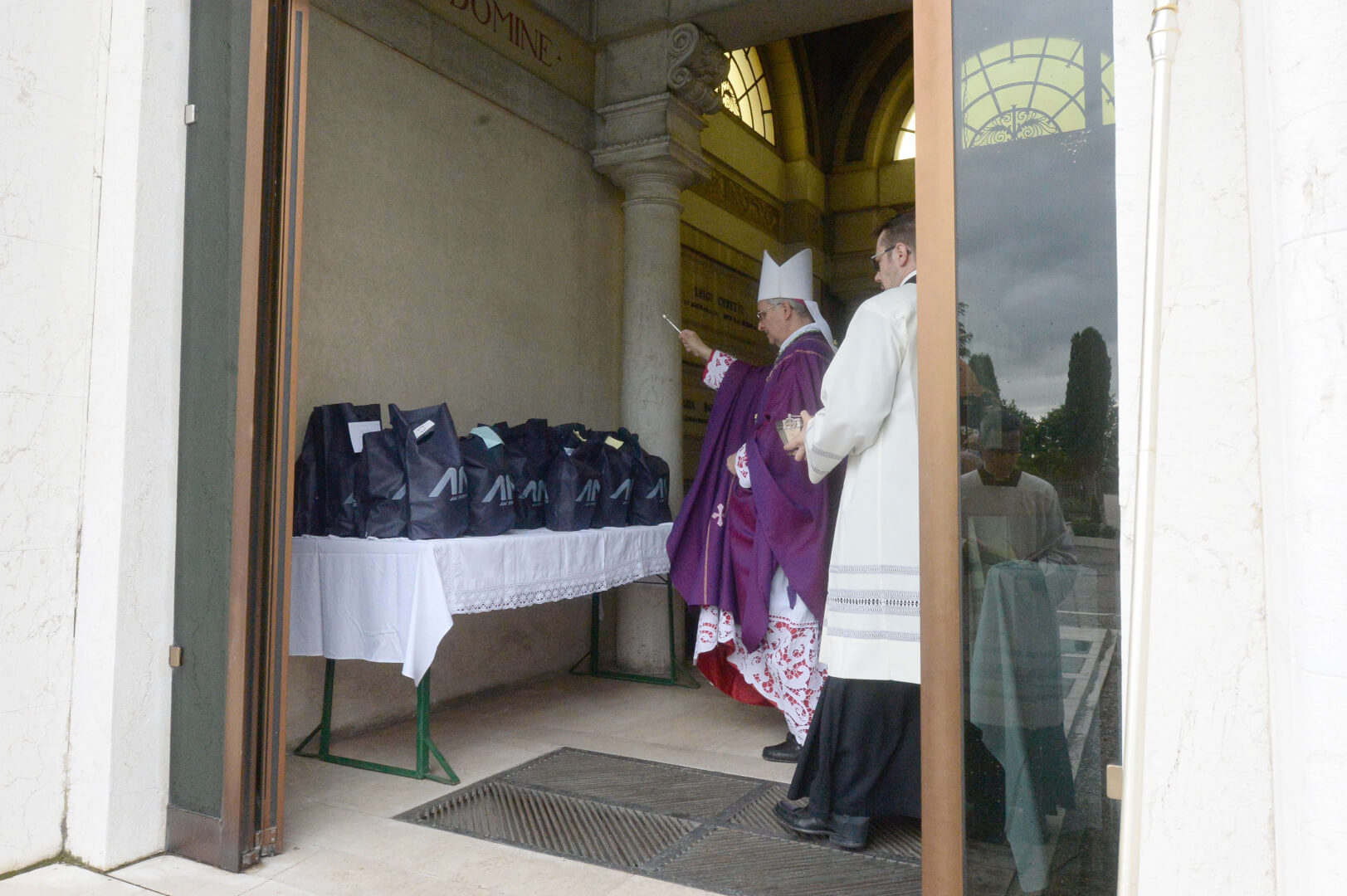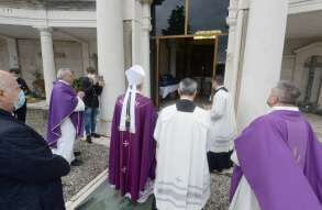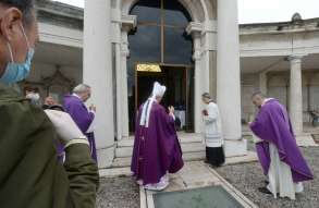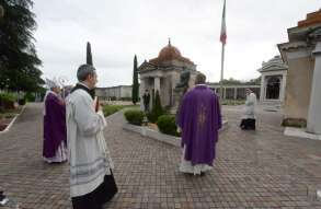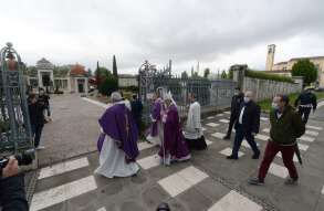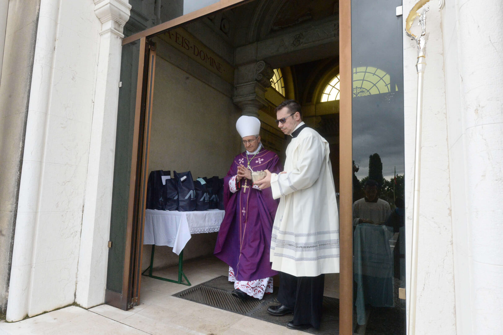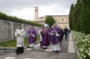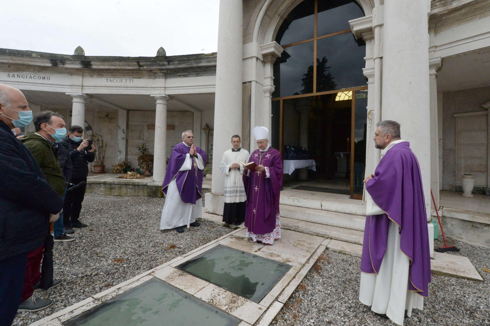 Il vescovo Pierantonio Tremolada questa mattina, lunedì 11 maggio, al cimitero della Volta per la Messa esequiale delle urne cinerarie che qui verranno tumulate