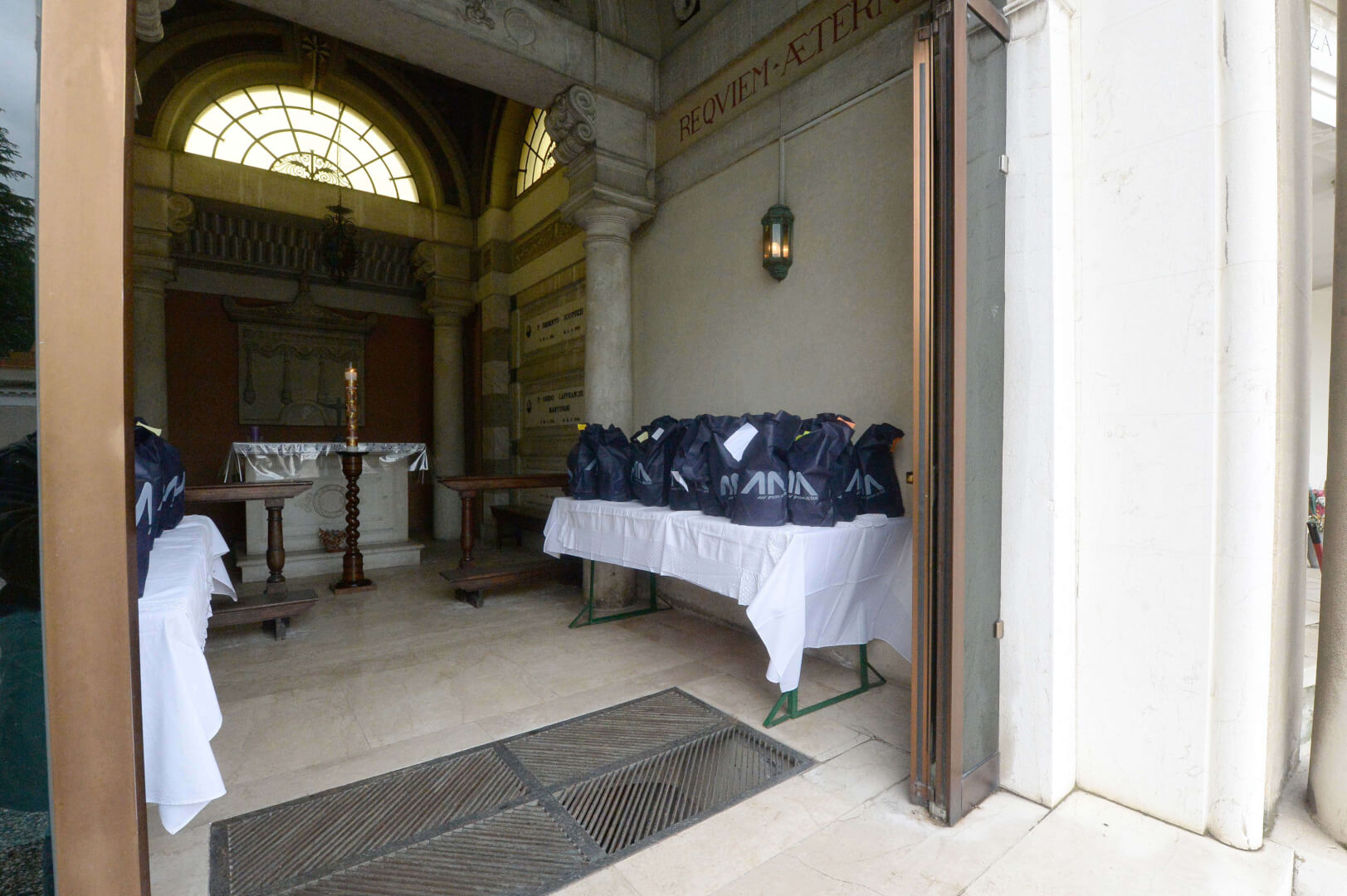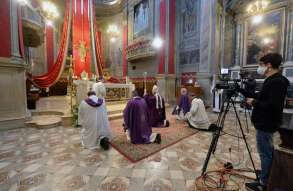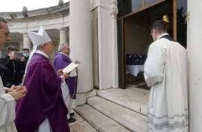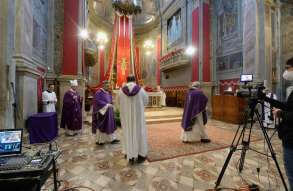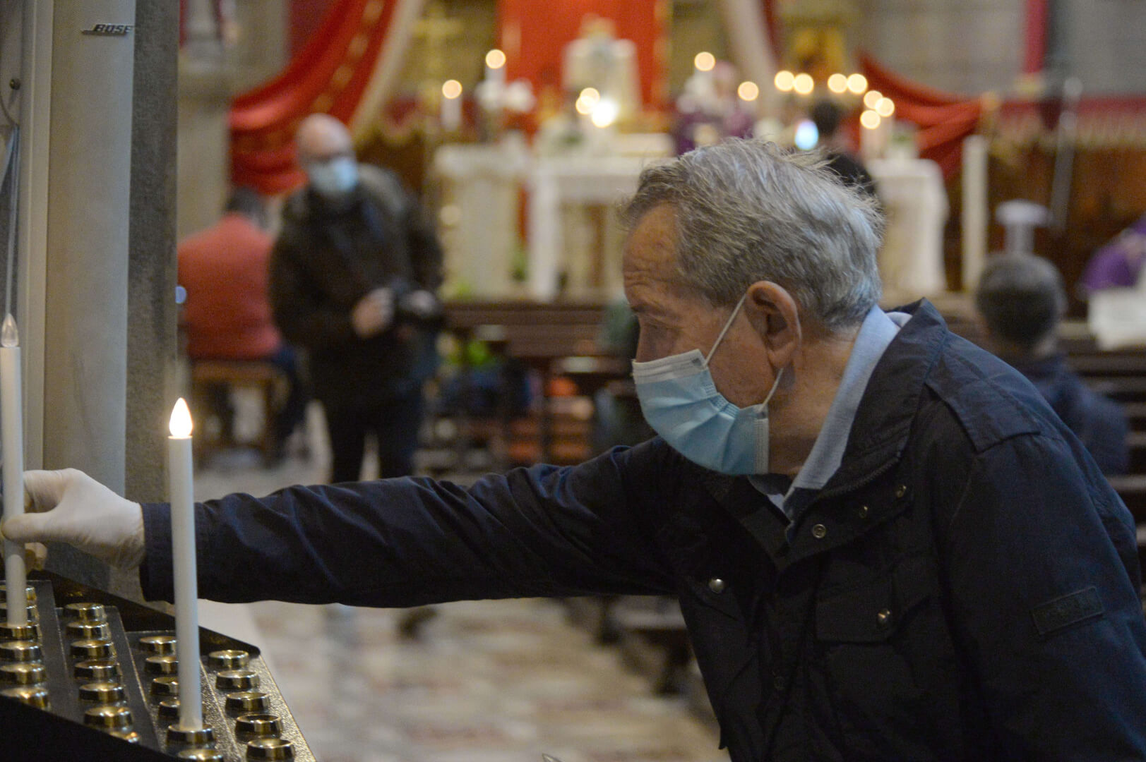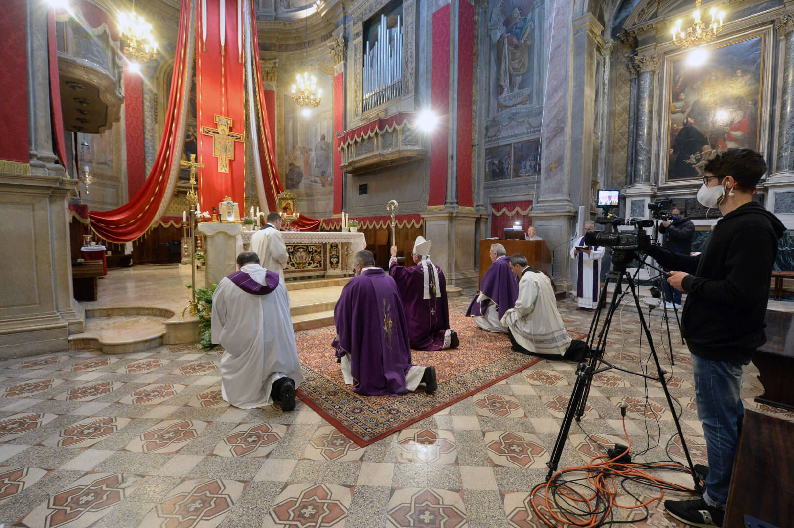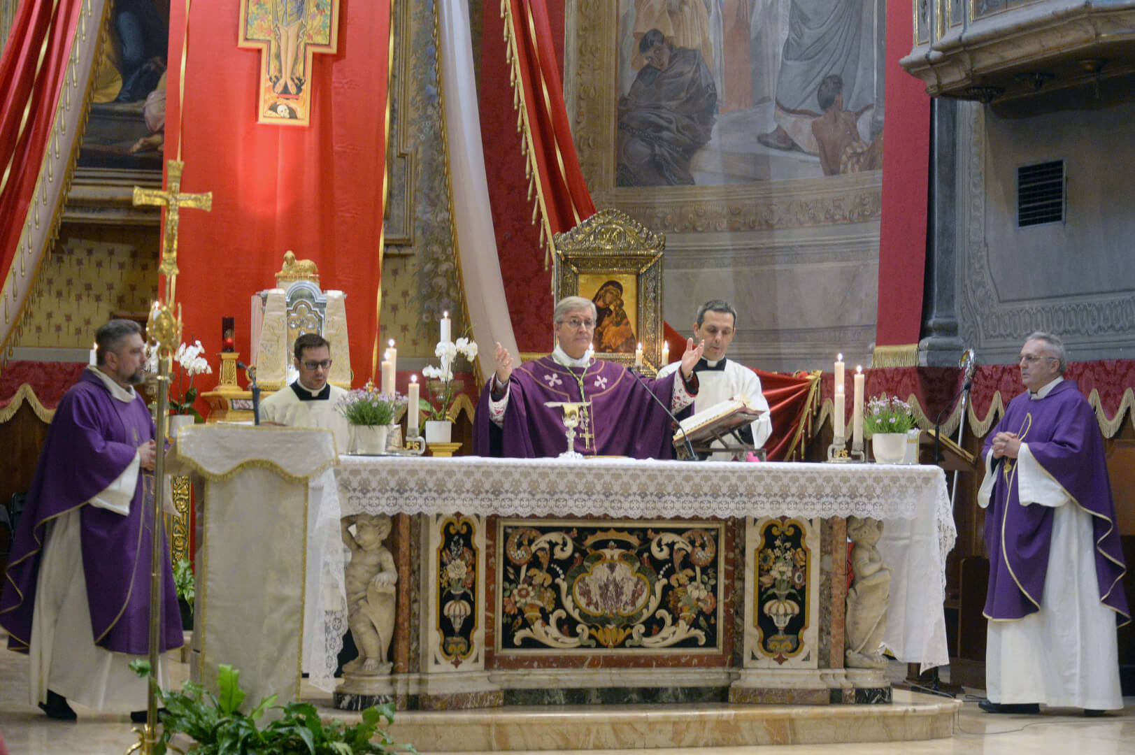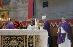 Il vescovo Pierantonio Tremolada questa mattina, lunedì 11 maggio, al cimitero della Volta per la Messa esequiale delle urne cinerarie che qui verranno tumulate