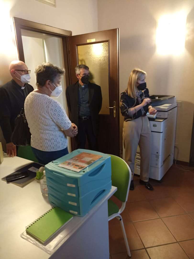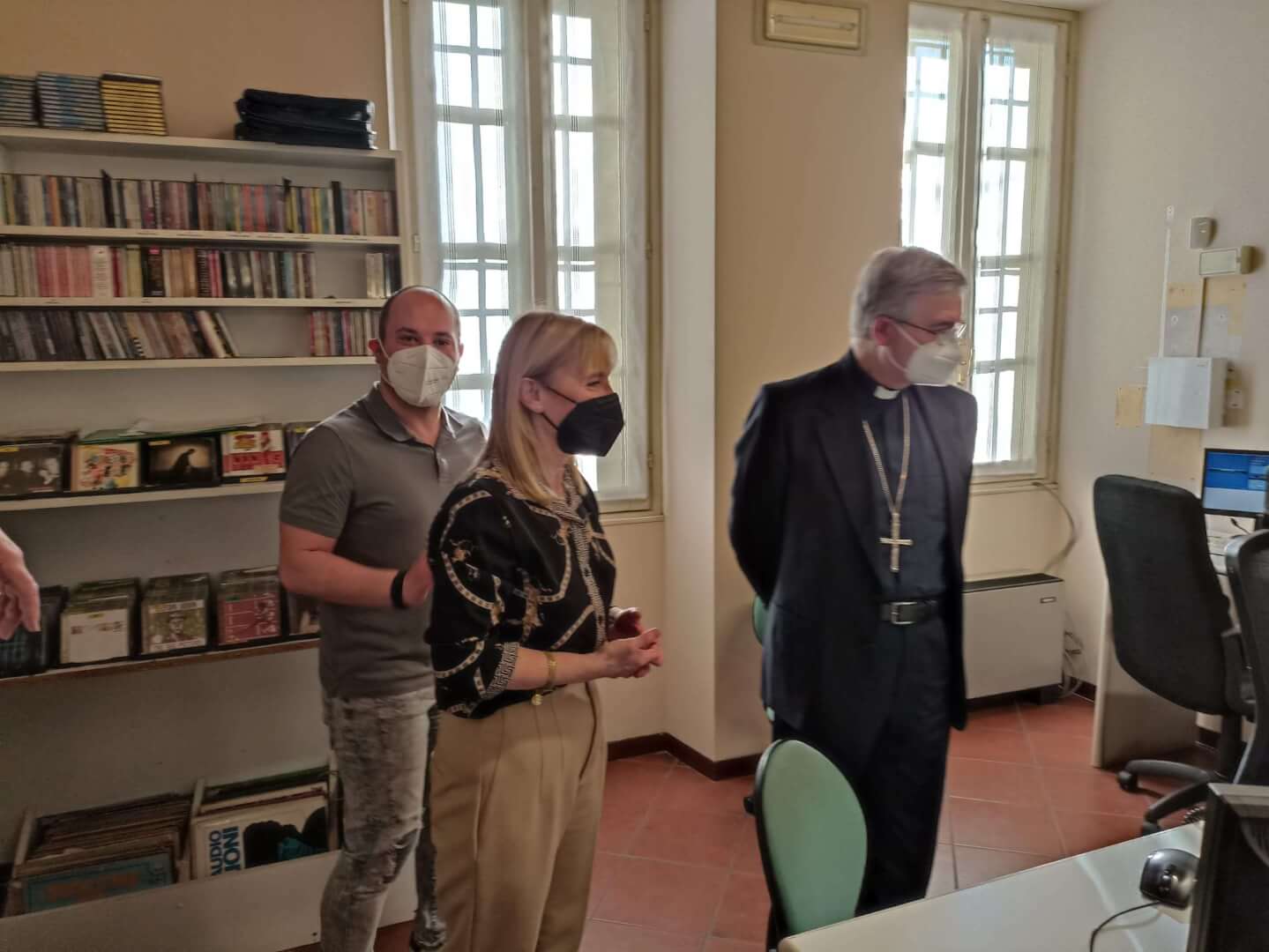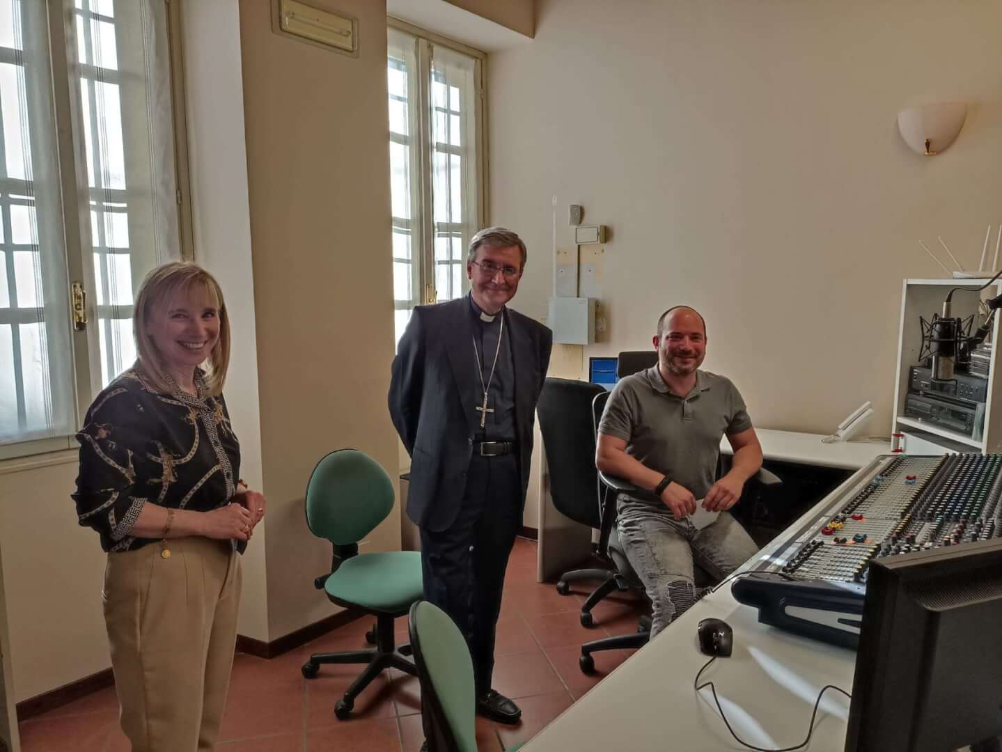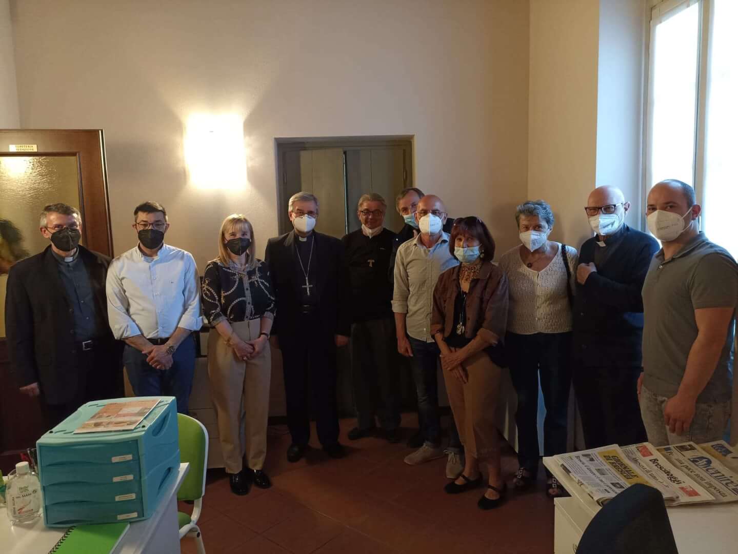 Il vescovo Pierantonio ha incontrato a Castenedolo il personale tra cui il direttore Stefania Brunelli e il tecnico Fabio, alcuni volontari e il Consiglio di amministrazione di Radio Ecz, una radio al servizio della comunità e del territorio diocesano
