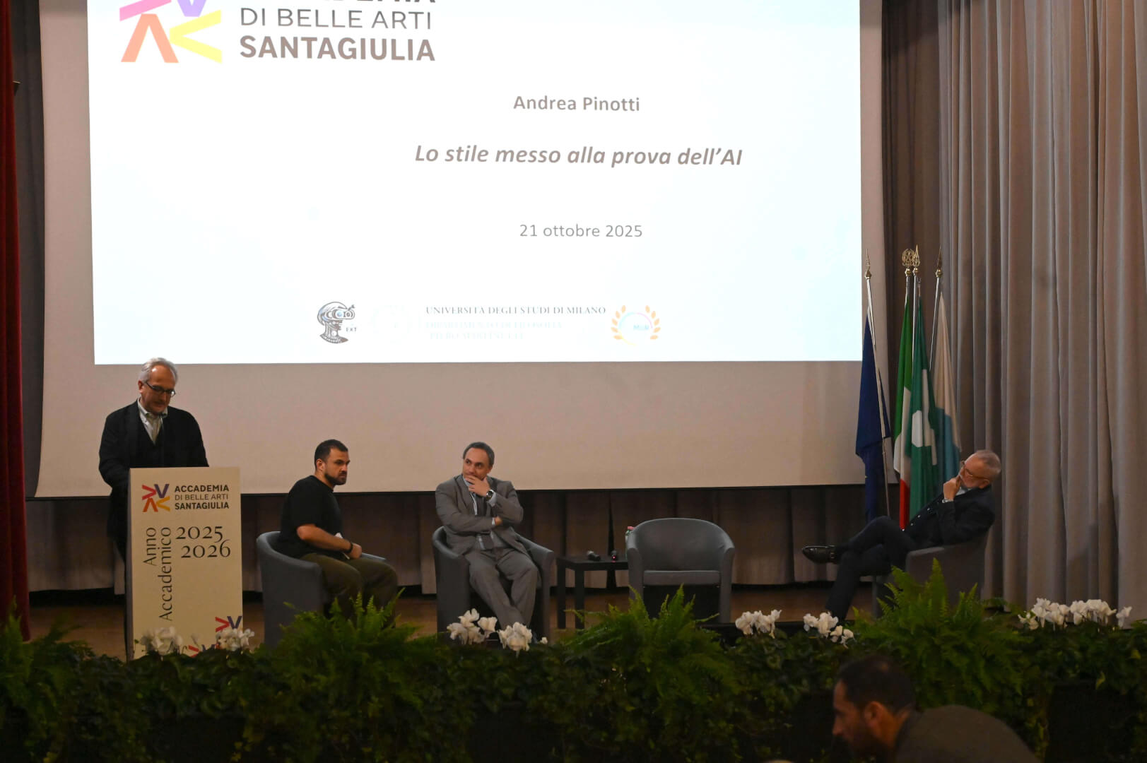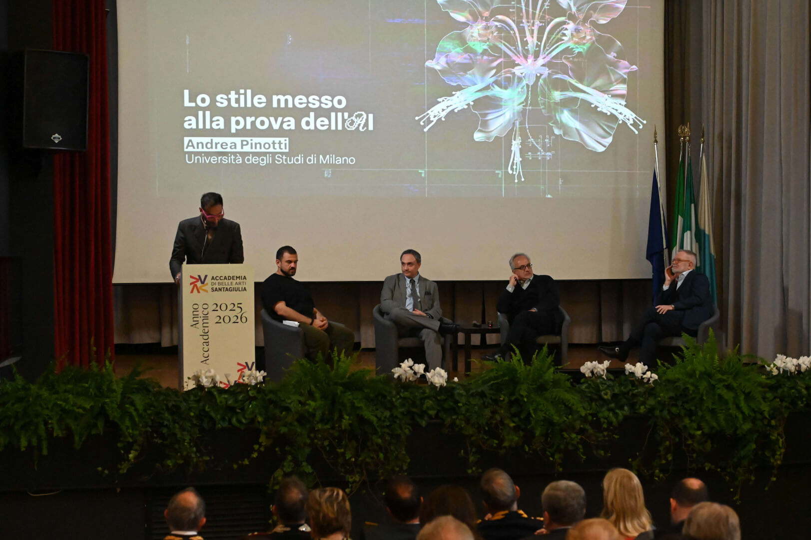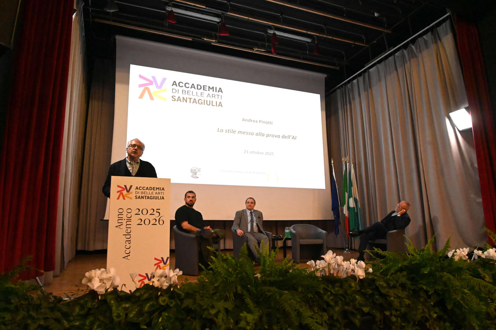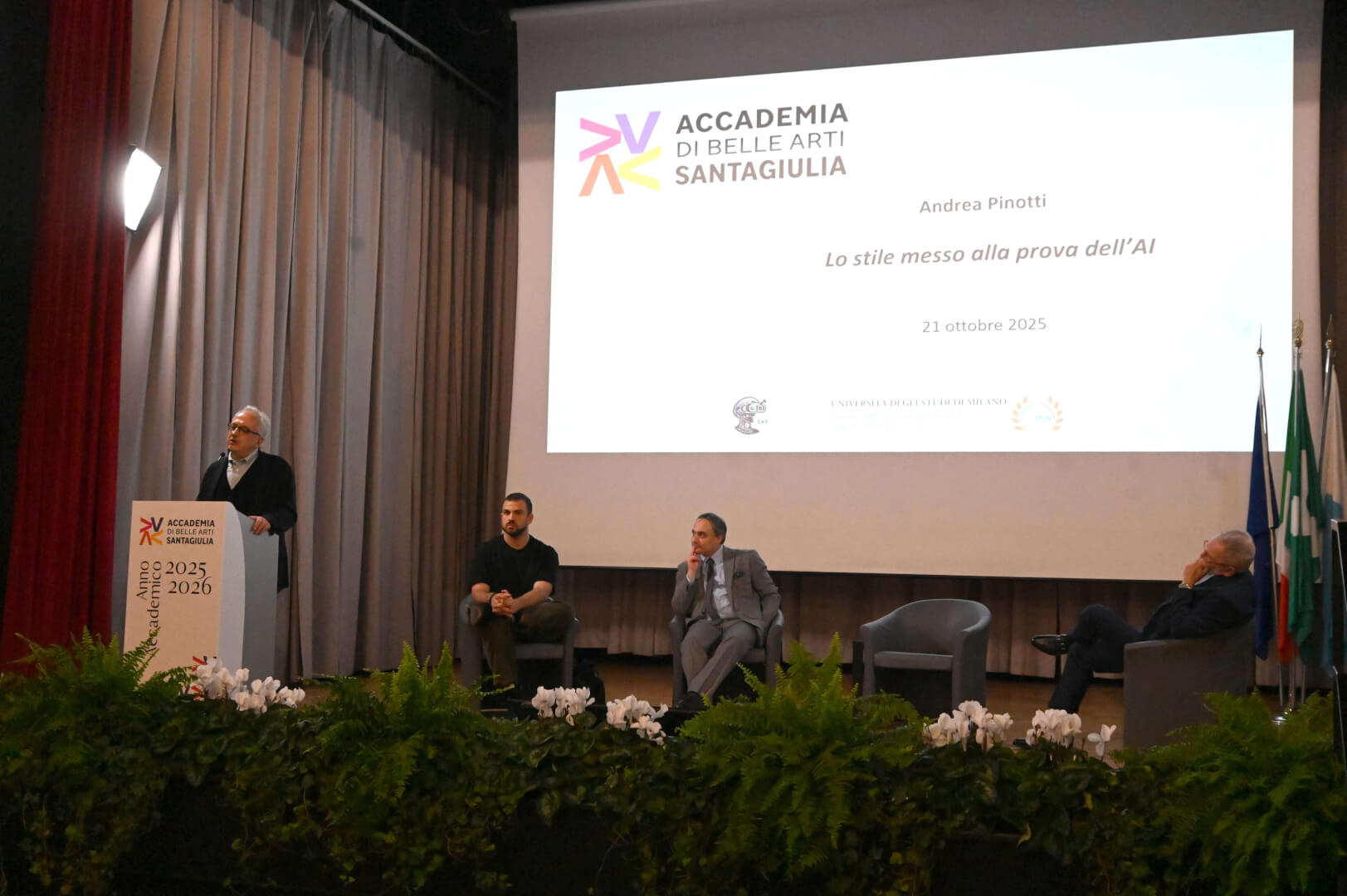 Nella mattinata del 21 ottobre l'Accademia di Belle Arti di Brescia SantaGiulia ha inaugurato l'anno acacdemico. La mattinata è stata arricchita dalla lectio magistralis, "Lo stile messo alla prova dell'AI", tenuta dal professor Andrea Pinotti, filosofo e docente di Estetica presso l'Università degli Studi di Milano “La Statale”, tra i massimi esperti internazionali nell'ambito della cultura visuale