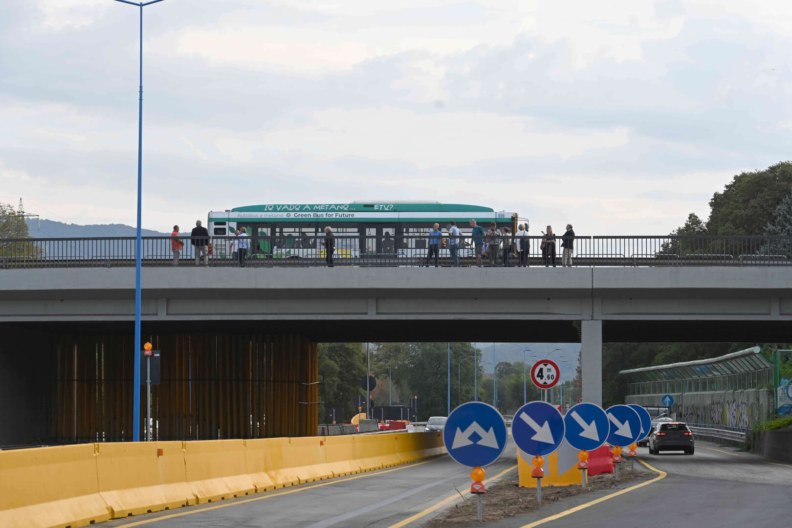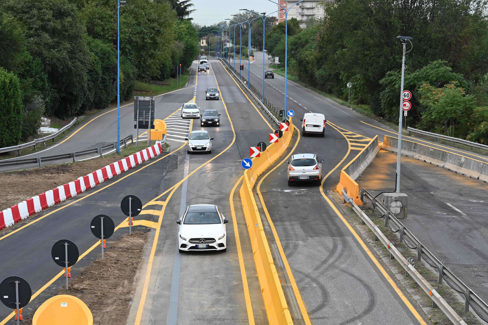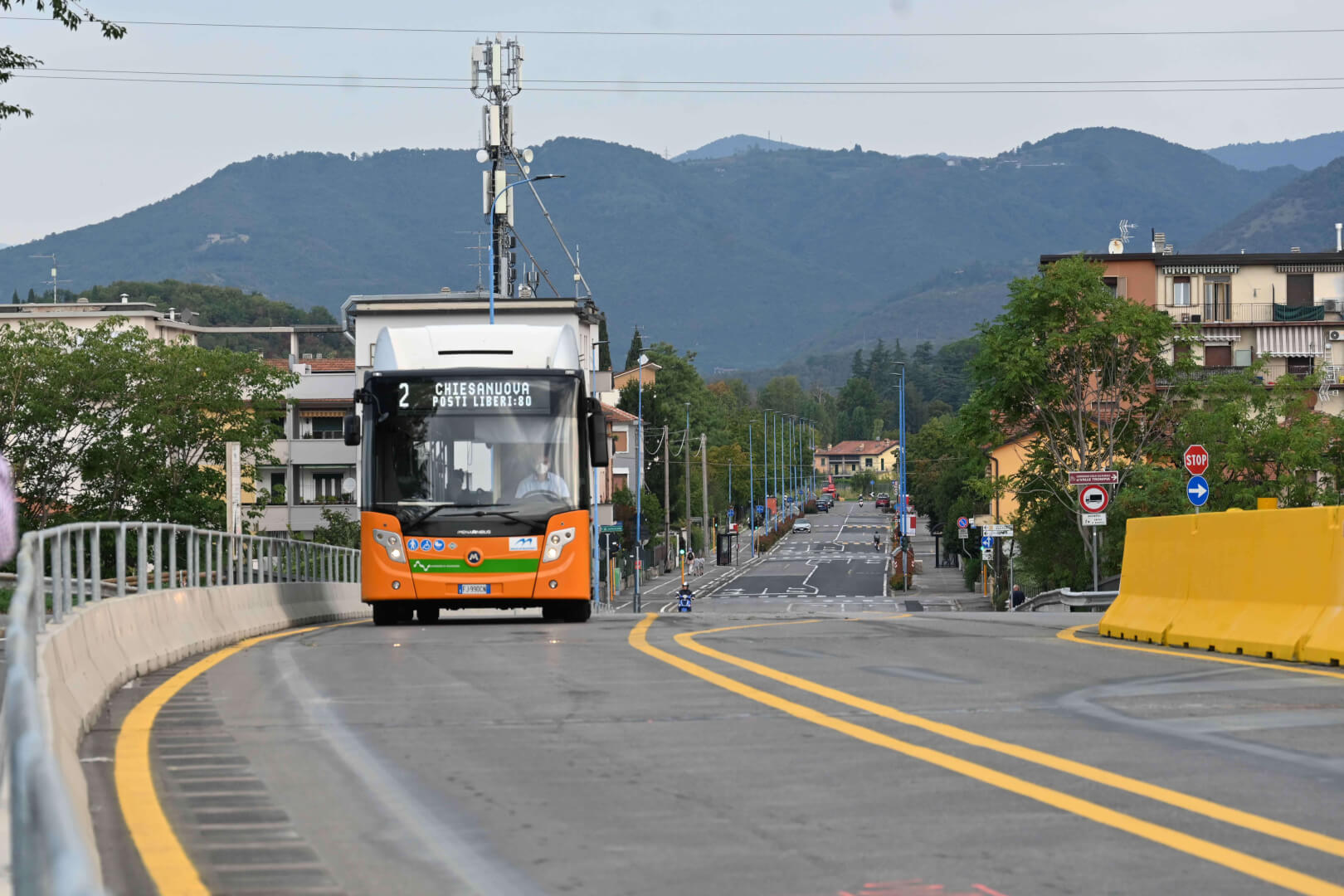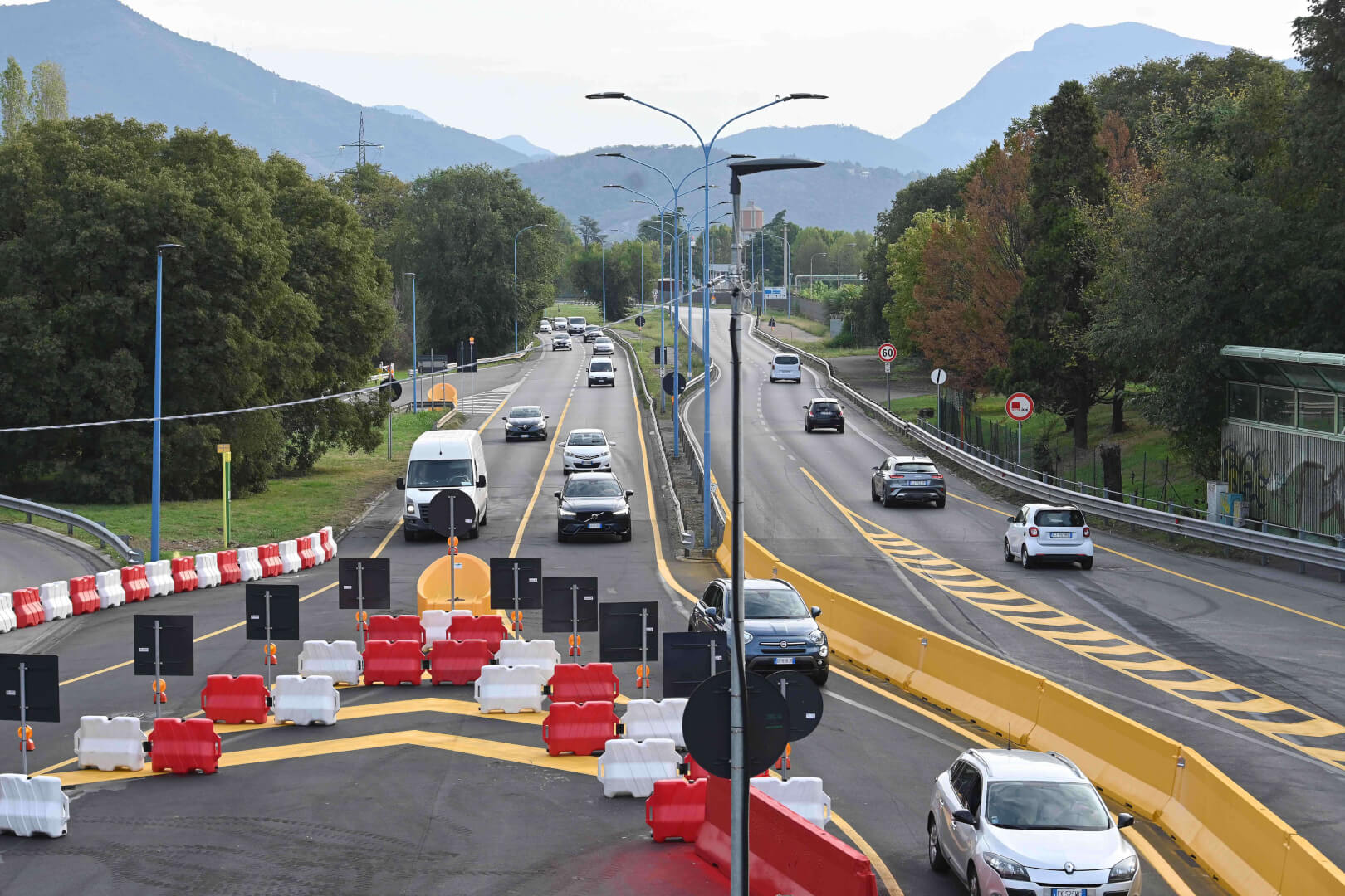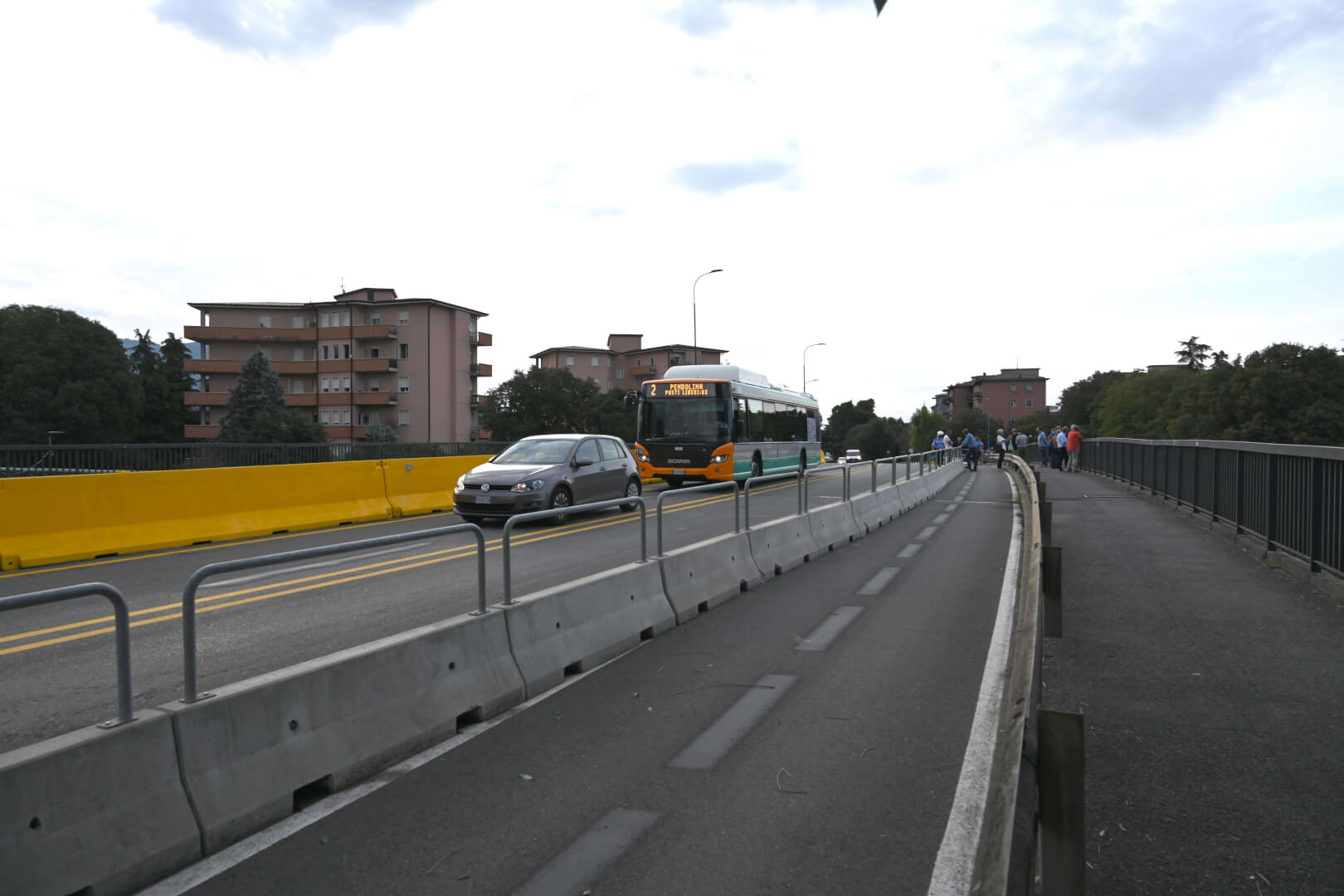 Sono stati posizionati circa cento cartelli in entrambi i tratti stradali e, per garantire un’adeguata separazione della viabilità e una maggior sicurezza, nelle due arterie sono stati installati 400 metri lineari di New Jersey in cemento e 300 in plastica, dipinti di colore giallo come previsto dalla normativa. Infine, sono stati installati i catarifrangenti per garantire la visibilità notturna degli ostacoli. Non è stato trascurato il rapido ripristino della viabilità dolce, particolarmente significativa tra via Volturno e l’Oltremella. Anche la pista ciclo pedonale di via Volturno, infatti, sarà interamente percorribile: sul cavalcavia, la corsia dei pedoni sarà temporaneamente in comune con quella di uno dei due sensi di marcia del percorso ciclabile, come già avviene su altri tracciati ciclopedonali. Infine, con la riapertura del ponte verrà ripristinato il percorso abituale degli autobus del trasporto pubblico.