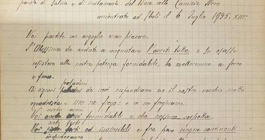 Un discorso di Mussolini apocrifo? Questo è il dilemma che ci pone un foglietto trovato nell’archivio della parrocchia di Sermerio, frazione di Tremosine. In queste poche righe, una mano sconosciuta ha trascritto le parole che Mussolini avrebbe pronunciato ad Eboli il 6 luglio 1935, incitando le partenti Camicie nere per l’Etiopia. Diciamo ‘avrebbe’ perché, ad un primo riscontro con il testo originale, pare che queste non siano le parole precise pronunciate da Mussolini: infatti il testo non coincide (ma lo spirito sì, ci sentiamo di aggiungere). Sembra infatti che il breve discorso fosse stato diffuso in versione, diciamo ‘spuria’, dalla stampa estera, tanto che il partito fascista l’avrebbe fatto rettificare e pubblicare perciò nella versione originale. Da dove vengono dunque queste frasi trascritte a Sermerio? Dal discorso spurio diffuso inizialmente? Da una libera interpretazione dello sconosciuto amanuense? Il punto però è anche un altro: quanto questa retorica tracotante ci richiami ad espressioni che ci giungono da oltreoceano da un altrettanto sprezzante Capo di stato. Gli ingredienti ci sono tutti: la retorica manipolativa di chi attribuisce all’uditorio i sentimenti che vuol suscitare: “partite con orgoglio e con piacere” e ancora “voi siete forti e invincibili”; poi, riferendosi all’Abissinia: “L’avrete tutta” e sarà da mettere “a ferro e a fuoco”. C’è il disprezzo razzista di chi parla “ai paladini dei neri” e c’è l’arroganza del “me ne frego e ce ne freghiamo”. Addirittura si dice che “cinque continenti si inchineranno e tremeranno di fronte alla nostra potenza fascista”. Insomma, ci solletica pericolosi quanto fastidiosi déjà-vu che preferiremmo non ascoltare più.