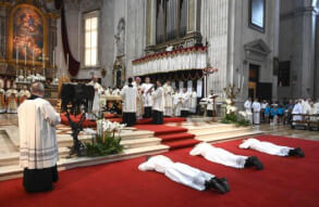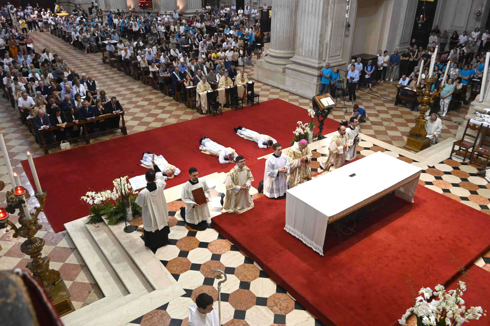 Chiamati a condividere la stessa vocazione di quanti hanno ricevuto il Battesimo, voi diverrete, con la santa unzione che state per ricevere, maestri e pastori del popolo di Dio. Lo sarete – come abbiamo ascoltato dalla lettera agli Efesini – “per rendere idonei i fratelli a compiere il ministero, cioè l’opera di servizio che consentirà loro di edificare il corpo di Cristo”. Vi attende dunque una missione, che è quella di edificare la Chiesa del Signore nella comunione, nella fraternità, nella condivisione delle responsabilità, nella valorizzazione dei diversi doni dello Spirito. Tutti siamo infatti pietre vive di quel santo edificio che è la Chiesa. Se in essa ognuno ha il suo compito, quello dei ministri avrà una forma particolare: essi saranno pastori e maestri secondo la volontà di colui che li ha scelti: mai padroni e sempre servitori, collaboratori della gioia dei propri fratelli nella fede e di ogni uomo che incontreranno sul loro cammino. L’autorità che vi conferisce questo sacramento – cari candidati – non è una onorificenza al merito, non è un privilegio per la vostra gloria personale ma un compito da assolvere in fedele obbedienza. La regola sarà quell’amore gratuito e generoso.