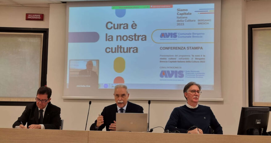 "Cura è la nostra Cultura" è il titolo scelto per il progetto promosso da Avis Comunale di Bergamo e di Brescia, insieme alle consorelle Provinciali, Avis Nazionale e Regionale Lombardia, in vista di Bergamo Brescia Capitale Italiana della Cultura 2023. L’iniziativa vuole rappresentare un significativo momento di testimonianza per quanto riguarda l’impegno avisino delle due province, in base allo statuto associativo che indica la strada per “promuovere la donazione di sangue - intero o di una sua frazione - volontaria, periodica, associata, gratuita, anonima e consapevole, intesa come valore umanitario universale ed espressione di solidarietà e di civismo, che configura il donatore quale promotore di un primario servizio socio-sanitario ed operatore della salute, anche al fine di diffondere nella comunità locale i valori della solidarietà, della partecipazione sociale e civile e della tutela del diritto alla salute”.