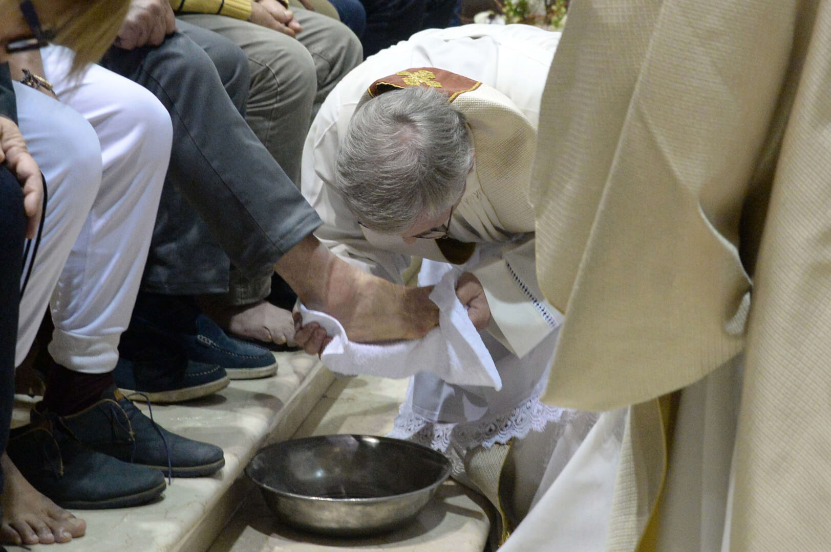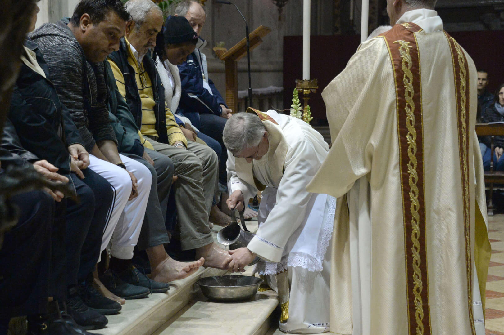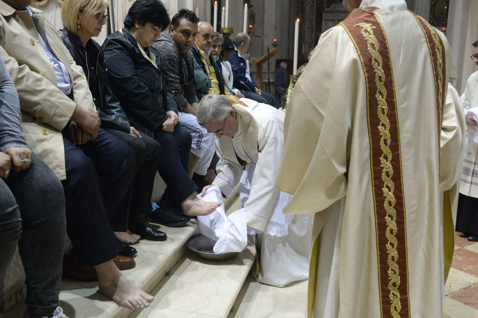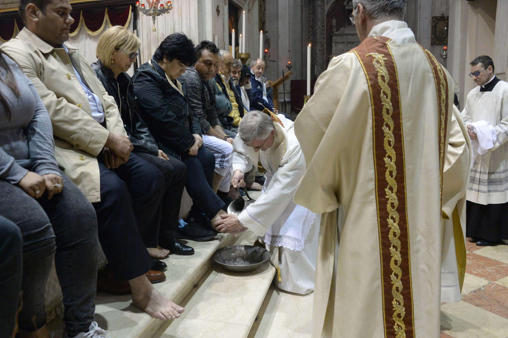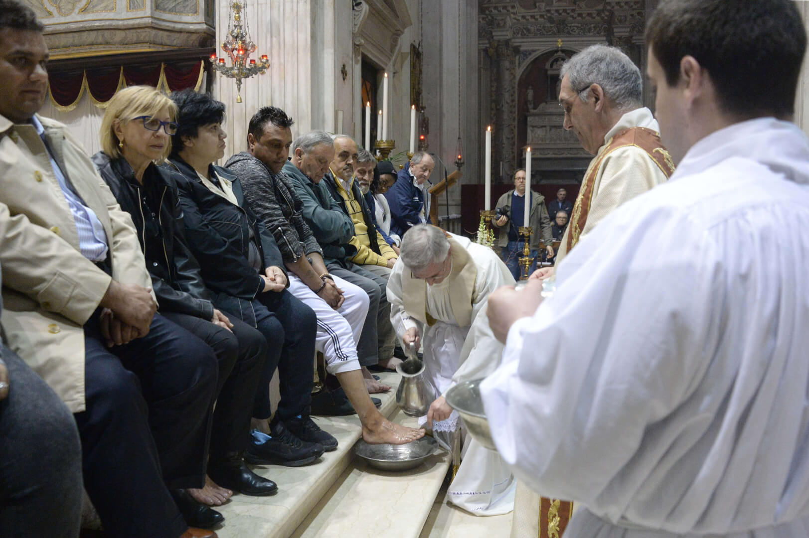 Nella Messa “In Coena Domini”, Il vescovo Pierantonio ha ripetuto il gesto della lavanda dei piedi a 12 persone fra ospiti e operatori del dormitorio S. Vincenzo