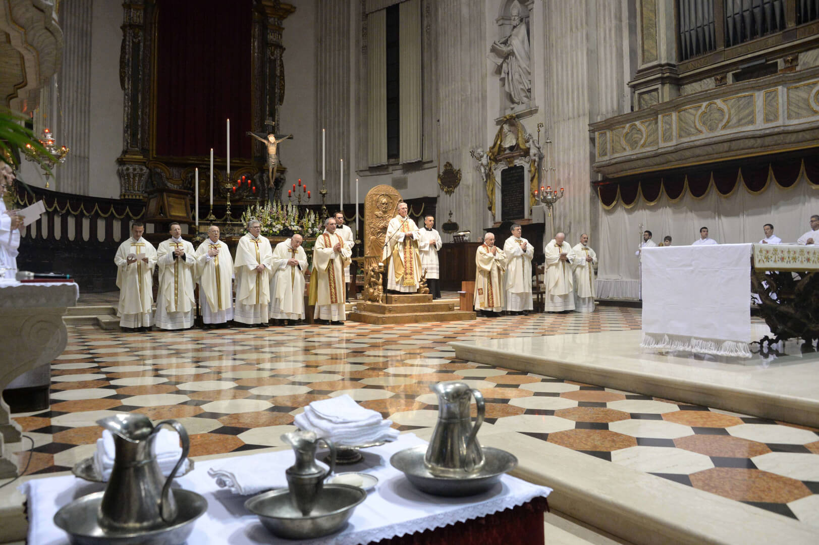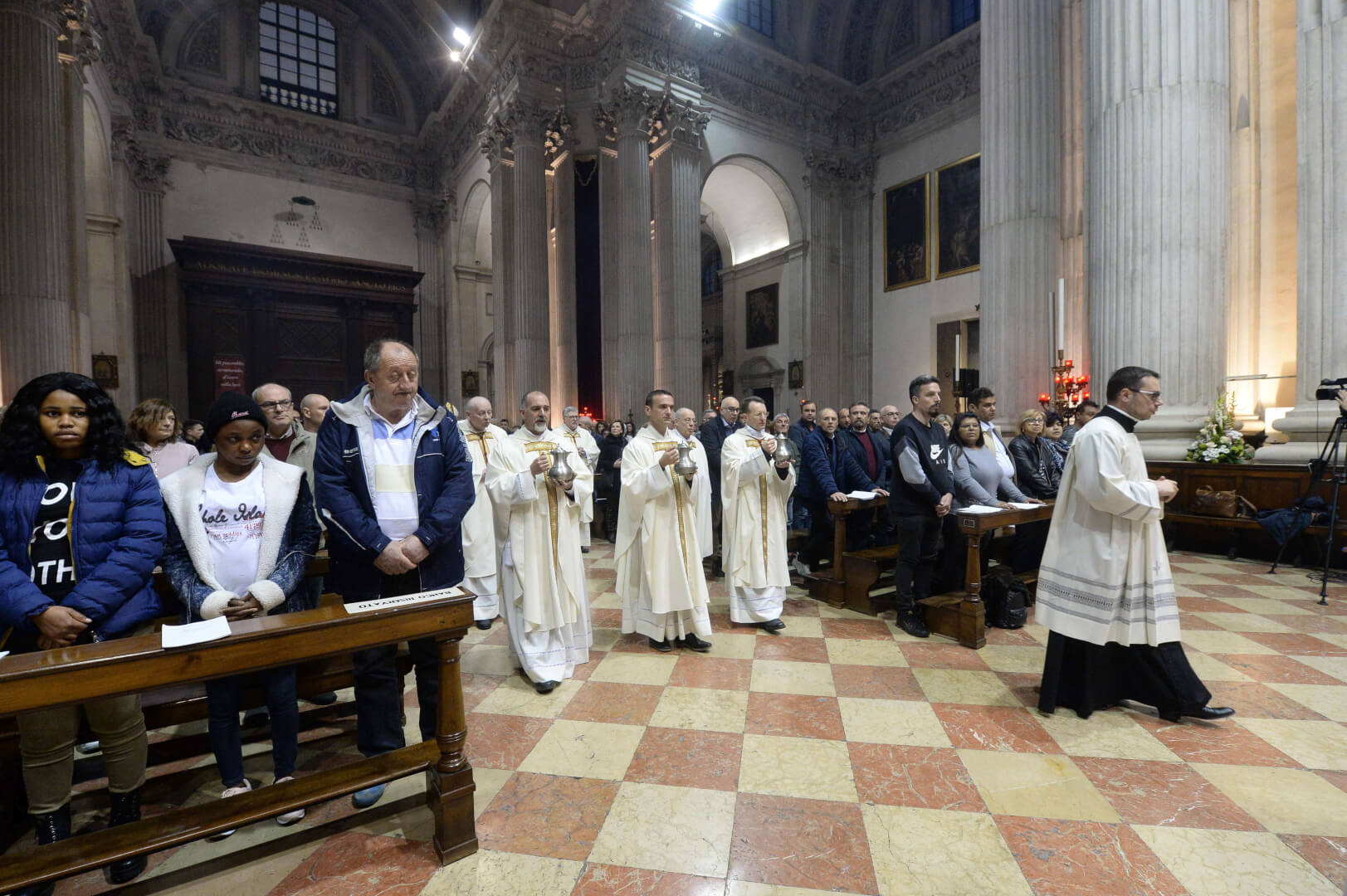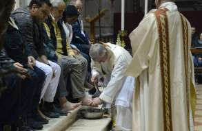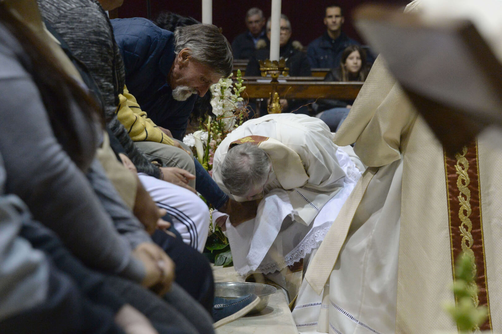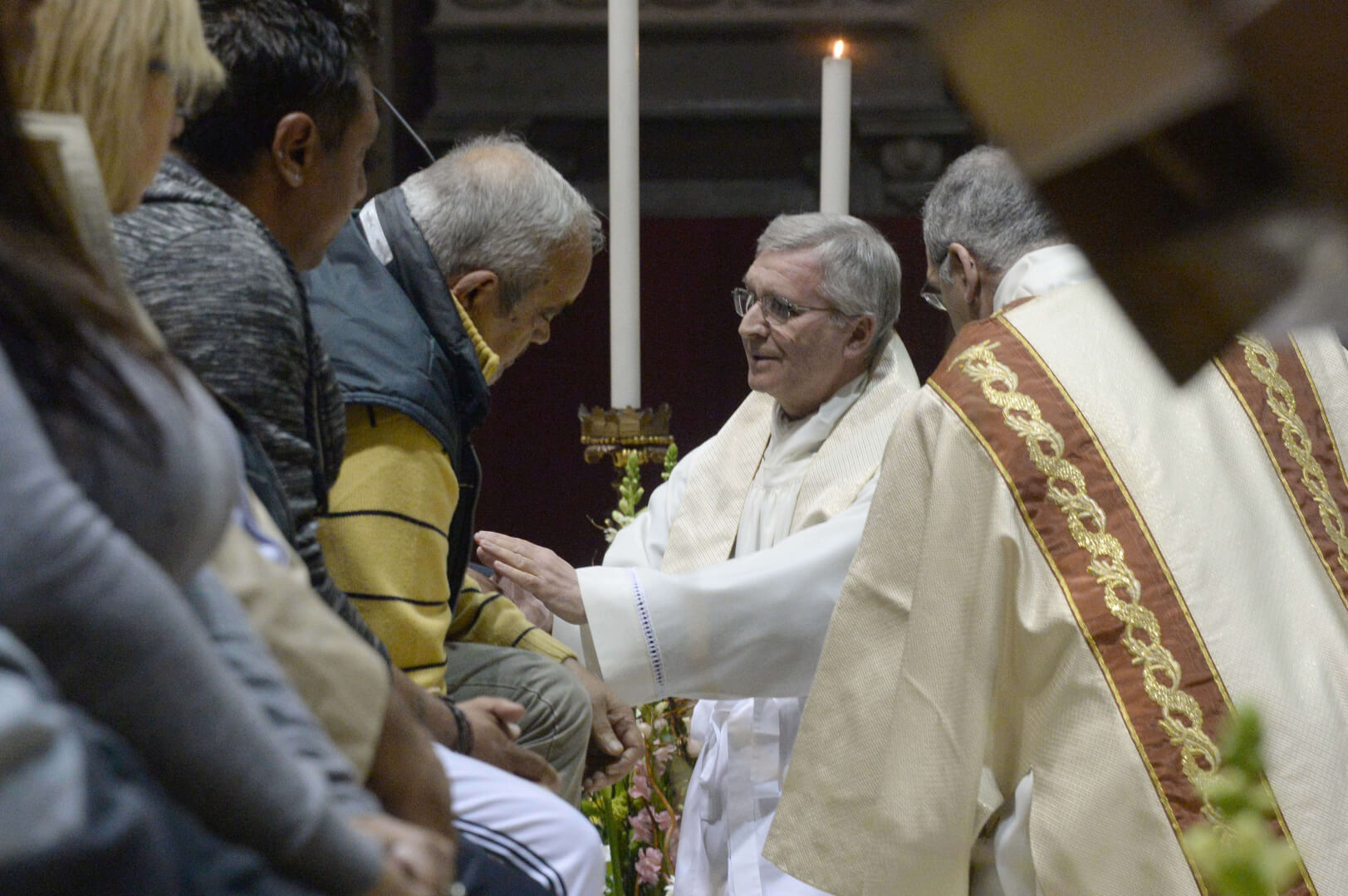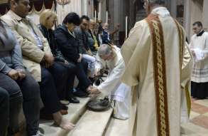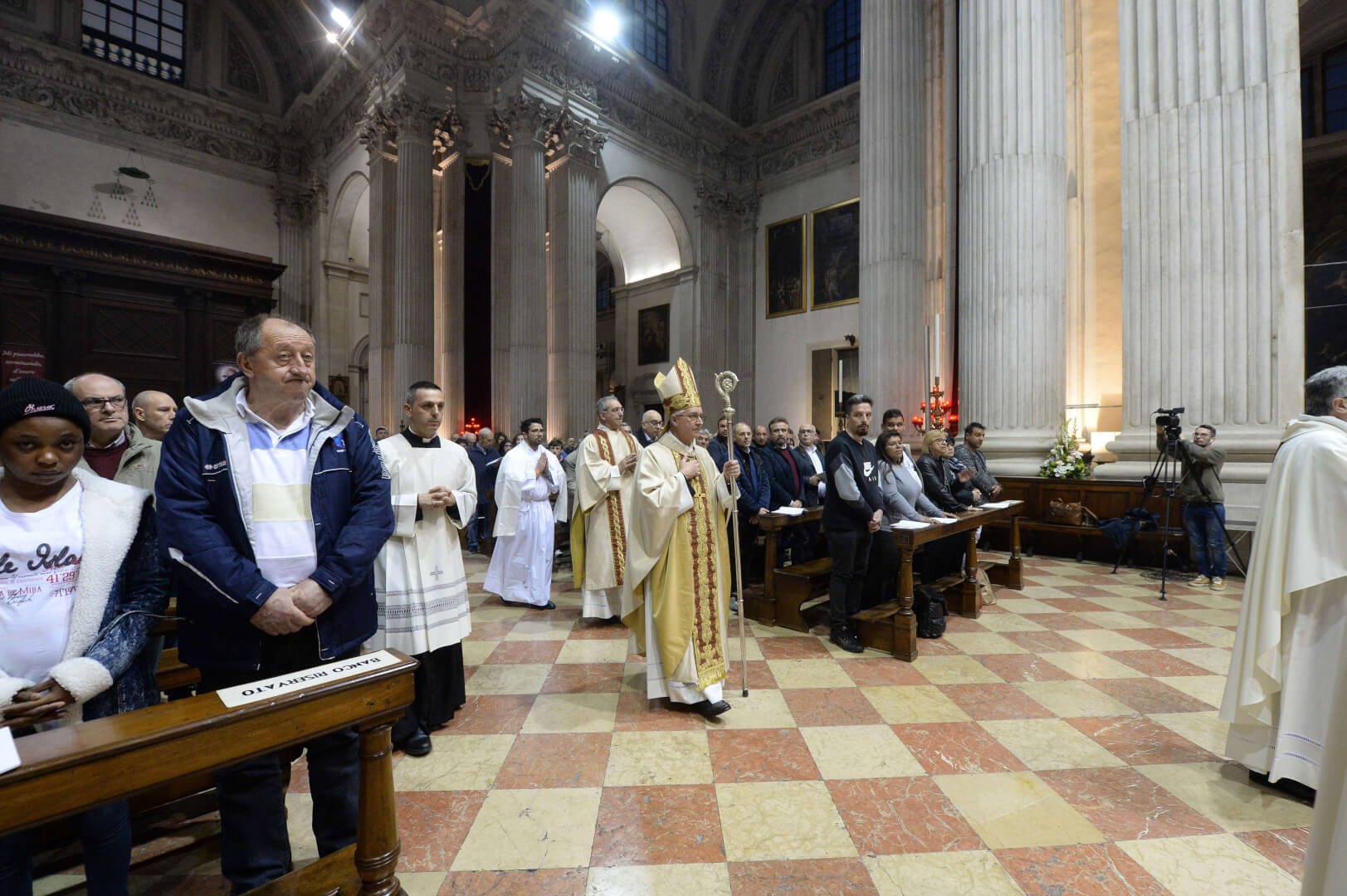 Nella Messa “In Coena Domini”, Il vescovo Pierantonio ha ripetuto il gesto della lavanda dei piedi a 12 persone fra ospiti e operatori del dormitorio S. Vincenzo