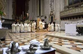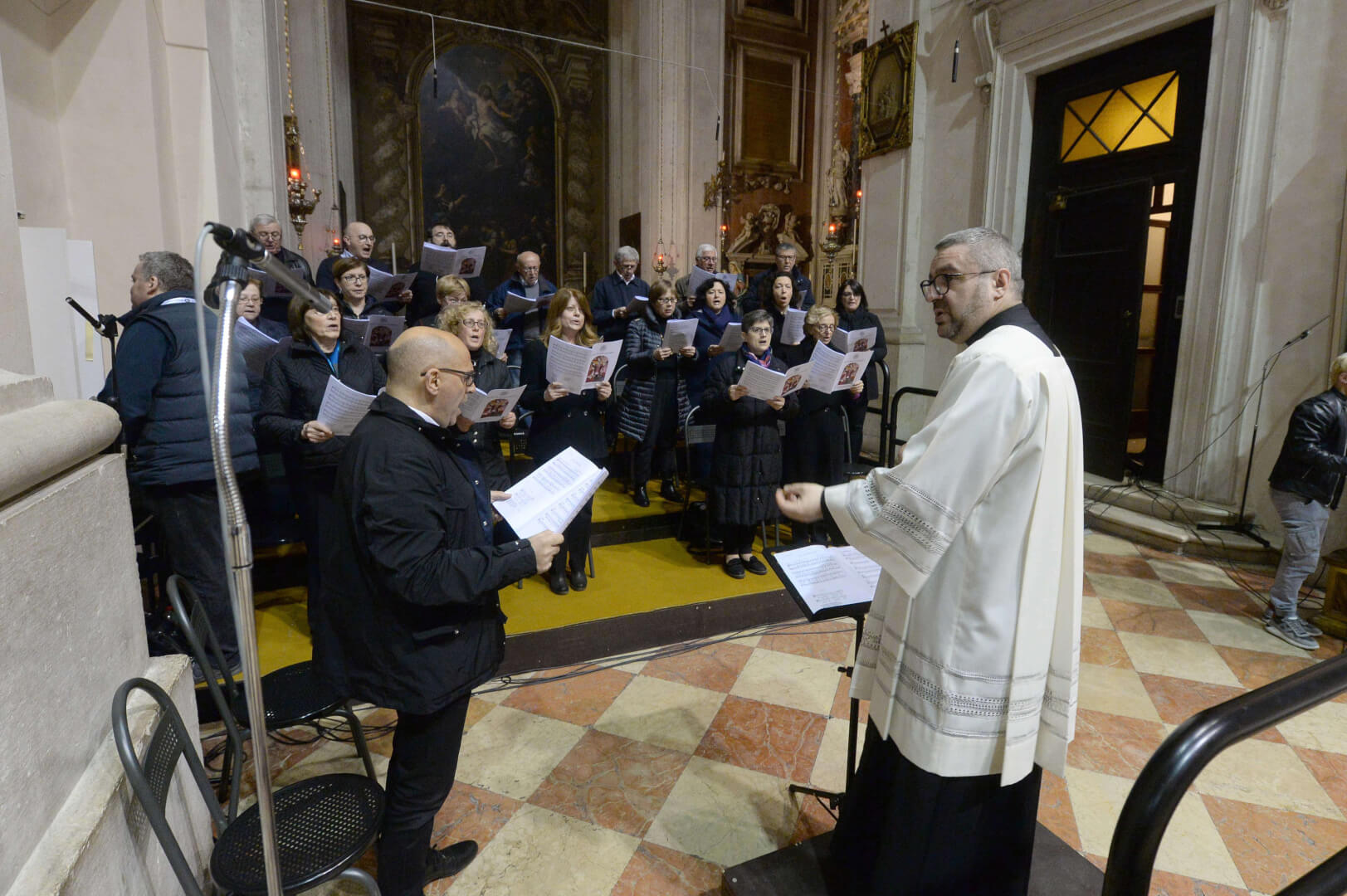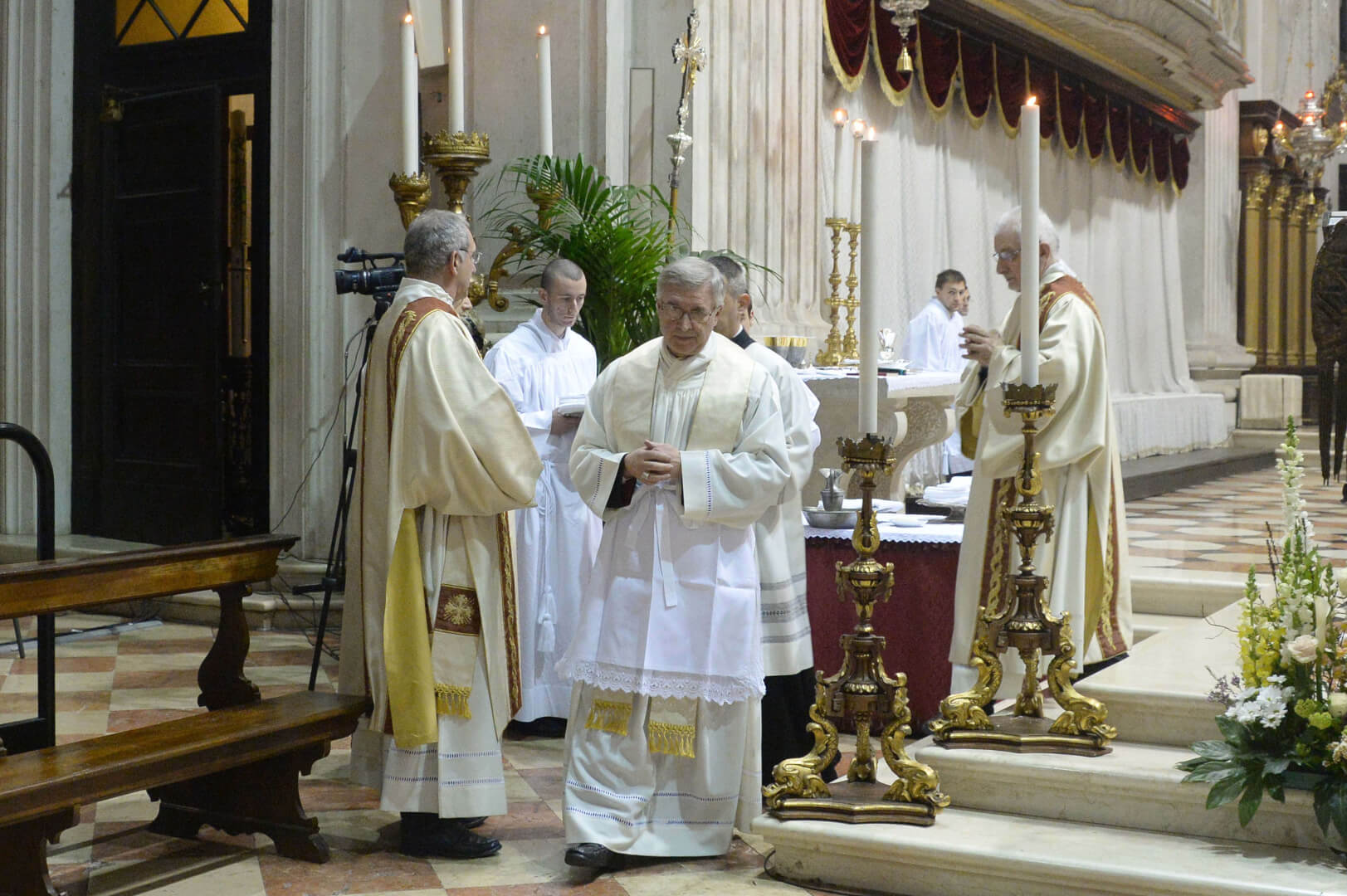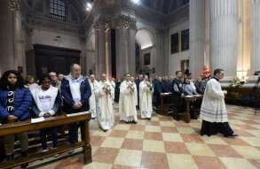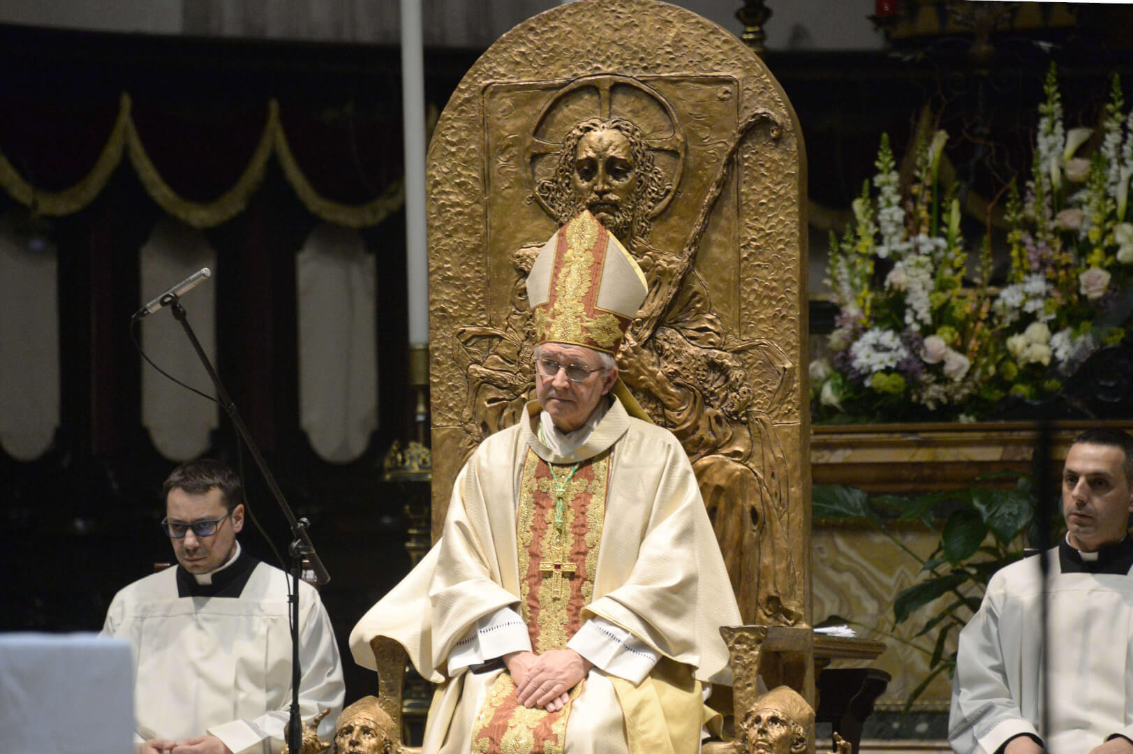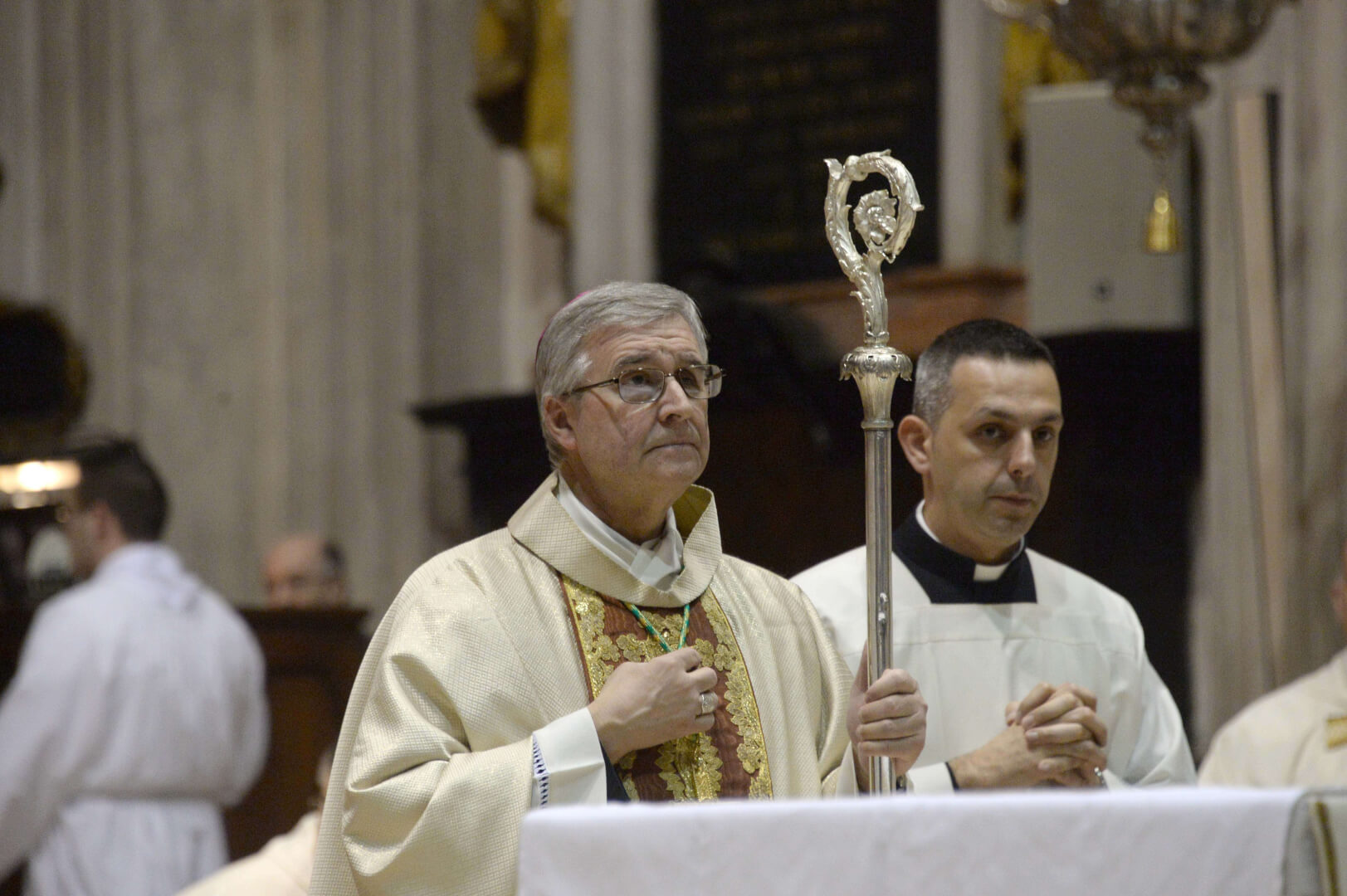 Nella Messa “In Coena Domini”, Il vescovo Pierantonio ha ripetuto il gesto della lavanda dei piedi a 12 persone fra ospiti e operatori del dormitorio S. Vincenzo