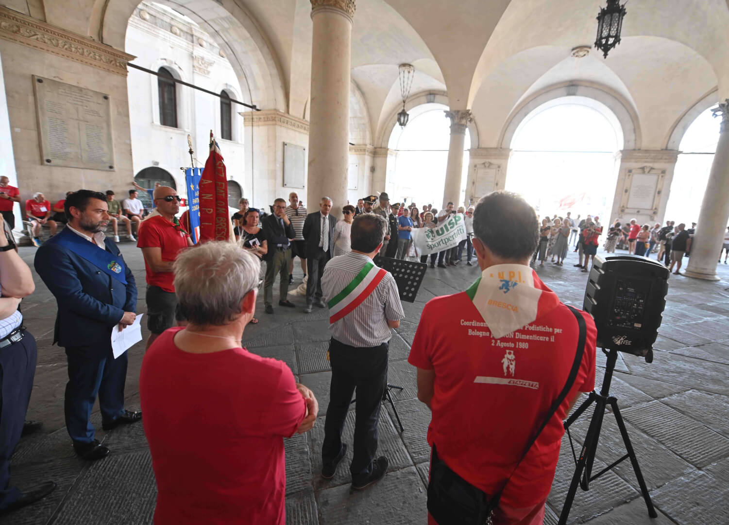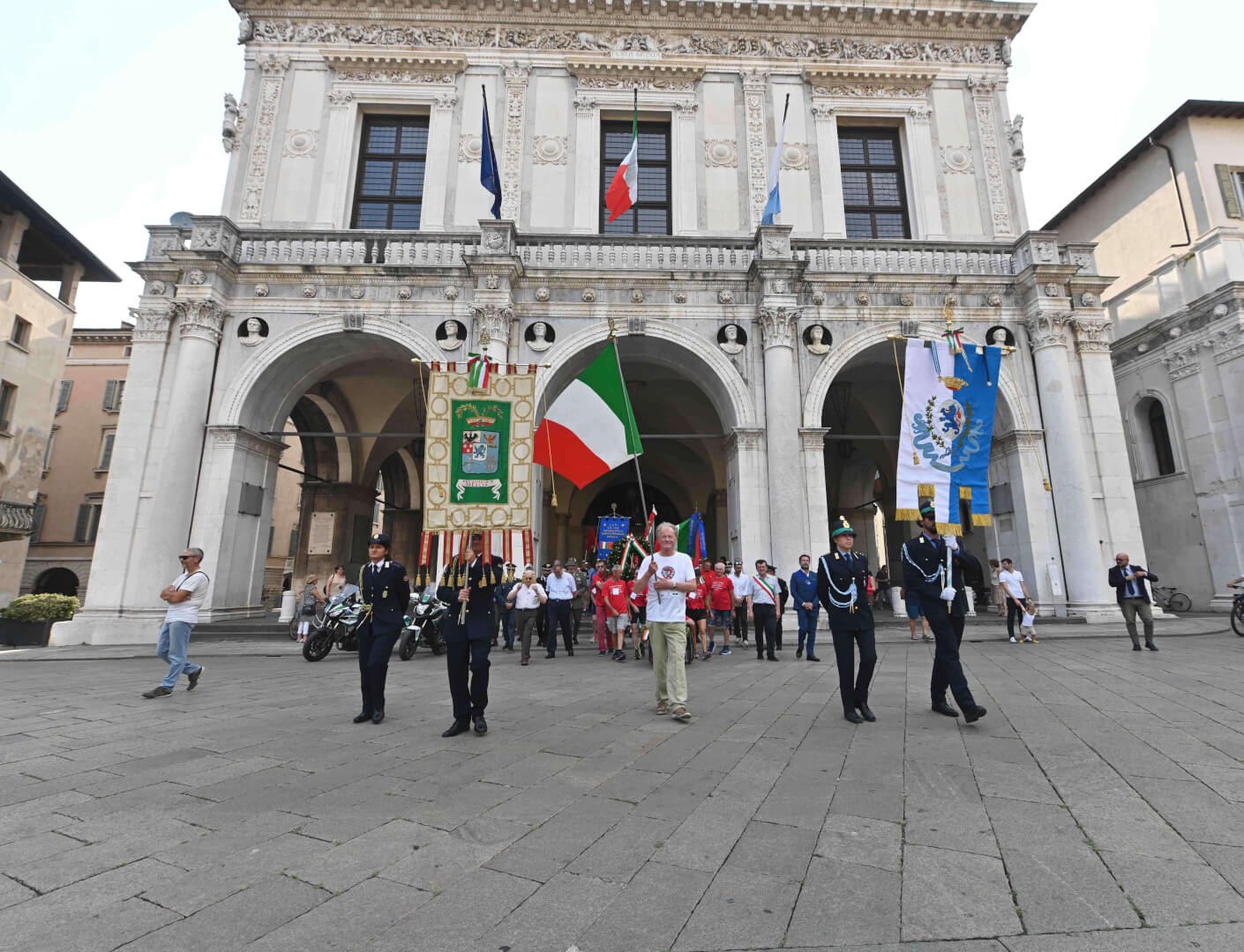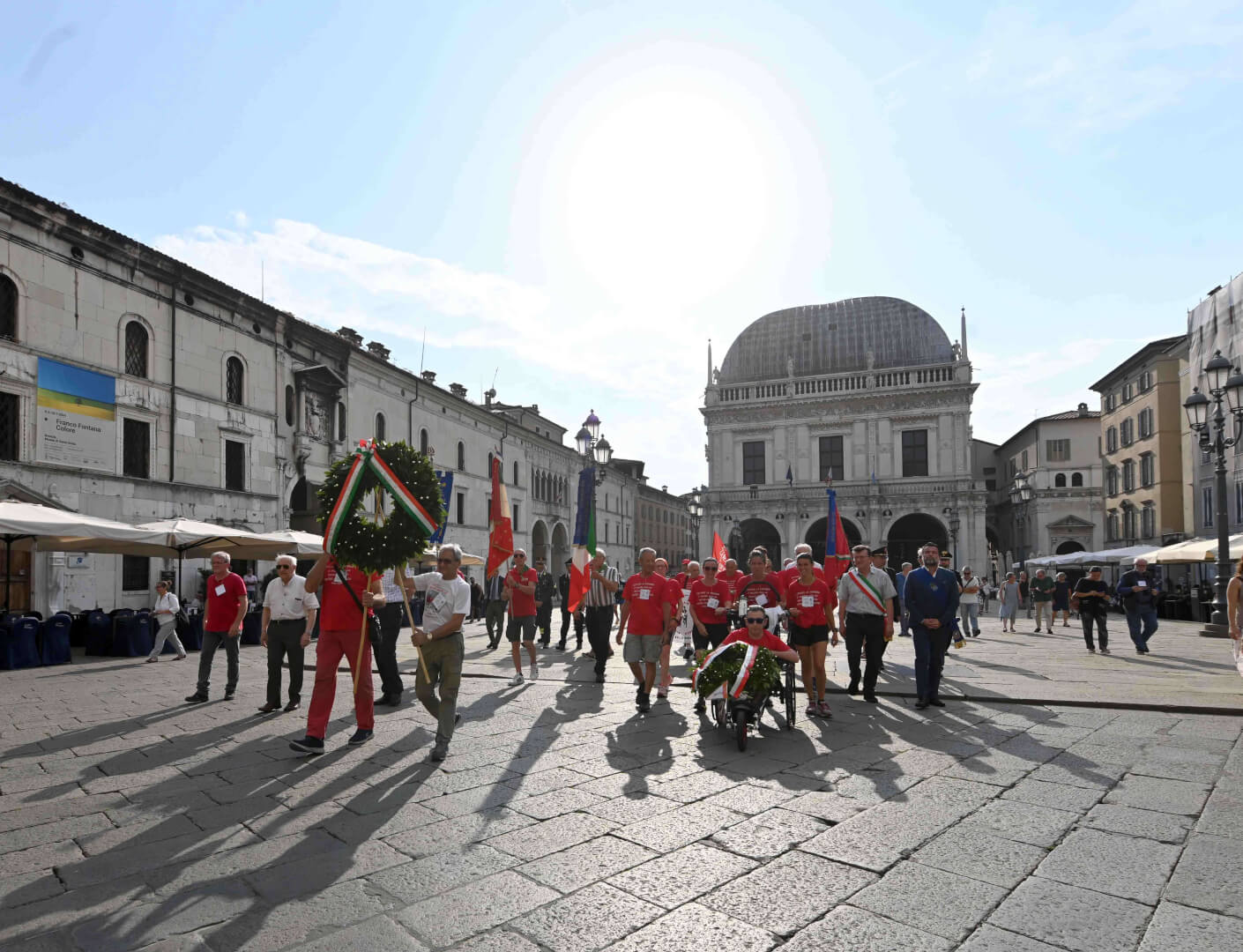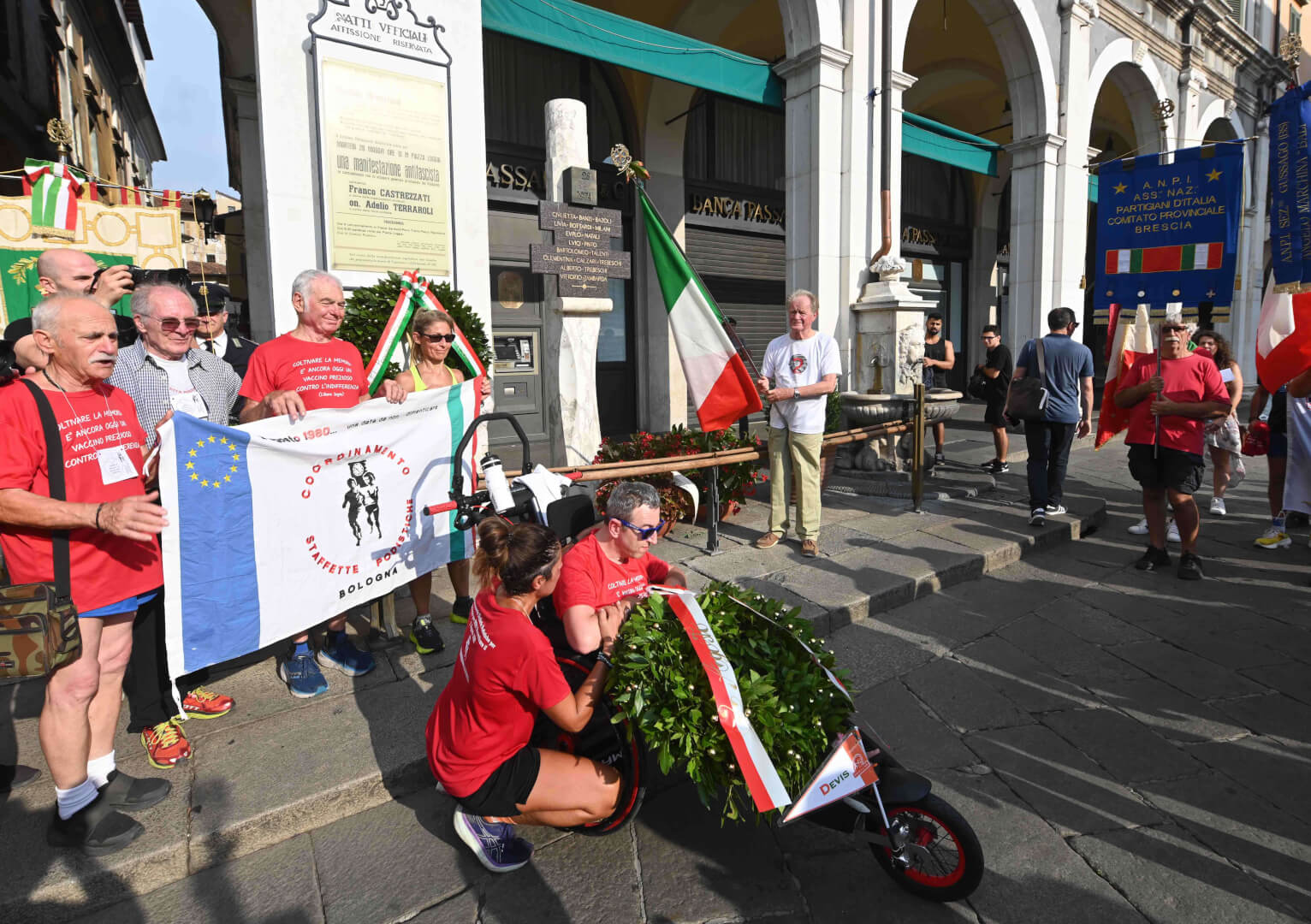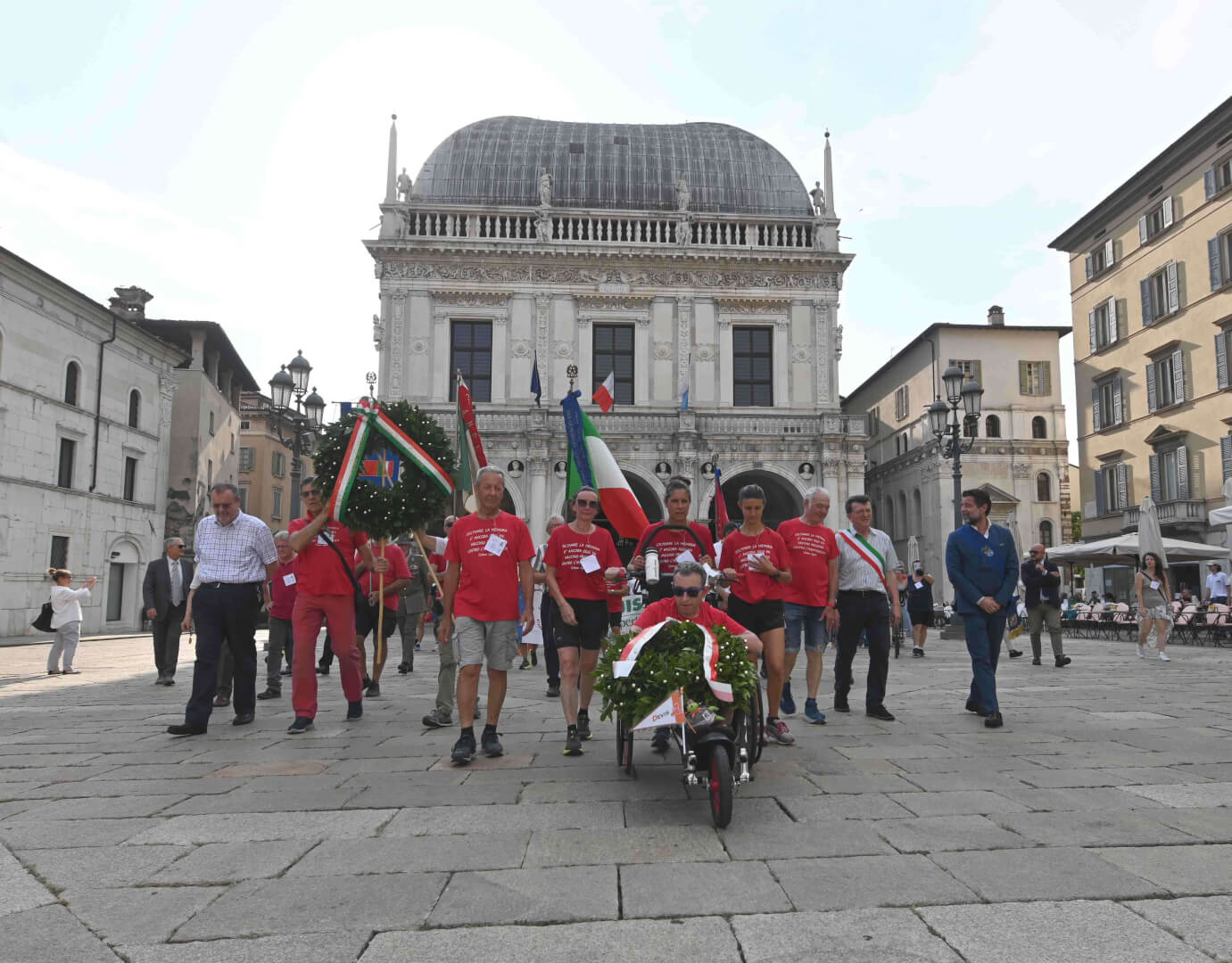 Immagini di “Momenti di memoria per non dimenticare” la staffetta podistica per ricordare le città colpite dalle stragi terroristiche di Milano/Brescia/Bologna. I podisti bresciani, con una rappresentativa bolognese, sono partiti dalla sede degli alpini di Roncadelle, percorrendo via Fratelli Cervi, via Violino di Sotto, via Valcamonica, via Milano (con breve sosta al Cimitero Vantiniano), piazzale Garibaldi, contrada del Carmine, via San Faustino e largo Formentone. In piazza della Loggia sono stati accolti sotto il porticato della Loggia da Autorità a Associazioni cittadine e dalla Banda cittadina “Isidoro Capitanio”. Dopo l’omaggio alla Stele delle Stragi, e il saluto delle autorità cittadine, la ripartenza per Bologna.