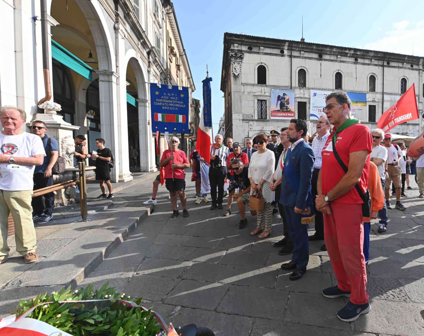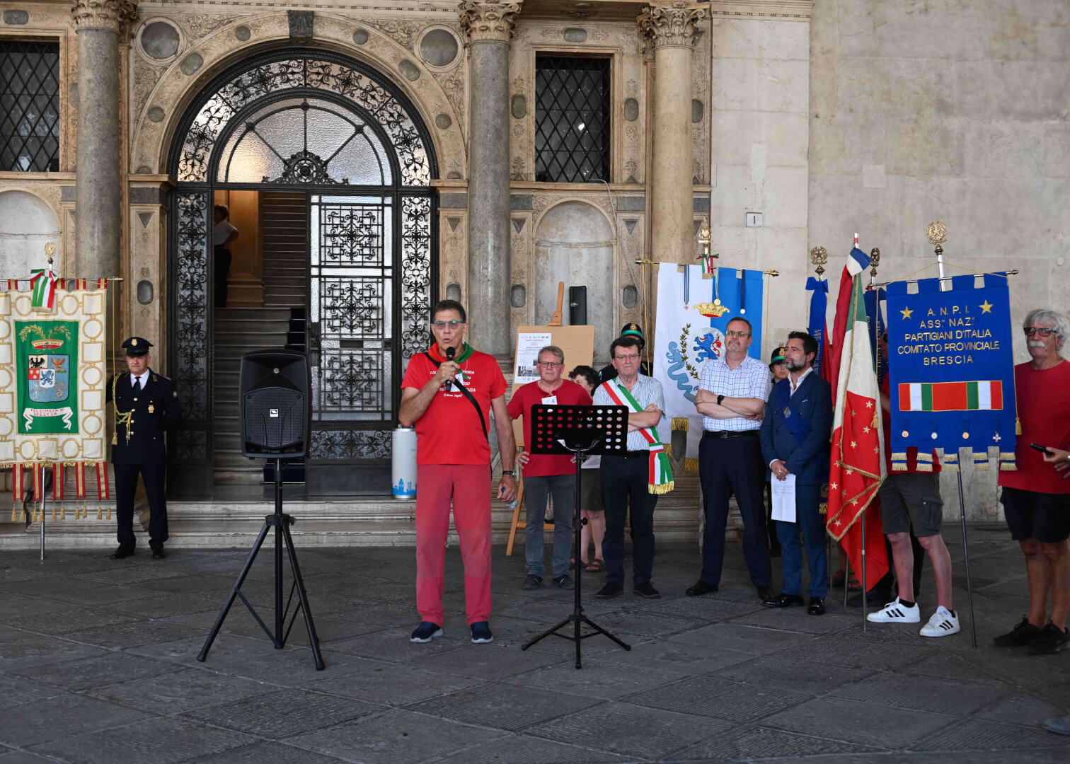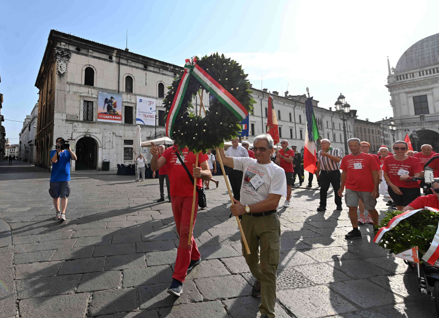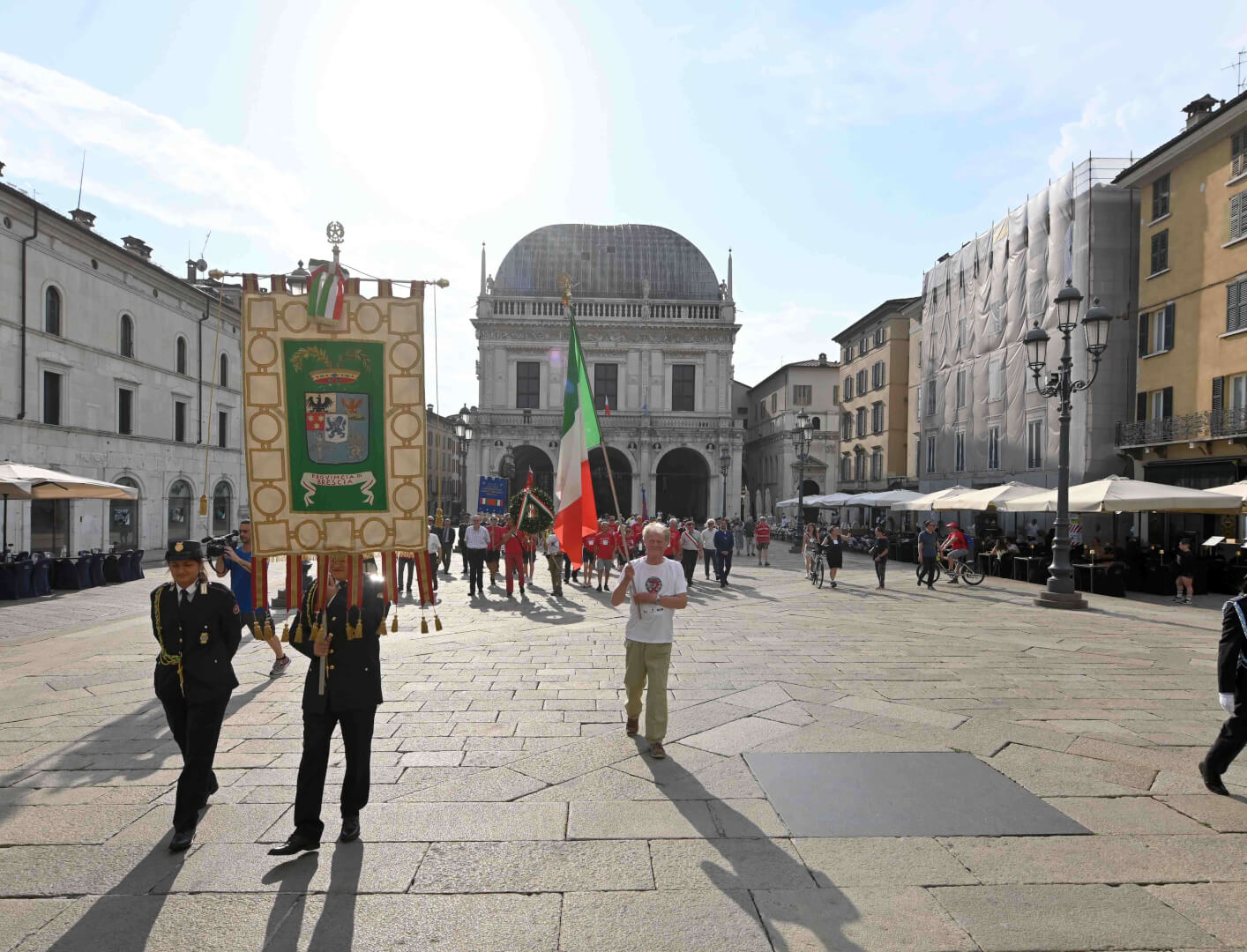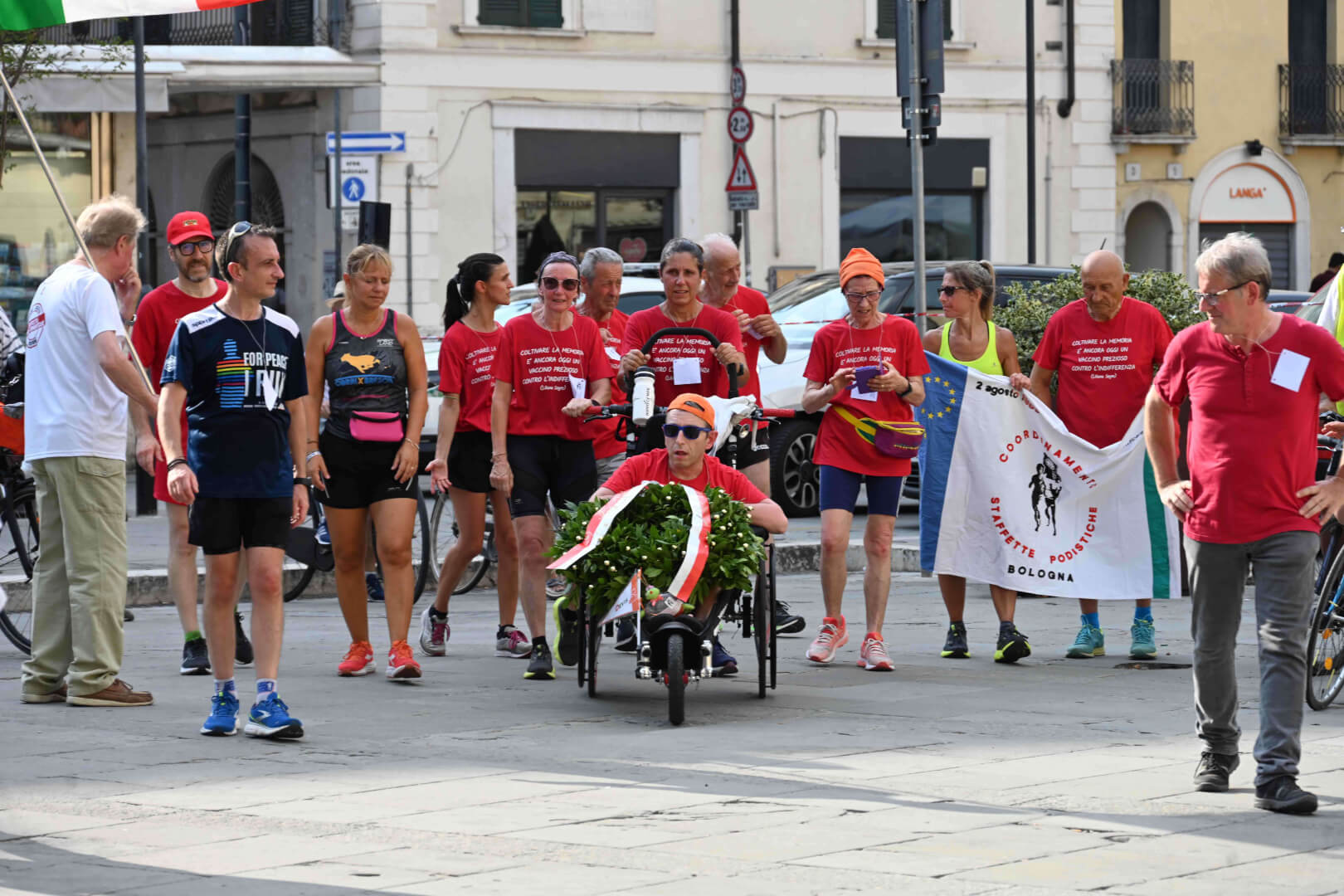 Immagini di “Momenti di memoria per non dimenticare” la staffetta podistica per ricordare le città colpite dalle stragi terroristiche di Milano/Brescia/Bologna. I podisti bresciani, con una rappresentativa bolognese, sono partiti dalla sede degli alpini di Roncadelle, percorrendo via Fratelli Cervi, via Violino di Sotto, via Valcamonica, via Milano (con breve sosta al Cimitero Vantiniano), piazzale Garibaldi, contrada del Carmine, via San Faustino e largo Formentone. In piazza della Loggia sono stati accolti sotto il porticato della Loggia da Autorità a Associazioni cittadine e dalla Banda cittadina “Isidoro Capitanio”. Dopo l’omaggio alla Stele delle Stragi, e il saluto delle autorità cittadine, la ripartenza per Bologna.