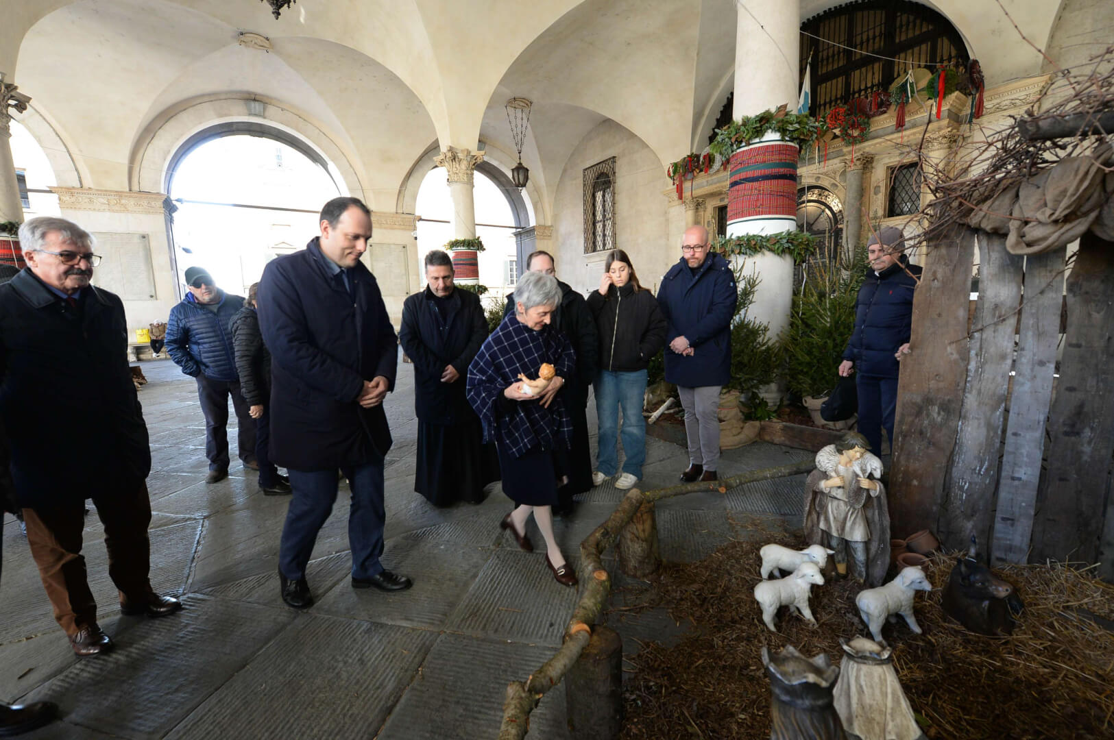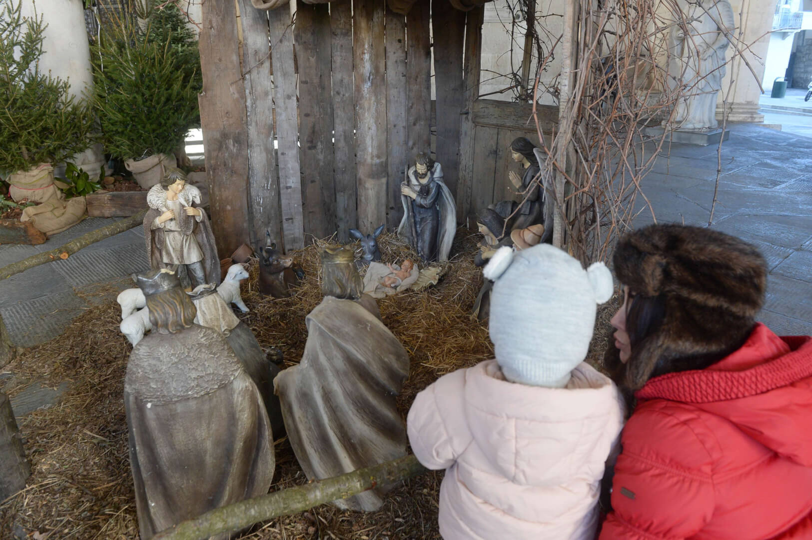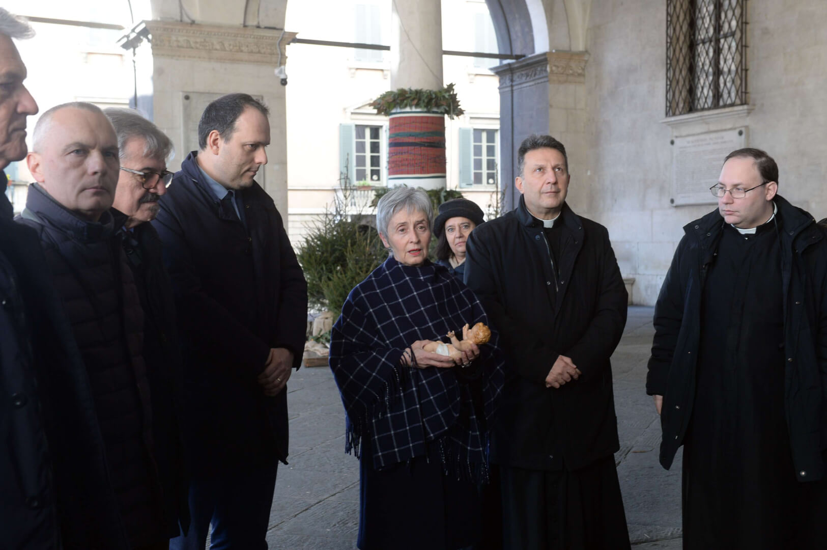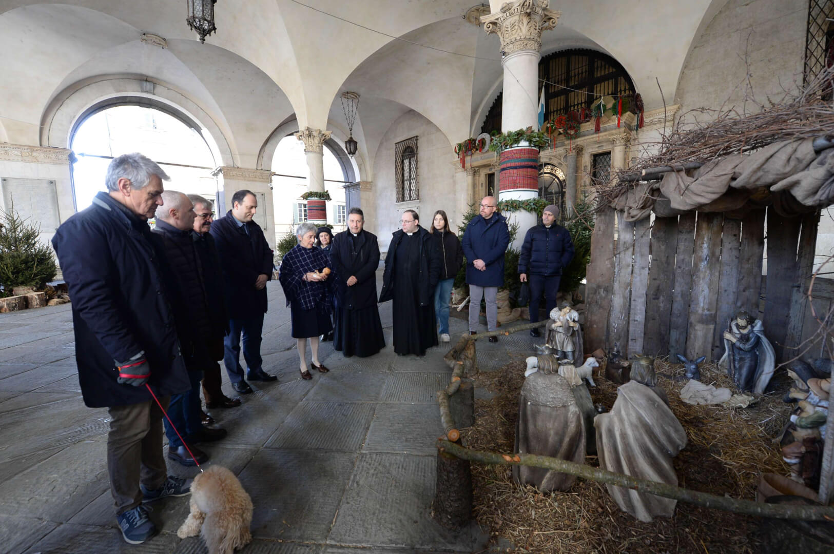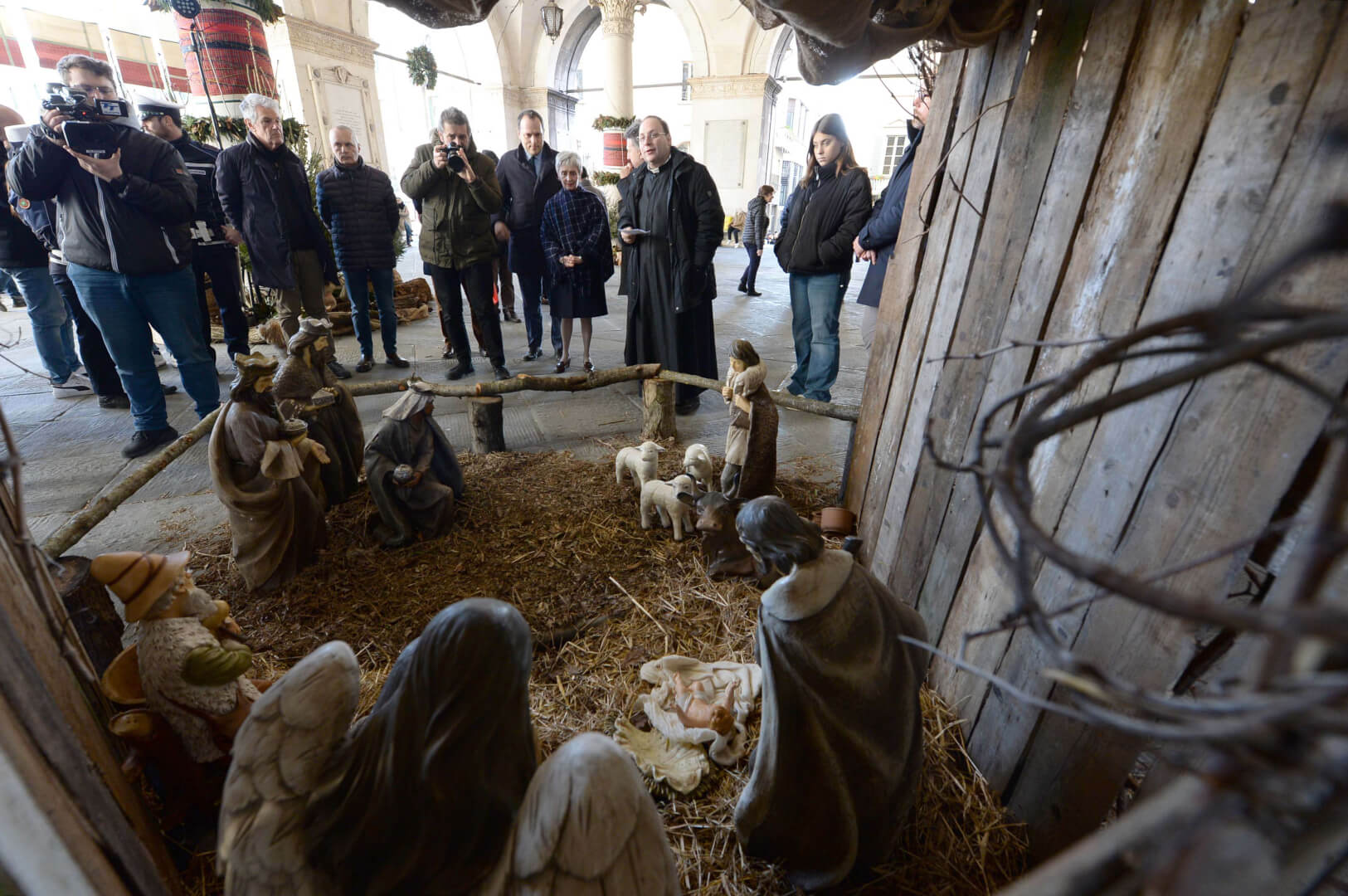 Sotto il porticato di Palazzo Loggia la posa del Bambino Gesù nel presepe allestito dal Movimento Cristiano Lavoratori