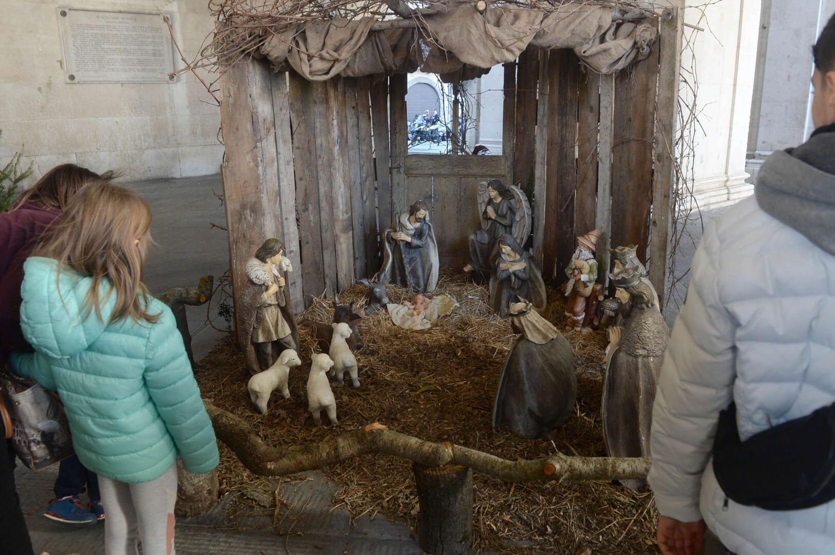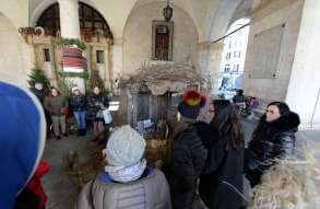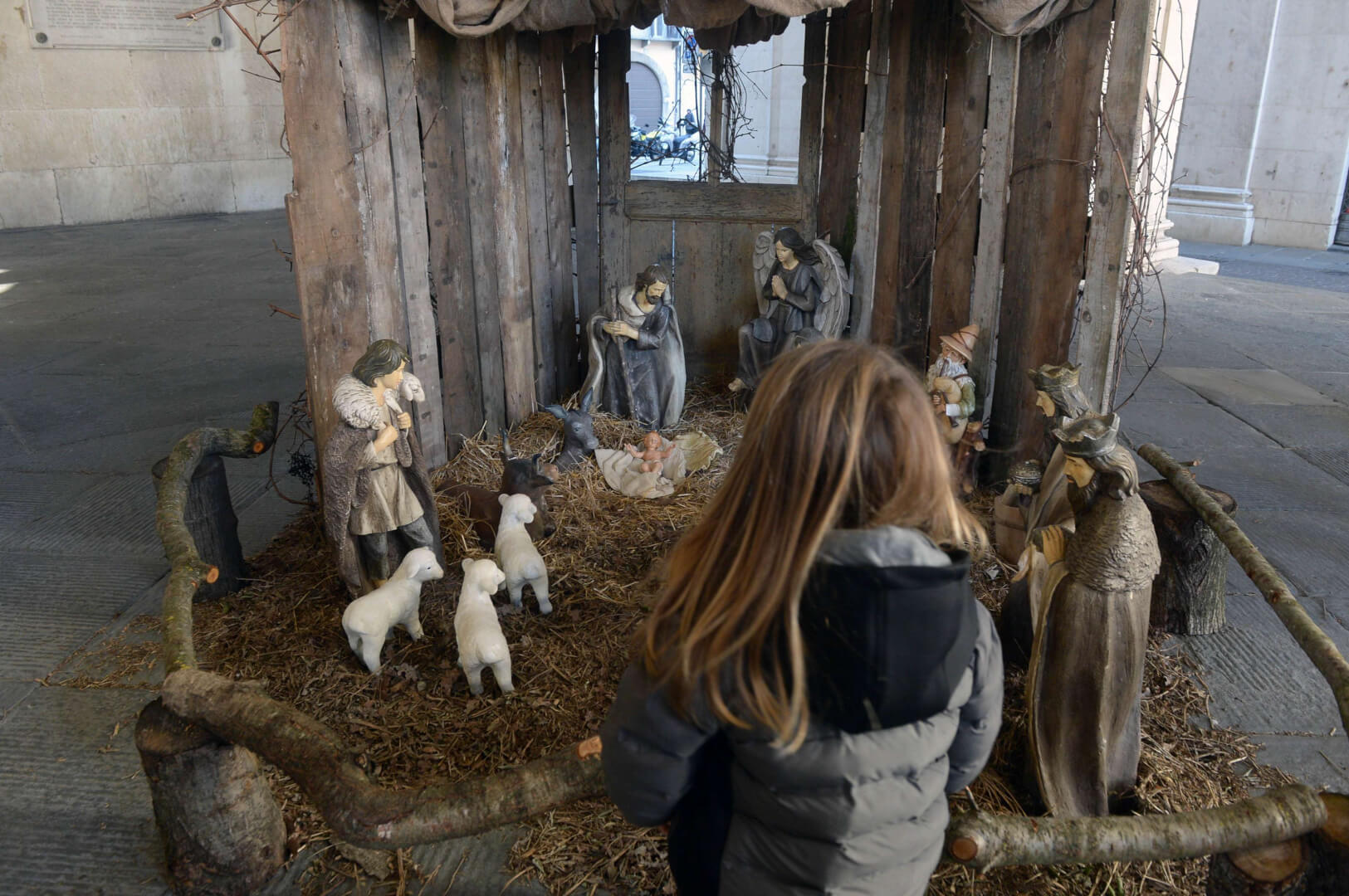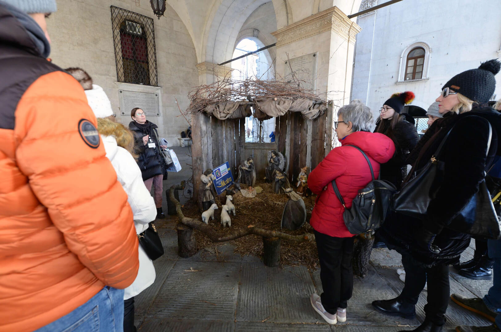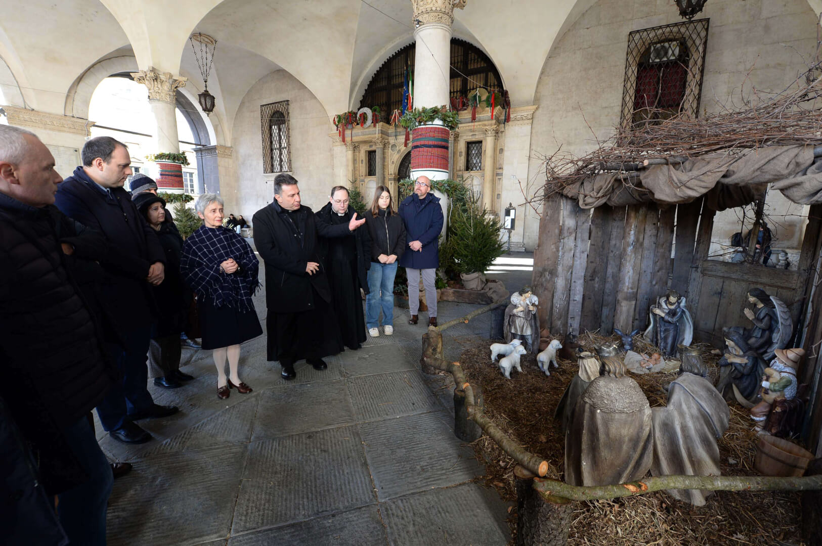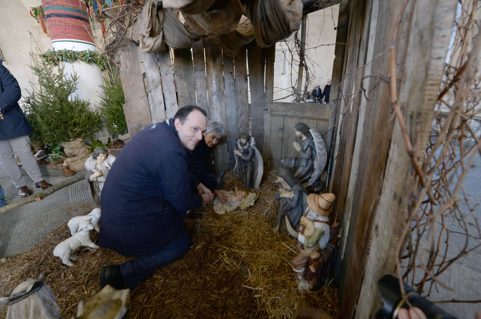 Sotto il porticato di Palazzo Loggia la posa del Bambino Gesù nel presepe allestito dal Movimento Cristiano Lavoratori