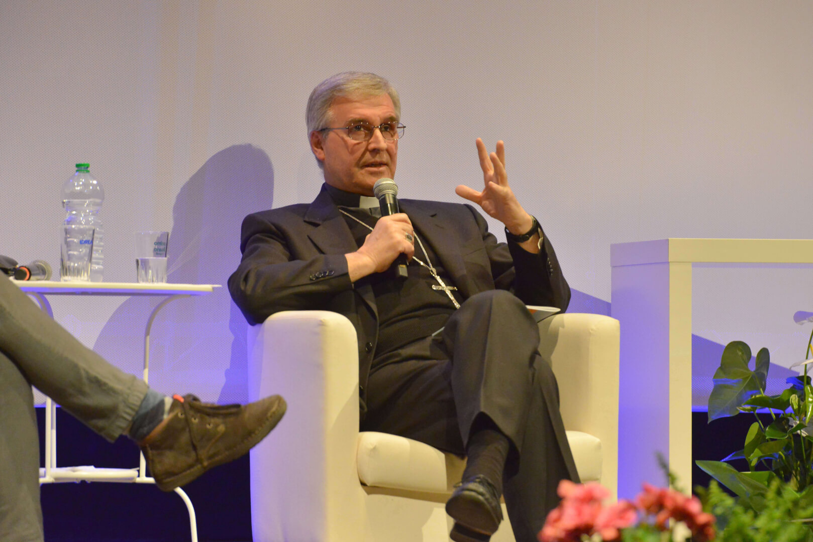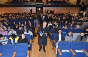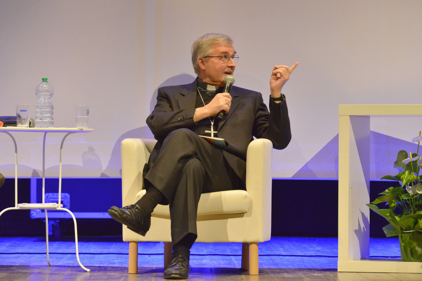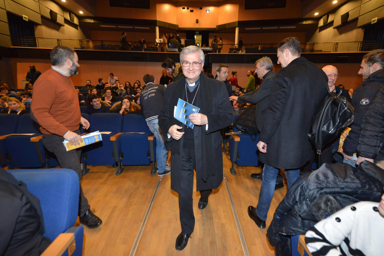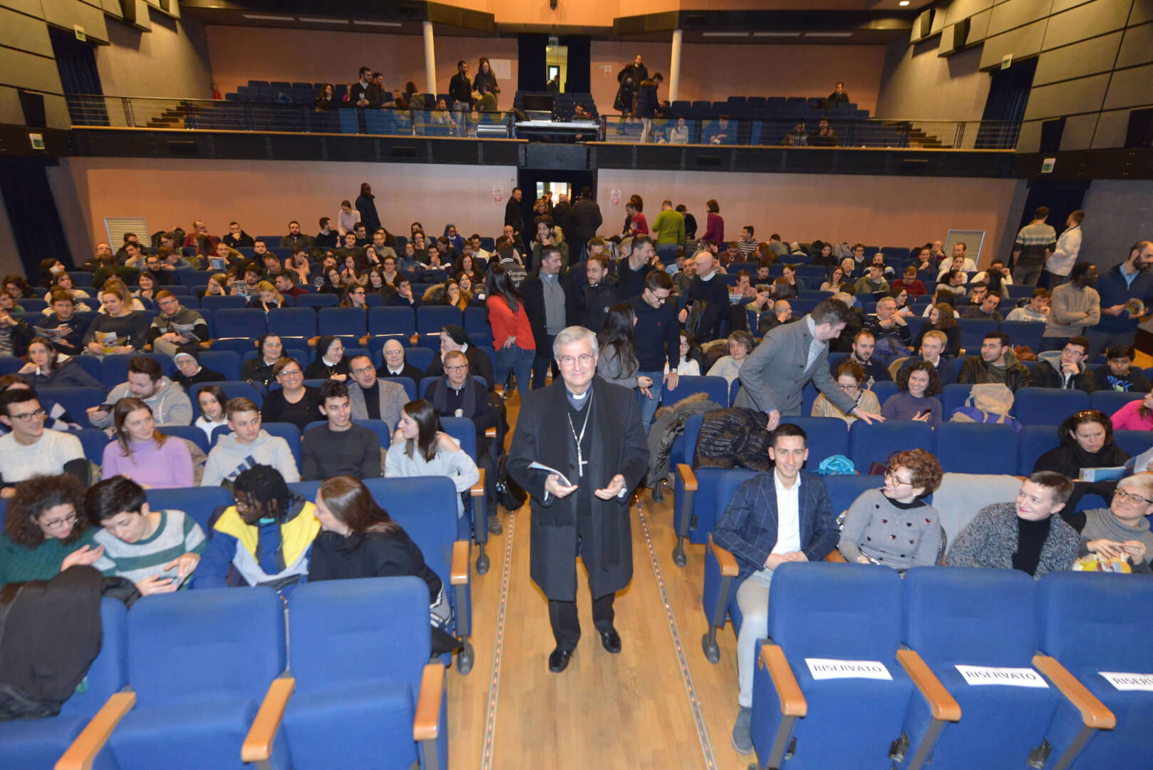 Il vescovo Pierantonio Tremolada, nella sala della comunità del Villaggio Prealpino, per la consegna delle linee diocesane di pastorale giovanile