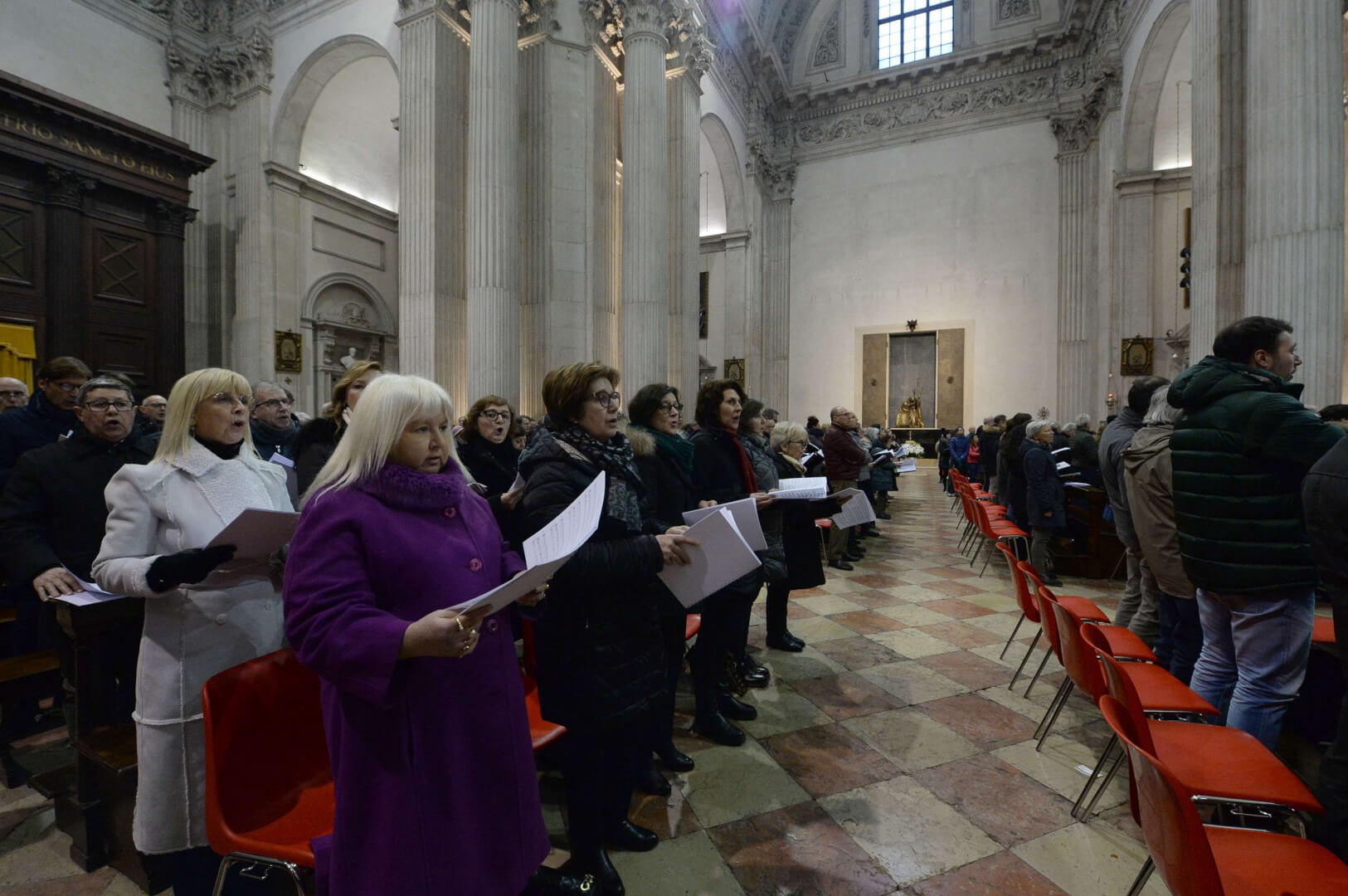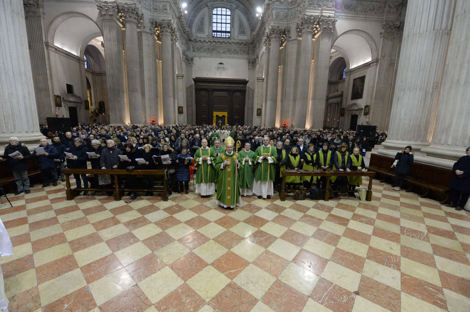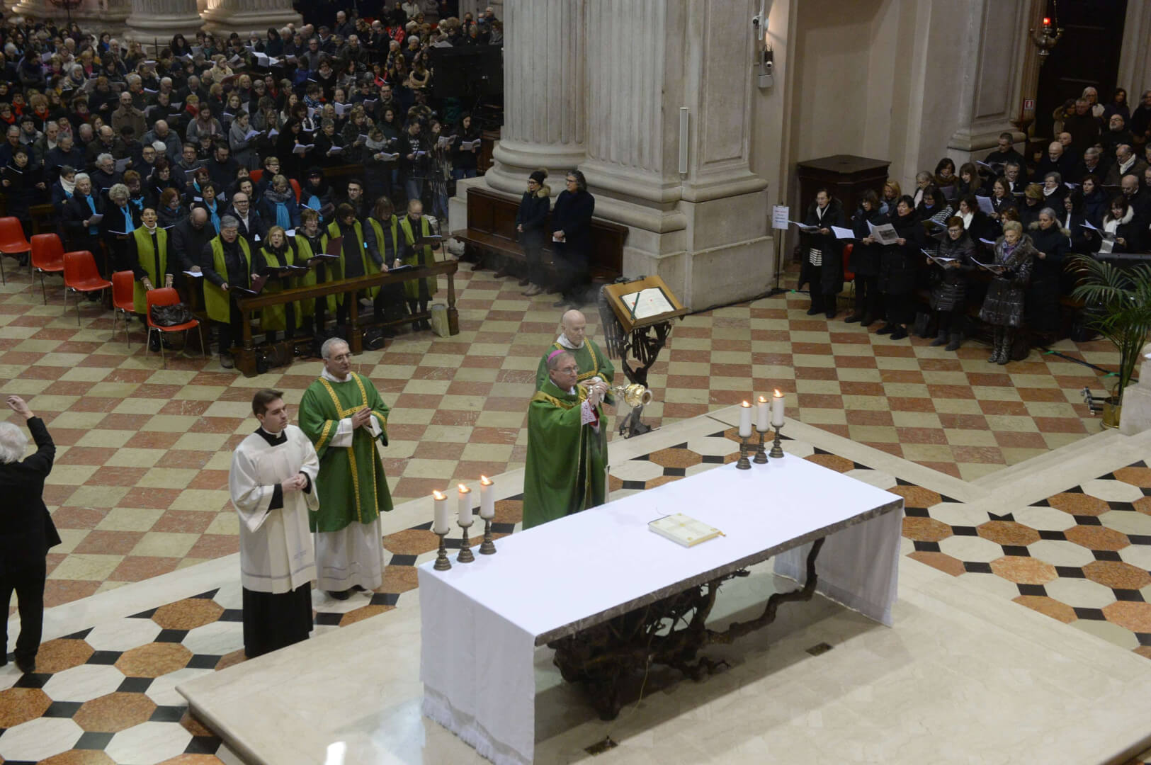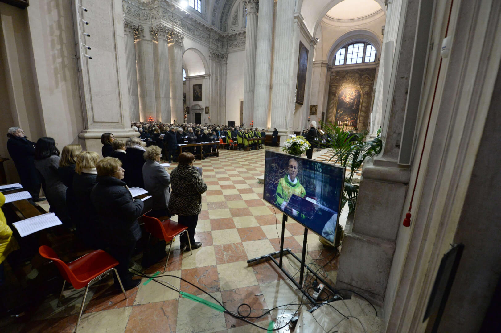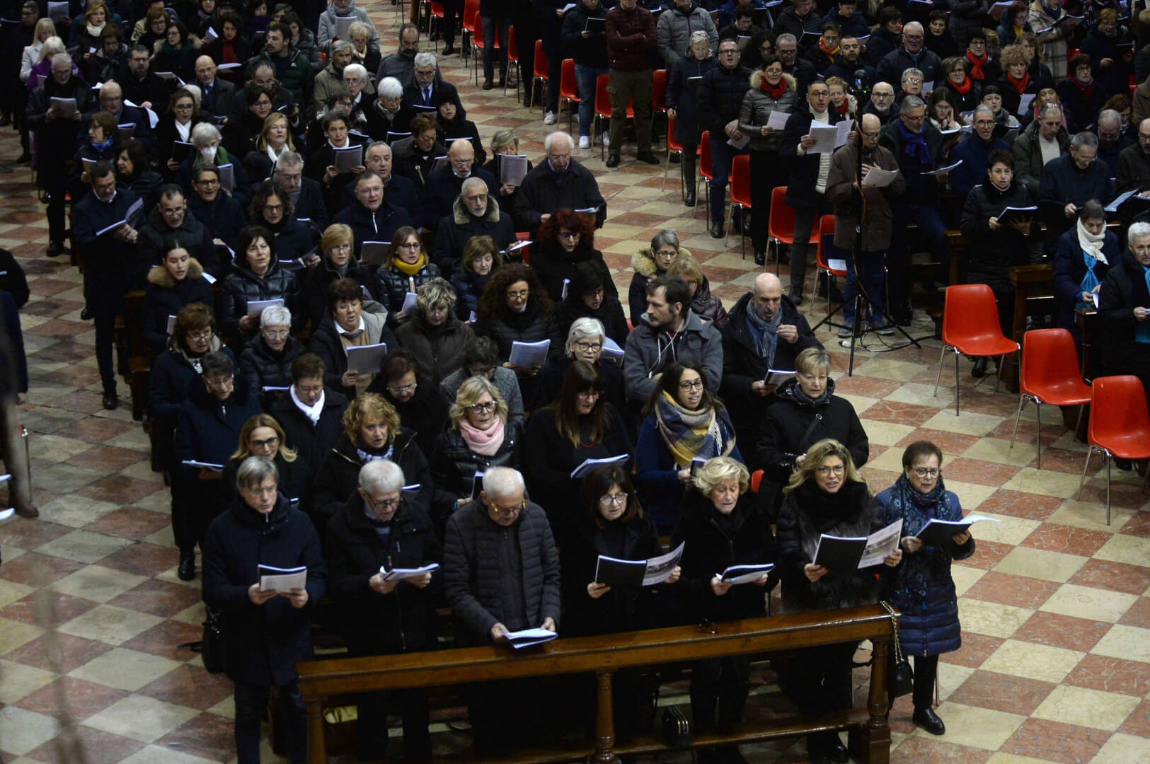 Domenica 21 gennaio, in Cattedrale, il vescovo Pierantonio Tremolada ha presieduto la Santa Messa con i cori parrocchiali e gli operatori liturgico-musicali della Diocesi. Più di 900 i coristi. Il repertorio ha compreso alcuni brani in memoria della messa del 1998 e altri nuovi degli autori: Maurice Duruflé, Edward Elgar, Giancarlo Facchinetti, Giulio Tonelli e Roberto Soldati. I brani dell’ordinario (Kyrie, Gloria, Credo, Sanctus, Agnus Dei) erano in prima esecuzione. È stata realizzata per la prima volta la “Messa Arcaica” in lingua italiana composta da don Alberto Donini, che andrà ad arricchire il repertorio diocesano