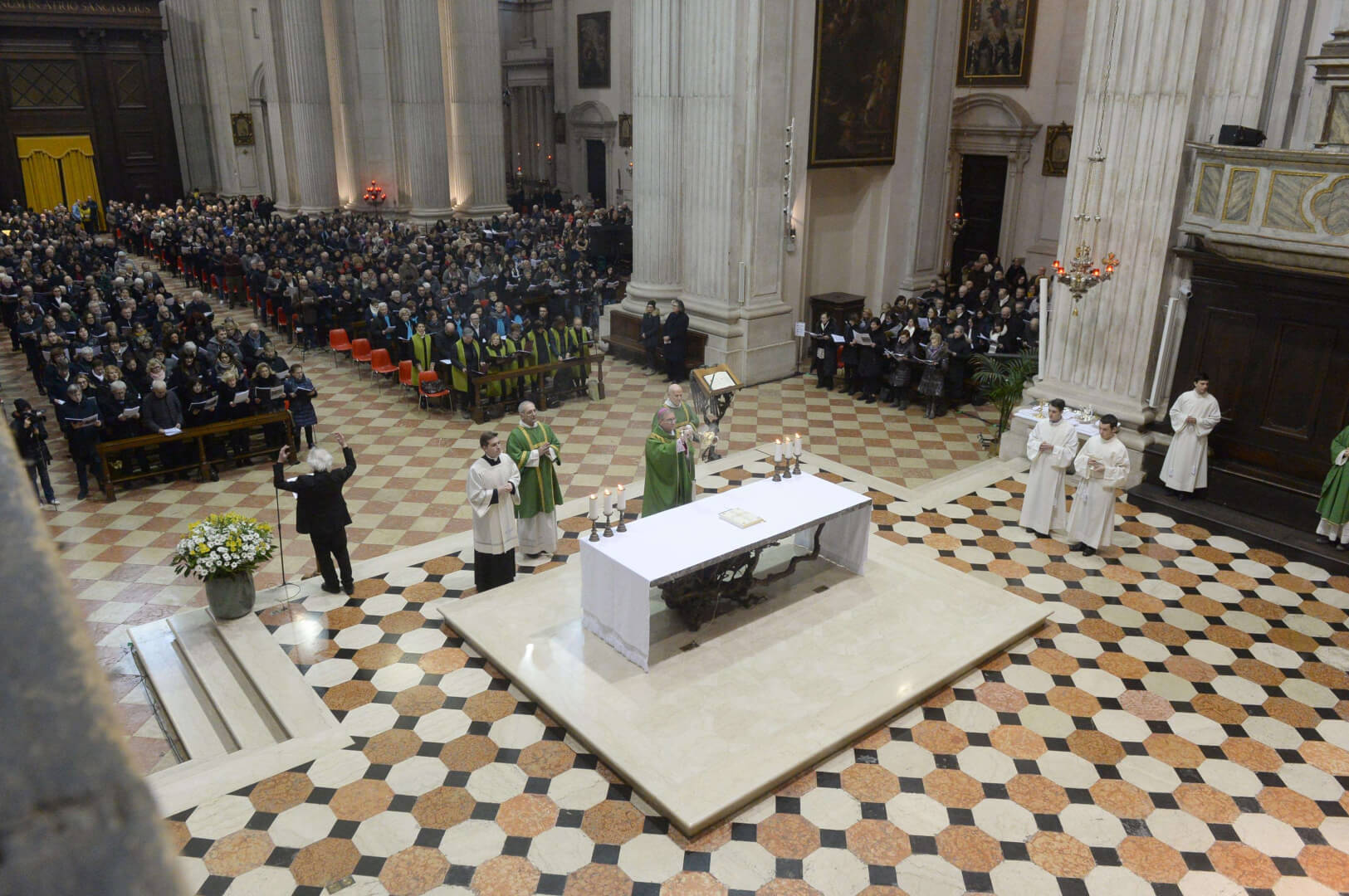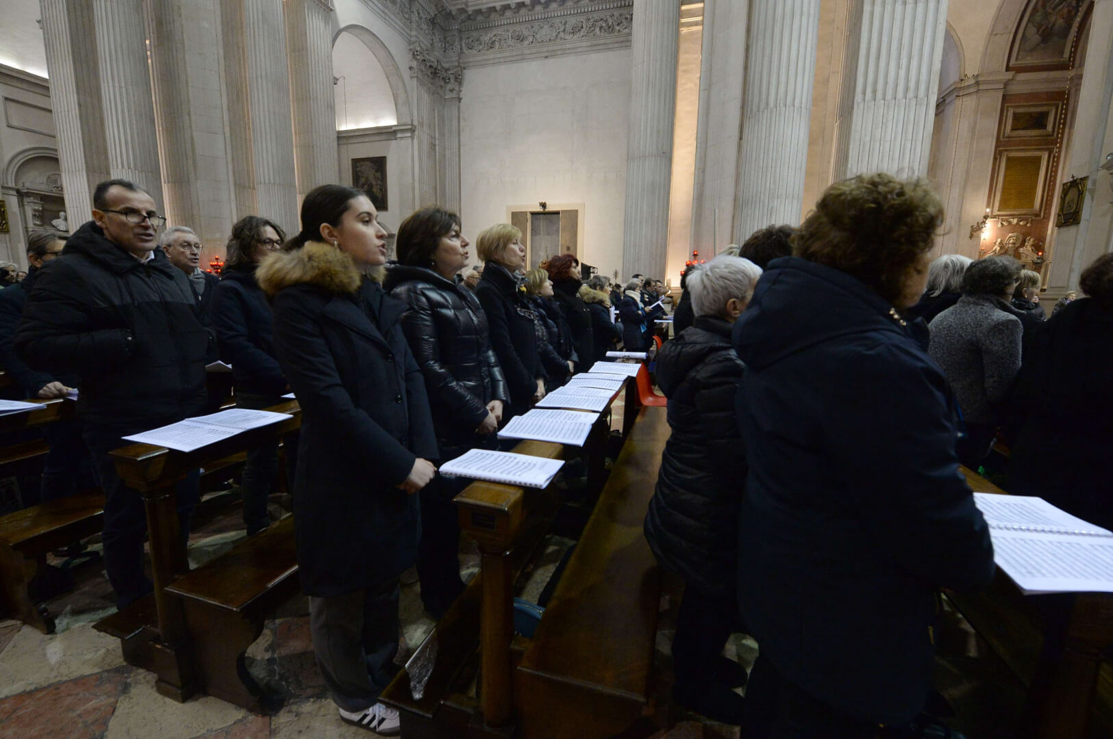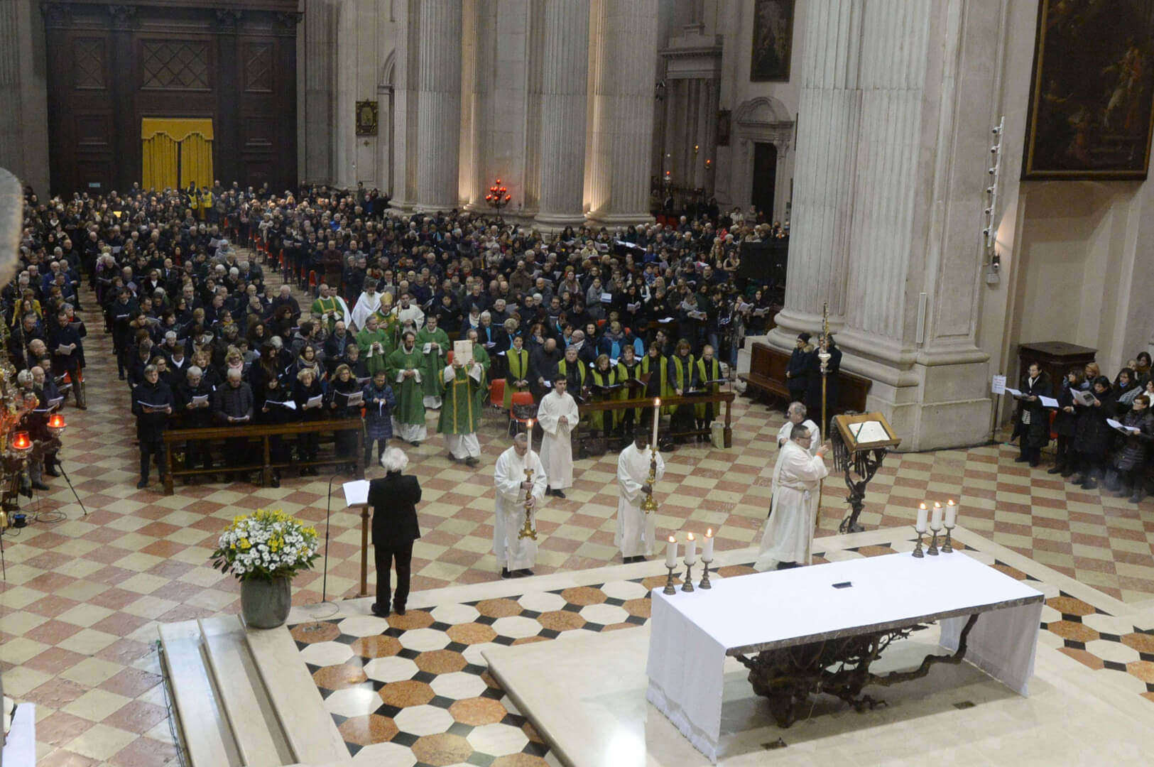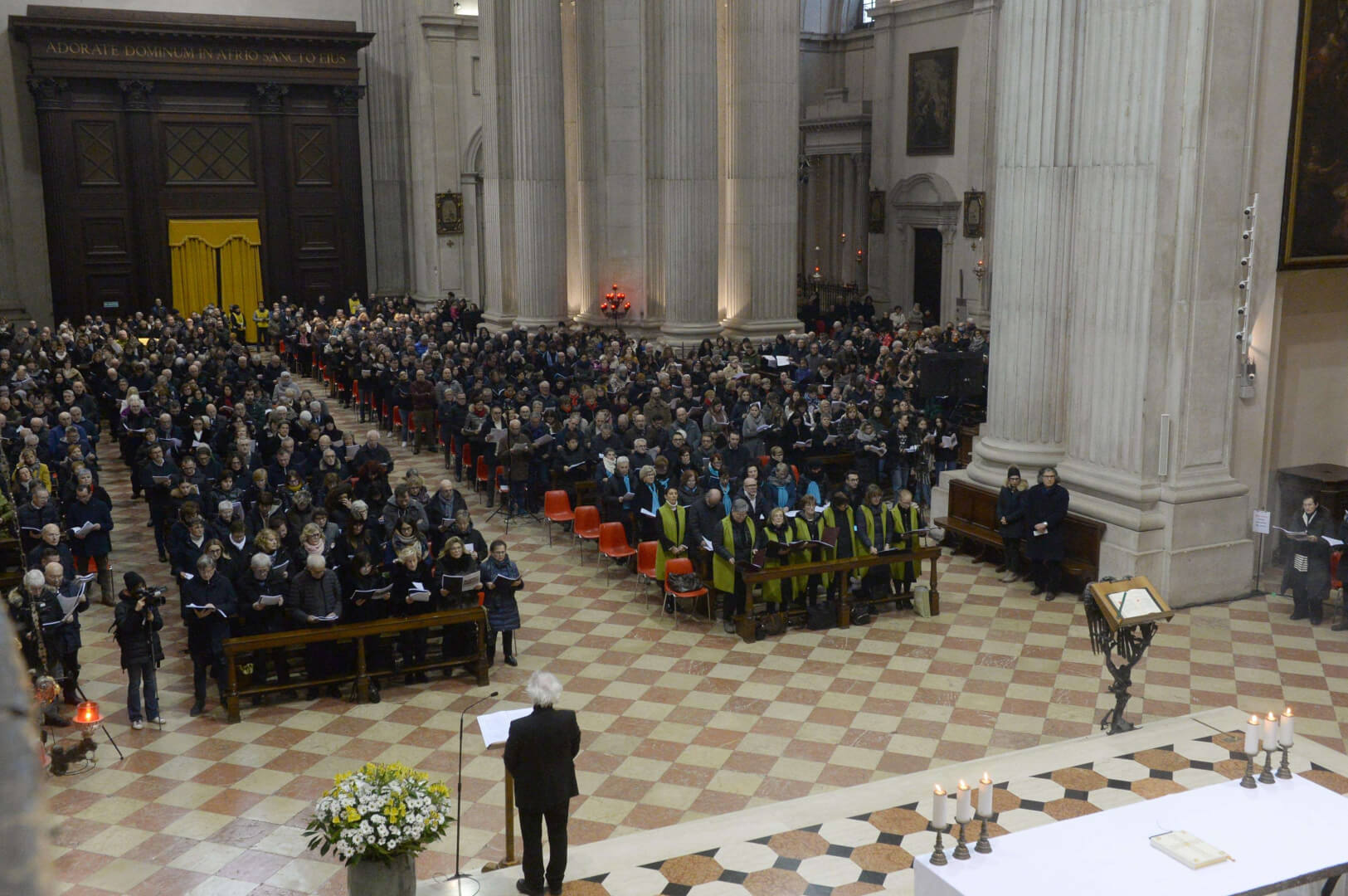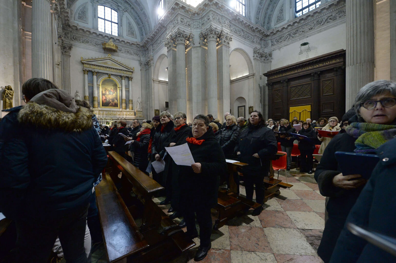 Domenica 21 gennaio, in Cattedrale, il vescovo Pierantonio Tremolada ha presieduto la Santa Messa con i cori parrocchiali e gli operatori liturgico-musicali della Diocesi. Più di 900 i coristi. Il repertorio ha compreso alcuni brani in memoria della messa del 1998 e altri nuovi degli autori: Maurice Duruflé, Edward Elgar, Giancarlo Facchinetti, Giulio Tonelli e Roberto Soldati. I brani dell’ordinario (Kyrie, Gloria, Credo, Sanctus, Agnus Dei) erano in prima esecuzione. È stata realizzata per la prima volta la “Messa Arcaica” in lingua italiana composta da don Alberto Donini, che andrà ad arricchire il repertorio diocesano