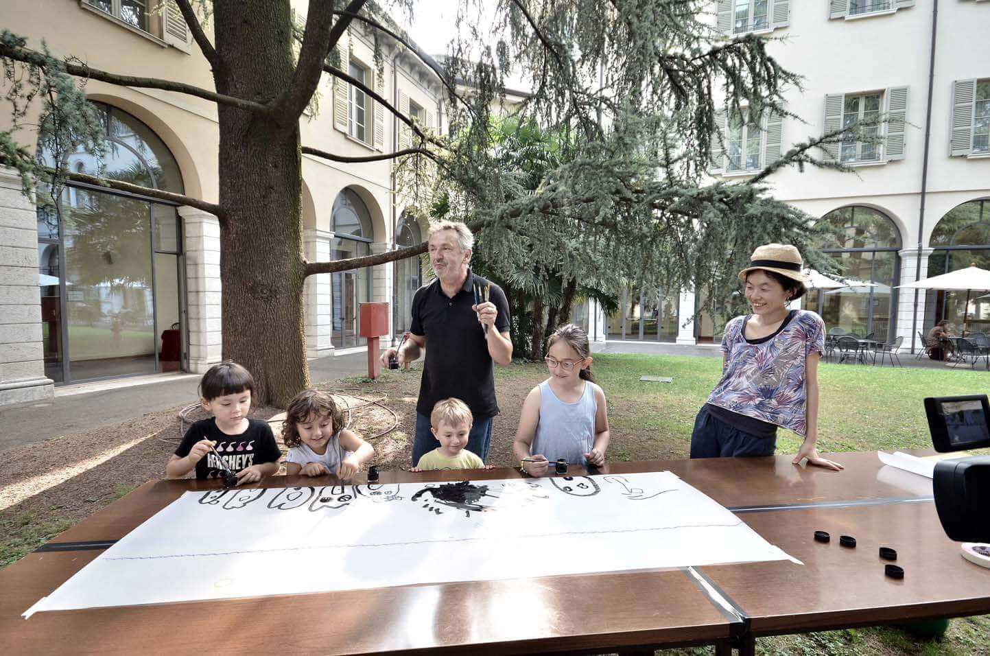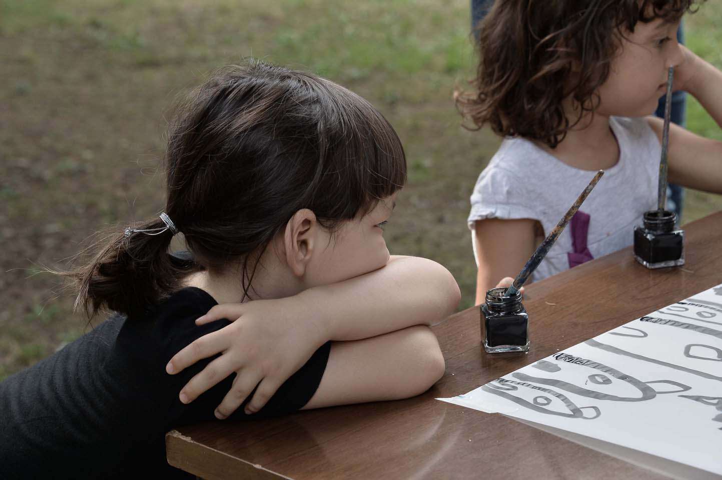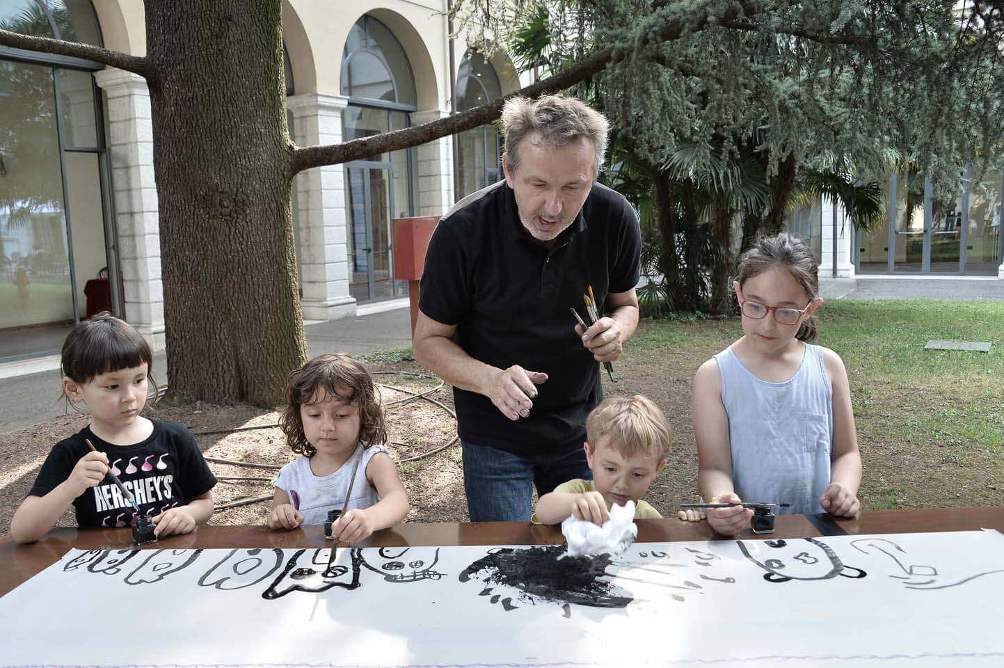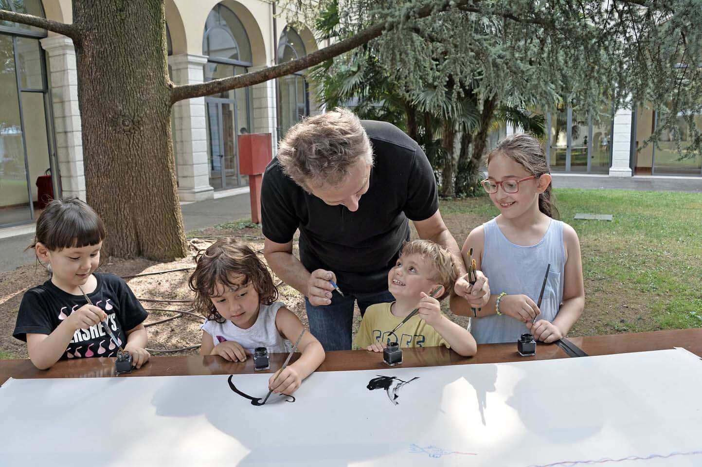 Il laboratorio di disegno per bambini di Dario Moretti che si è tenuto nel giardino del Centro pastorale Paolo VI