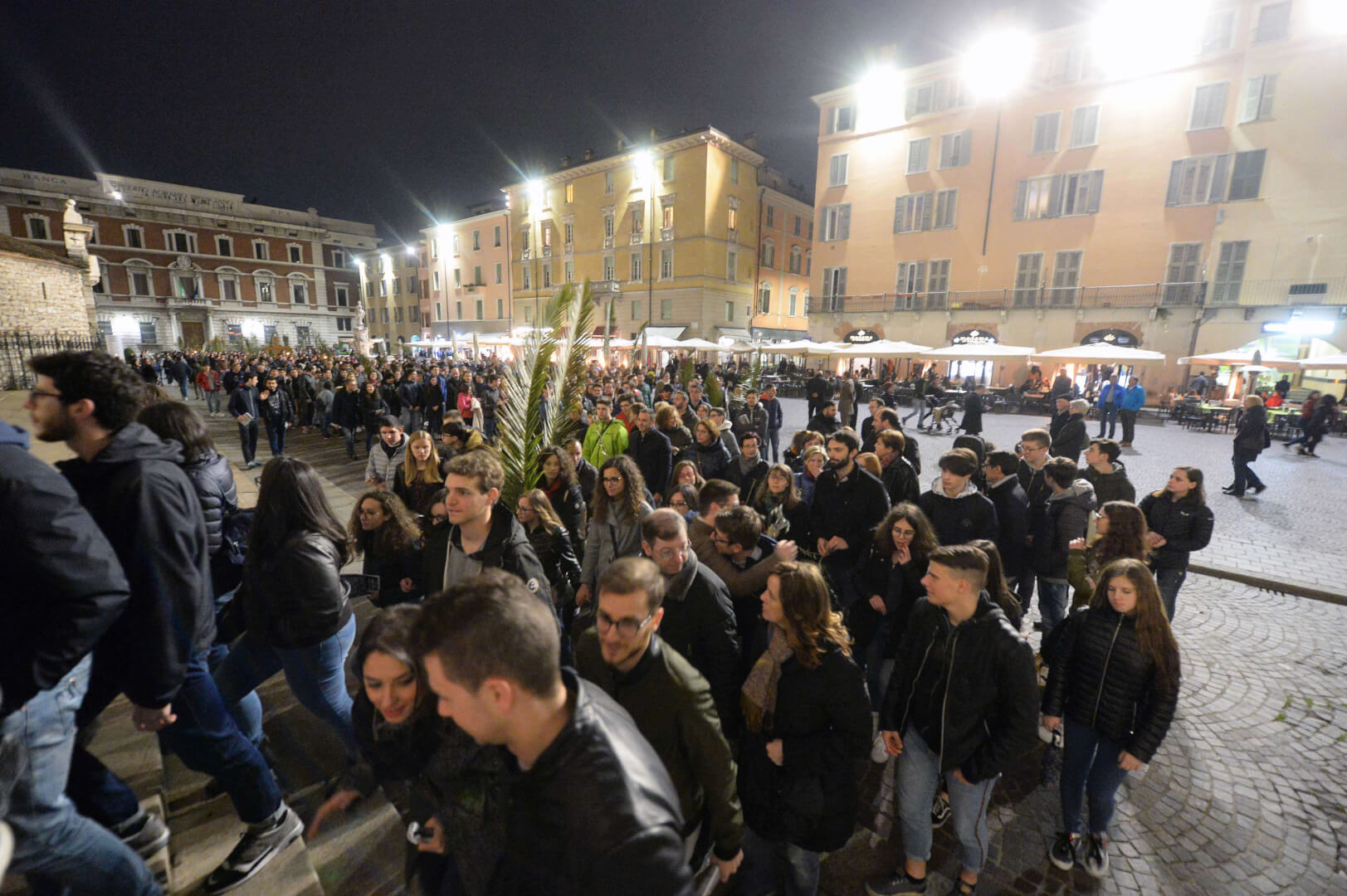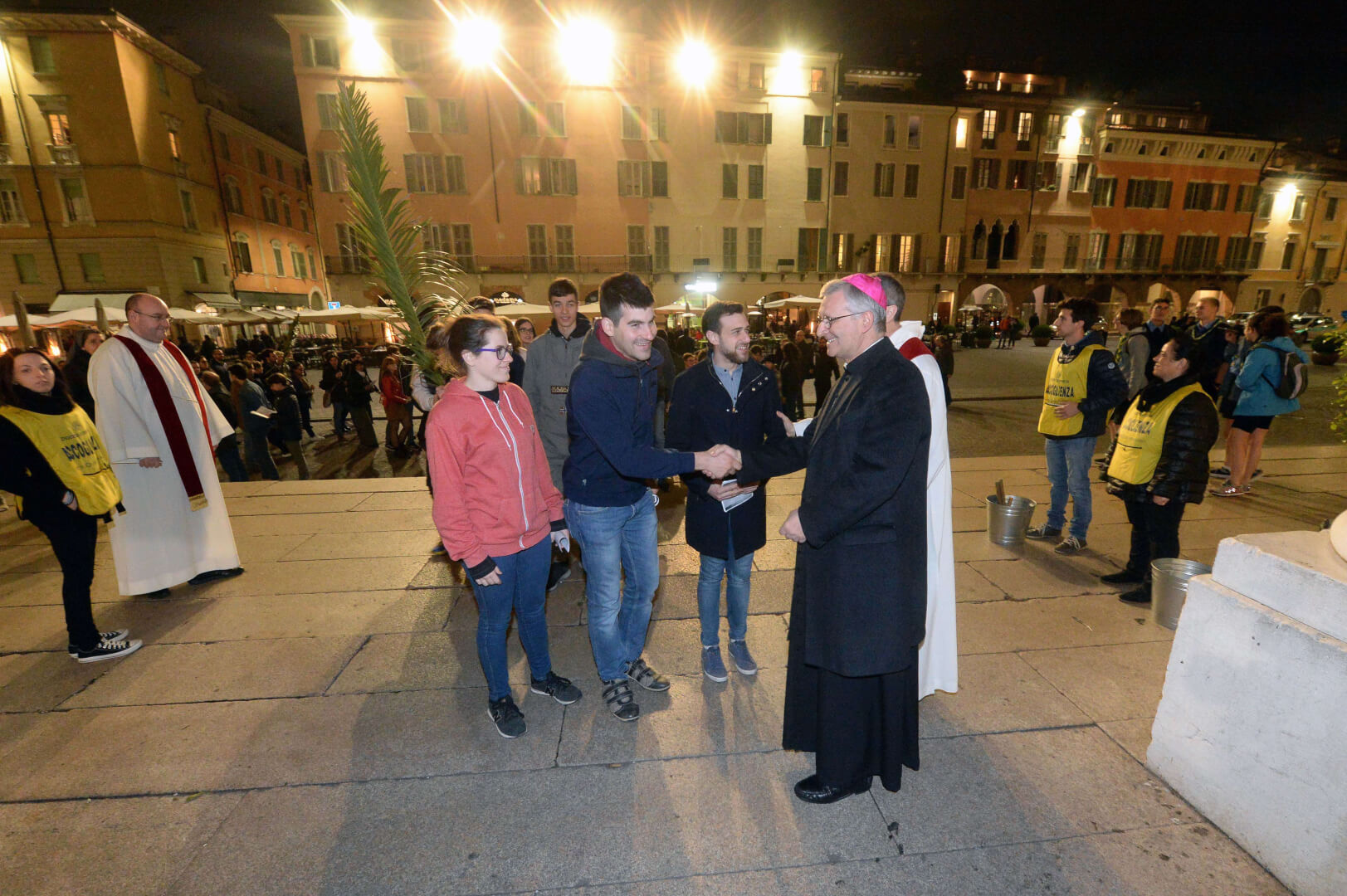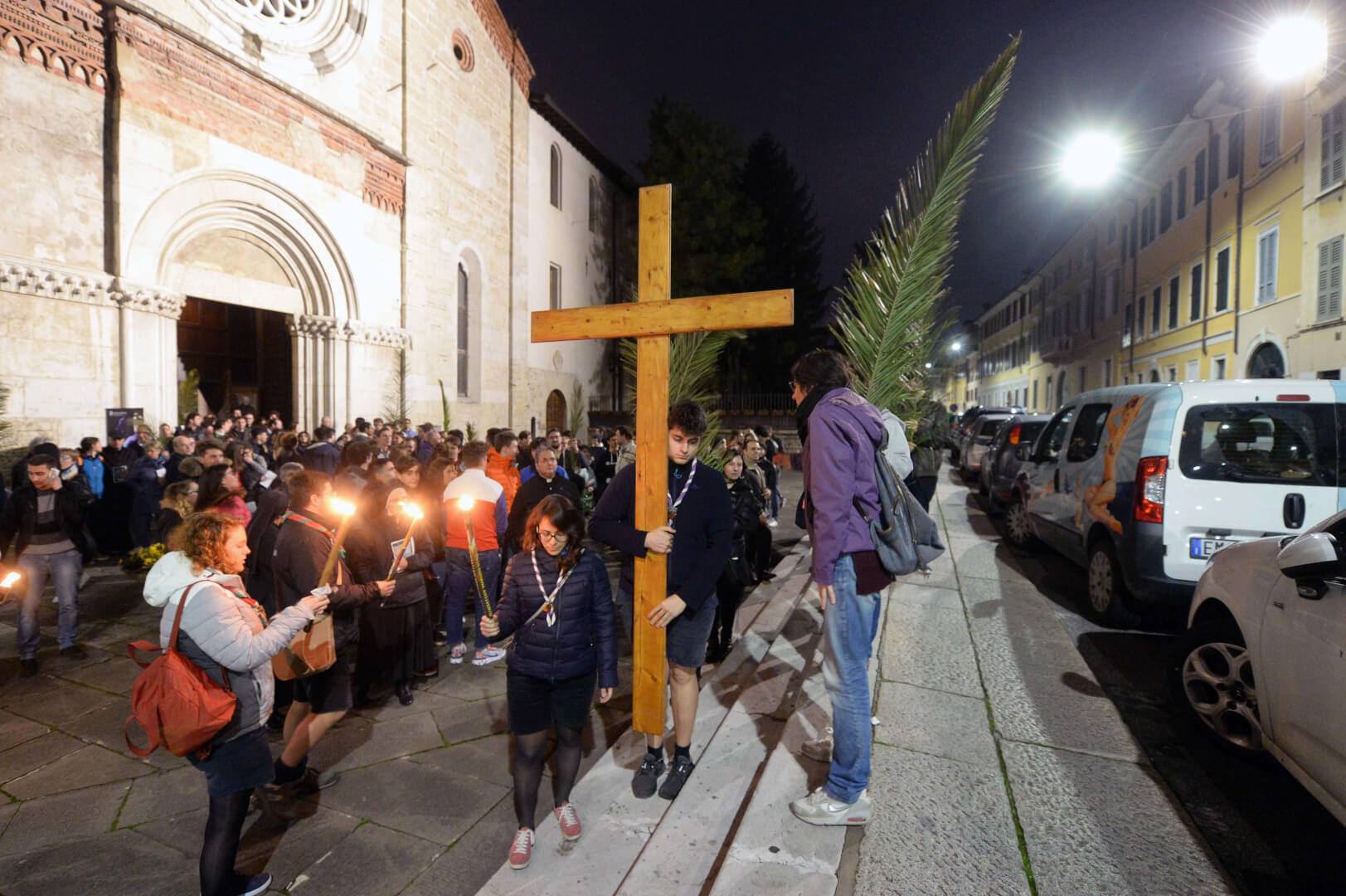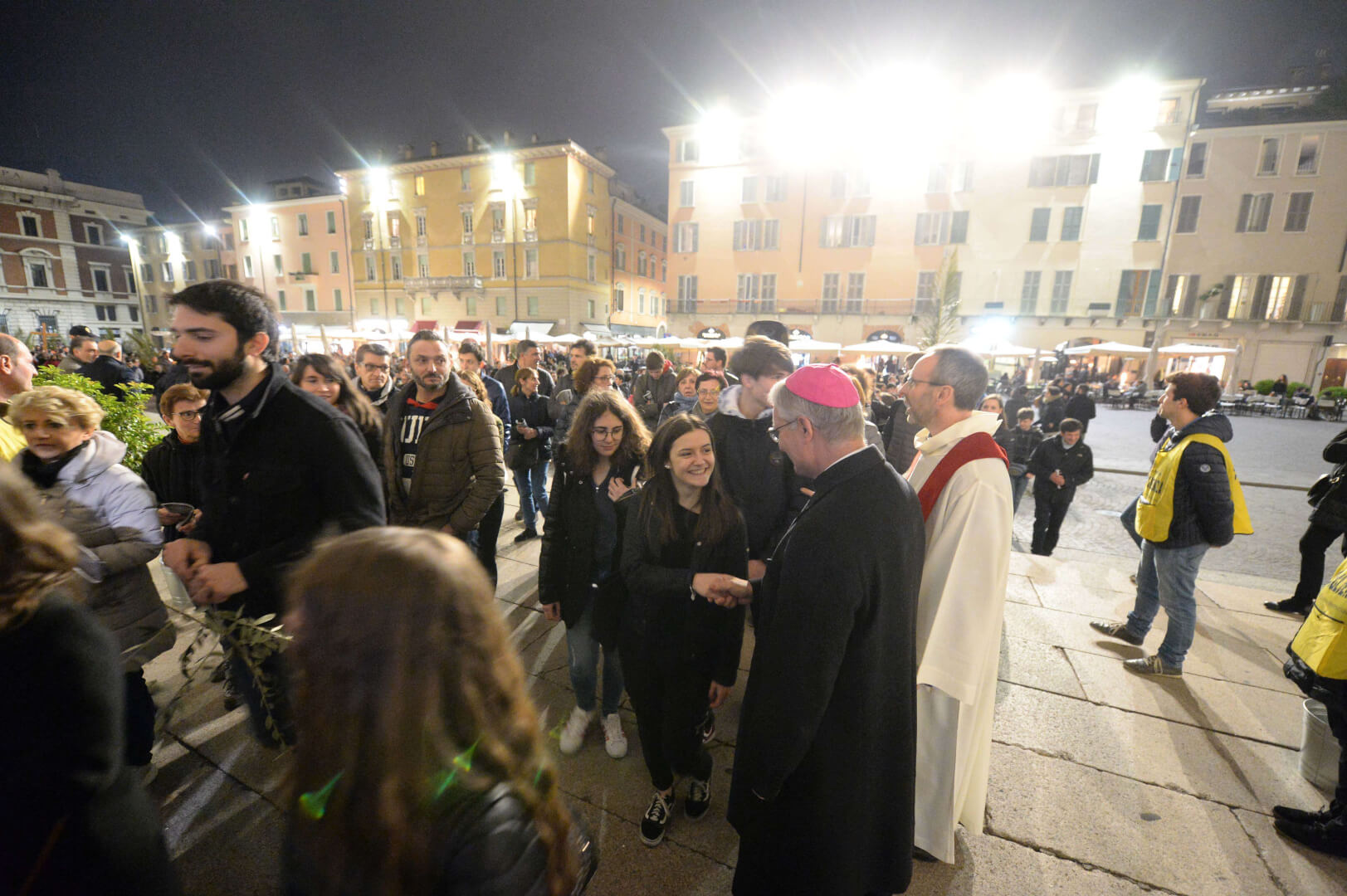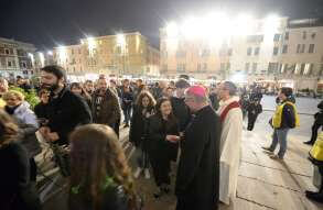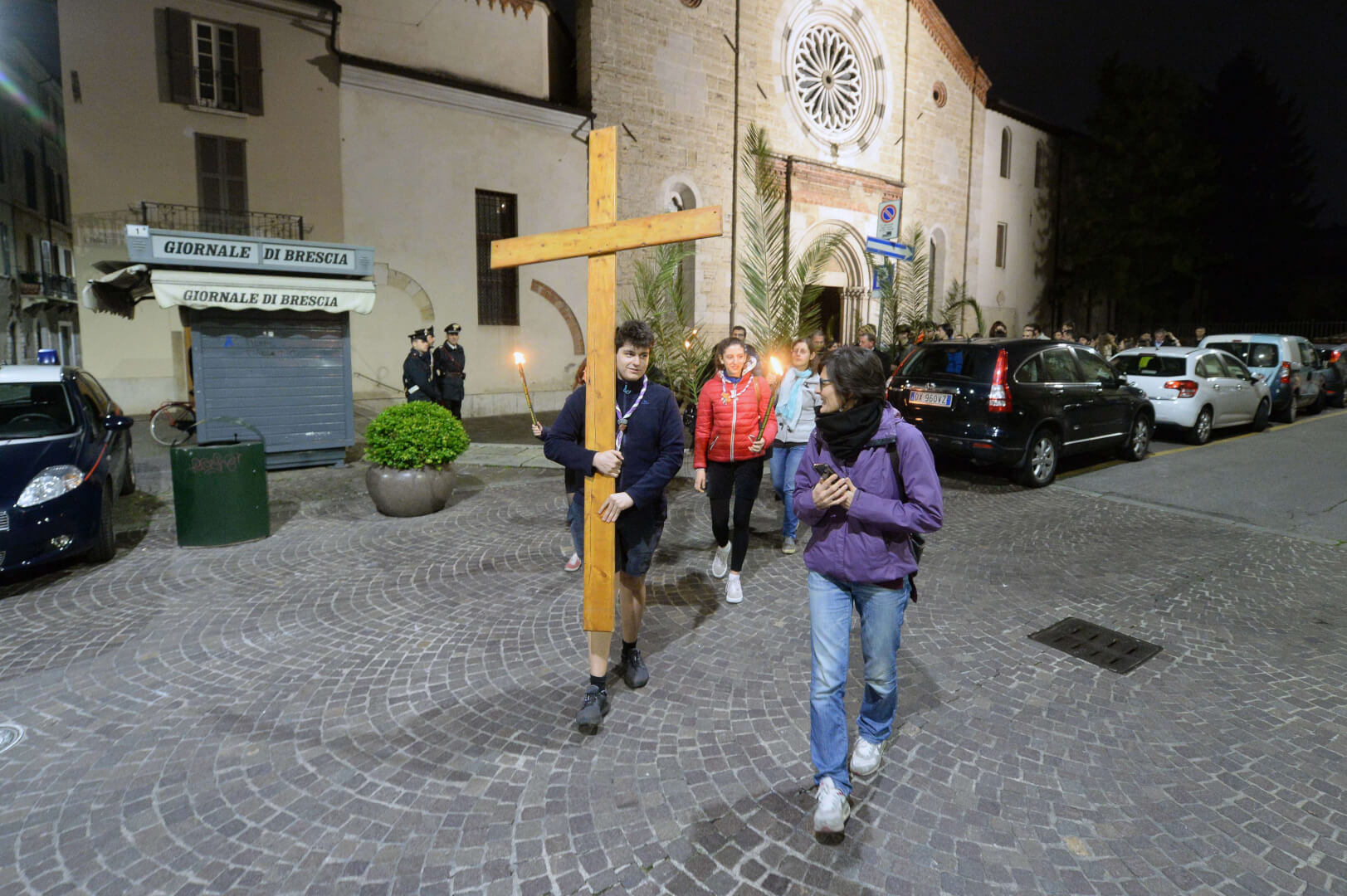 Migliaia di giovani in processione nelle vie del centro storico di Brescia per raggiungere il vescovo Pierantonio in Cattedrale