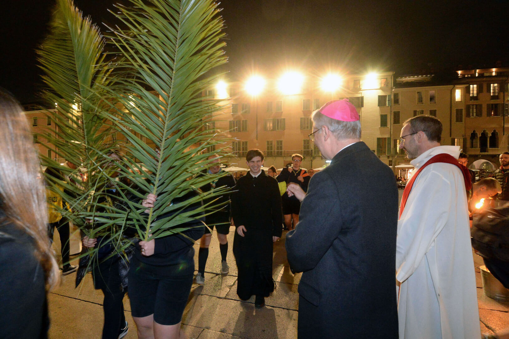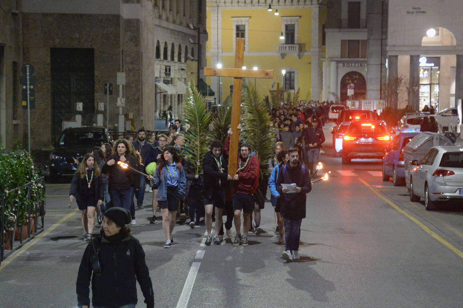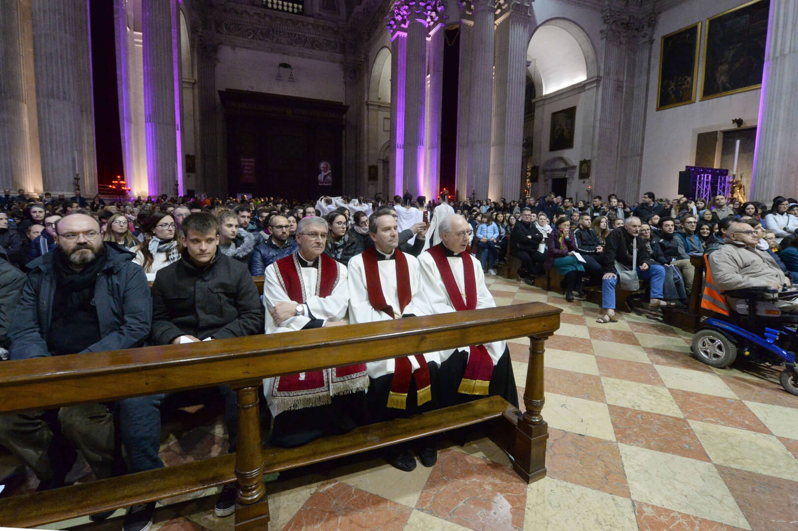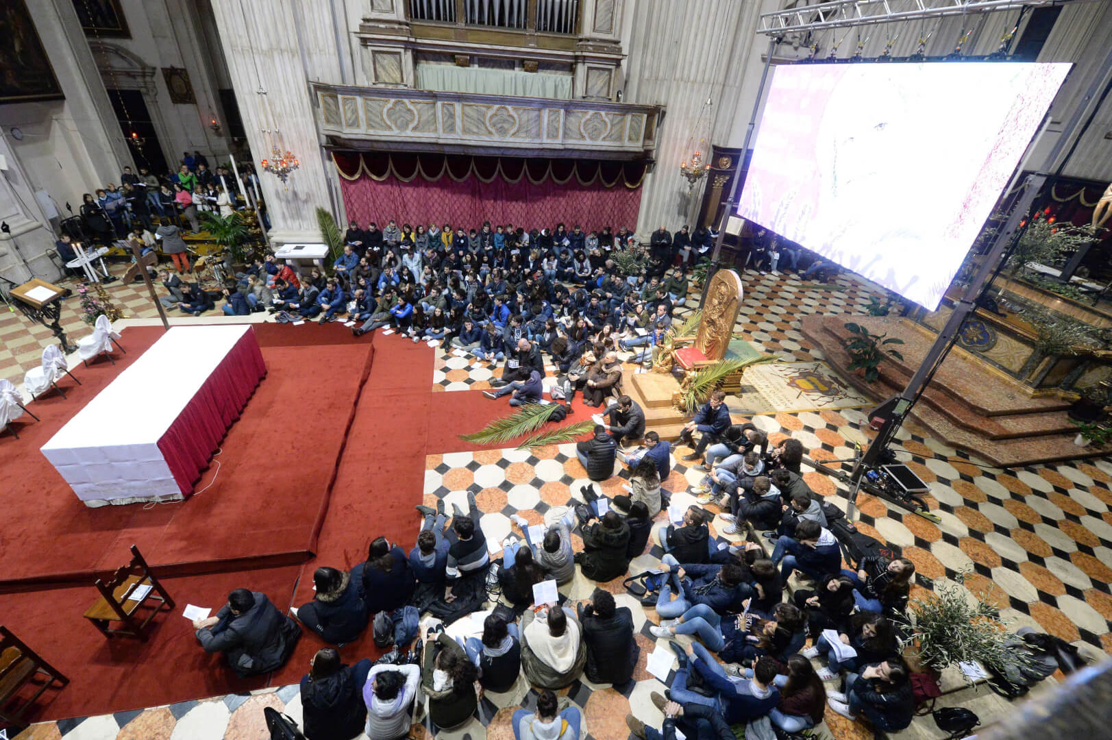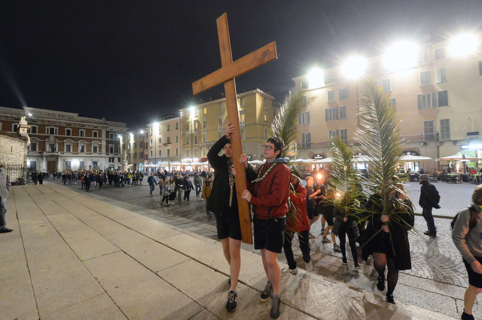Migliaia di giovani in processione nelle vie del centro storico di Brescia per raggiungere il vescovo Pierantonio in Cattedrale
