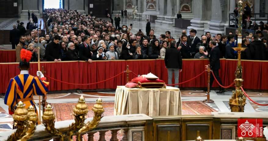 Continua incessante il flusso di fedeli nella basilica di San Pietro per l'ultimo saluto al Papa emerito. Domani i funerali in piazza San Pietro