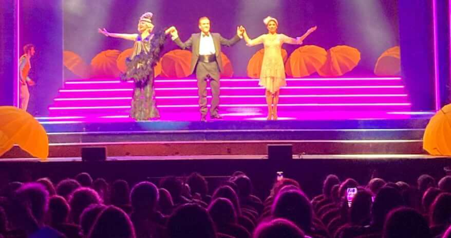 L’edizione italiana, “Cantando sotto la pioggia”, ha vissuto due serate entusiasmanti, venerdì 13 e sabato 14 marzo, nel Teatro Clerici di Brescia. La regia di Luciano Cannito fa rivivere tutta la magia, l’ironia e la leggerezza di uno dei musical più amati di sempre. Un adattamento in italiano con un testo frizzante, moderno, vivace che consente alla protagonista, l’attrice Martina Stella (“L’ultimo bacio”), attraverso l’interpretazione del ruolo della malvagia Lina Lamont, di esprimere la sua carica, la sua vivacità, il suo entusiasmo, rendendo la figura negativa di Lina protagonista del musical. Bravissimi anche Lorenzo Grilli (Don Lockwood) e Vittorio Schiavone (Cosmo Brown), così come Maurizio Semeraro (R.F.Simpson). Deliziosa Flora Canto (moglie di Enrico Brignano) nella parte di Kathy Selden, per la prima volta protagonista a tutto tondo (cantando, recitando, ballando) in un musical. Una versione italiana pregevole, che accentua il lato comico, divertente e gioioso della storia, grazie alla brillante regia e all’adattamento di Luciano Cannito, che cura anche le coreografie. Le scene sono state firmate dal maestro Italo Grassi e i costumi da Silvia Califano, figlia del leggendario cantautore. Tutto torna in questo musical, la direzione musicale di Ivan Lazzara, le immagini, i cambi di scena funzionano alla perfezione, la pioggia cade realmente sulla scena e contribuisce a rendere più vera la vicenda. Il disegno luci del visionario Valerio Tiber, autore di grandi allestimenti internazionali, contribuisce ad elevare il livello di una produzione importante, con il cast e l’ensemble dei ballerini selezionati tramite audizioni nazionali, garantendo così un livello eccellente di talento vocale, danza e recitazione.
