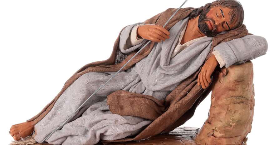 Caro San Giuseppe, mi piace come dormi nel presepio. Mi piace quando prendi in braccio Gesù e lasci riposare Maria: qui c’è una tenerezza incredibile. Mi piace, però, ancora di più, quando ti abbandoni alla bellezza del mistero del Natale e ti lasci incantare così tanto da addormentarti, allora immagino i tuoi sogni e li penso pieni di progetti: qui c’è una forza incredibile, la potenza della Grazia che parla e suggerisce il meglio e il bello. Noi, caro san Giuseppe, sappiamo dormire poco così. Spesso dormiamo per scappare, o qualcosa del genere: ci stordiamo con ciò che assomiglia al sonno perché pensiamo che la bellezza sia altrove. Ci immaginiamo mondi paralleli e ci crediamo pure. Siamo perennemente insoddisfatti e mai raggiunti dalla vita, sempre inseguitori di una pienezza fatta di cose, di soldi (anche sacchi pieni di soldi, persino nei posti più istituzionali che ci rappresentano), di ciò che dura poco per non impegnarsi più di tanto. Mi piacerebbe fermarmi come te e guardare la storia non da fuori, ma da dentro. La mia storia che è toccata dalla storia della salvezza. La nostra storia, così sgangherata, amata e tenuta in braccio dal Signore: buon riposo, dormi tranquillo e fai bei sogni, perché da domani si possano costruire.